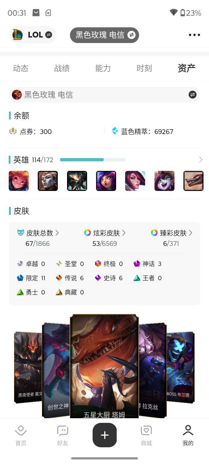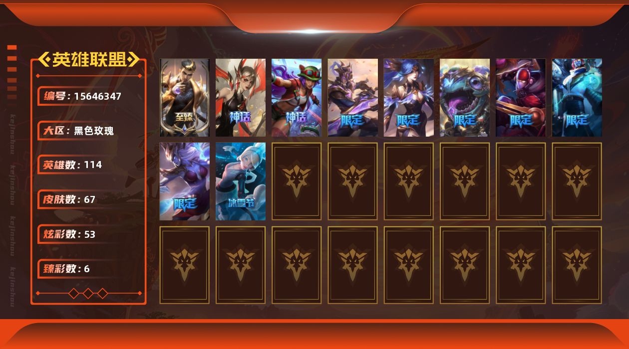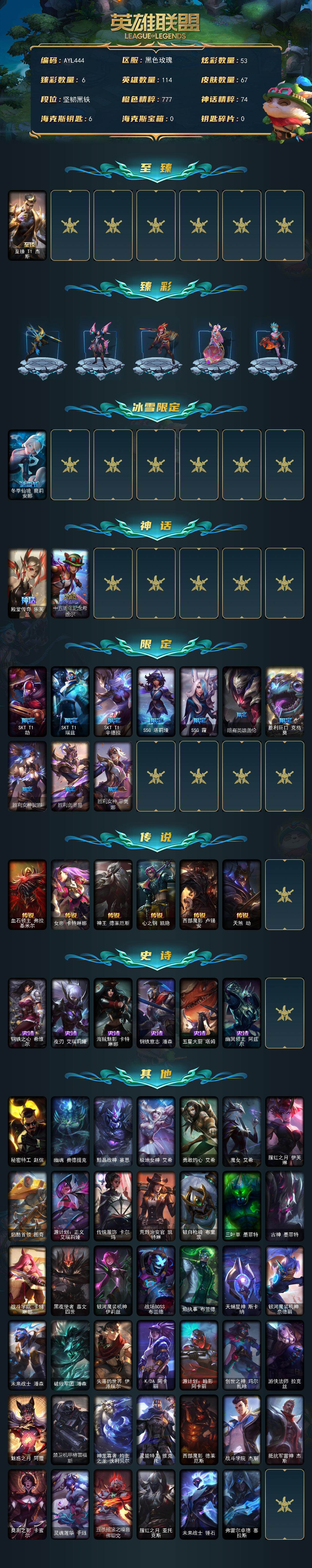 [15646347]【店主推荐捡漏号】未定级段位-114英雄-67皮肤-53炫彩-0终极-3神话-11限定-6传说-6史诗