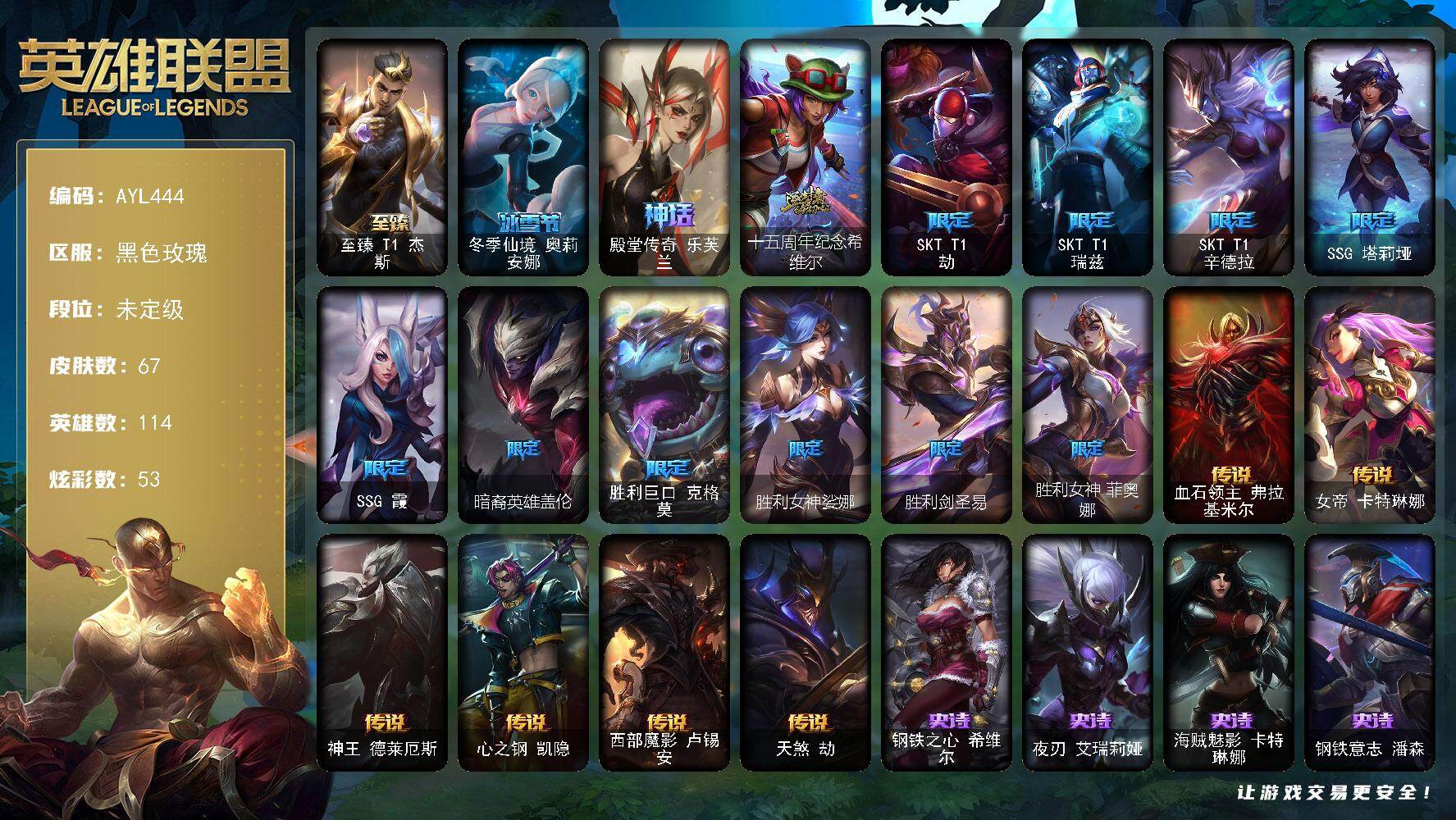 [15646347]【店主推荐捡漏号】未定级段位-114英雄-67皮肤-53炫彩-0终极-3神话-11限定-6传说-6史诗 【至臻皮肤】:至臻T1杰斯 【臻彩皮肤】:冠军之矛卡莉丝塔凯旋圣装,弹幕天使卡莎炽天使勇敢,黎明使者锐雯黑夜使者,星之守护者萨勒芬妮未来之光,灵魂莲华锐雯流火,殿堂传奇乐芙兰登神 【冰雪限定】:冬季仙境奥莉安娜 【神话皮肤】:殿堂传奇乐芙兰,十五周年纪念希维尔 【限定皮肤】:SKTT1劫,SKTT1瑞兹,SKTT1辛德拉,SSG塔莉垭,SSG霞,暗裔英雄盖伦,胜利巨口克格莫,胜利女神娑娜,胜利剑圣易,胜利女神菲奥娜 【传说皮肤】:血石领主弗拉基米尔,女帝卡特琳娜,神王德莱厄斯,心之钢凯隐,西部魔影卢锡安,天煞劫 【史诗皮肤】:钢铁之心希维尔,夜刃艾瑞莉娅,海贼魅影卡特琳娜,钢铁意志潘森,五星大厨塔姆,幽冥领主阿兹尔 【其他皮肤1】:秘密特工赵信,幽魂费德提克,黯晶战神赛恩,极地女神艾希,勇敢的心艾希,魔女艾希,腥红之月伊芙琳,奶酪首领图奇,源计划正义艾瑞莉娅,传统服饰卡尔玛,荒野治安官凯特琳,银白枪骑布里茨,三叶草墨菲特,古神墨菲特,战斗学院卡特琳娜,黑夜使者嘉文四世,银河魔装机神伊莉丝,战场BOSS布兰德,焰执事布兰德,天蝎星神斯卡纳,银河魔装机神奈德丽,未来战士潘森,破败军团潘森,失落的世界伊泽瑞尔,KDA阿卡丽,源计划暗影阿卡丽,创世之神玛尔扎哈,游侠法师拉克丝,魅惑之月阿狸,禁卫机甲格雷福斯,神龙尊者均衡之龙沃利贝尔,灵能特工维克托,西部魔影德莱厄斯,战斗学院杰斯,抵抗军雷神杰斯,莫测之影卡蜜尔,灵魂莲华千珏,五杀摇滚之噪音佛耶戈,腥红之月亚托克斯,未来战士锤石,弗雷尔卓德塞拉斯