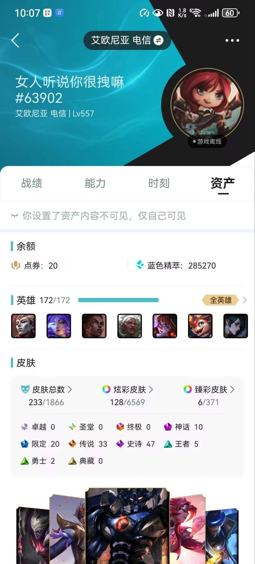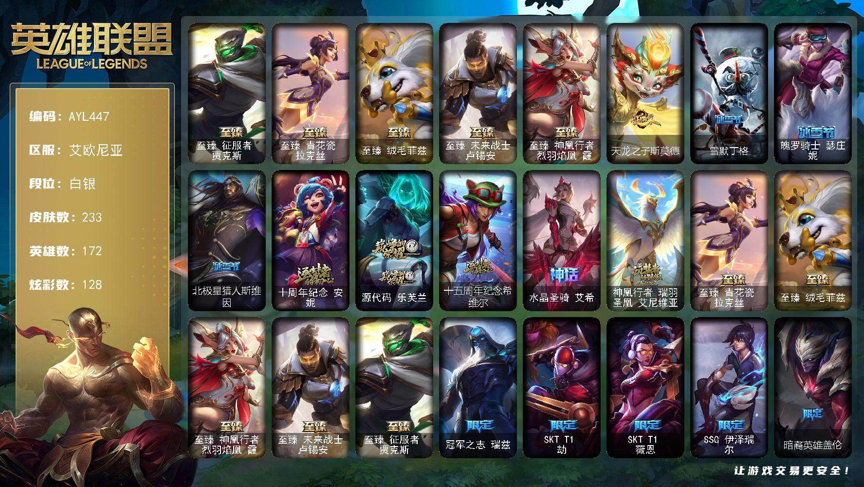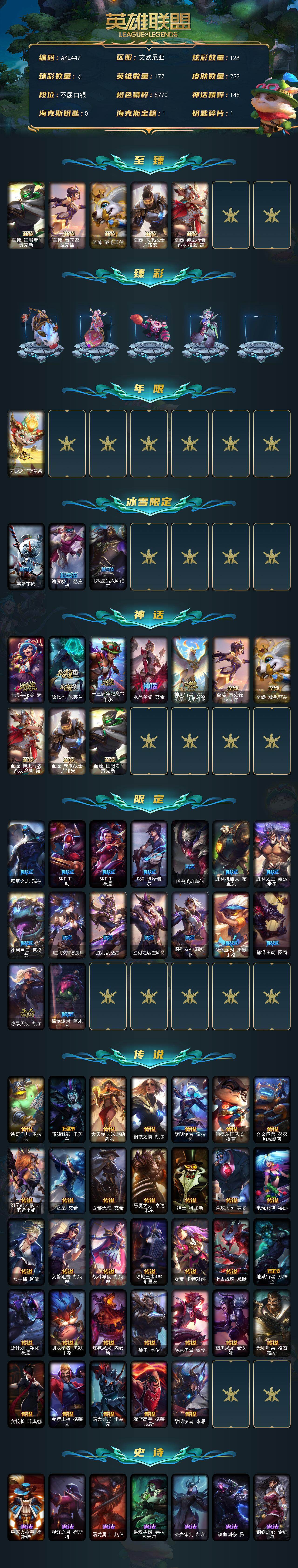 [15646498]【特价出售/店主推荐】白银段位-172英雄-233皮肤-128炫彩-0终极-10神话-20限定-33传说-47史诗