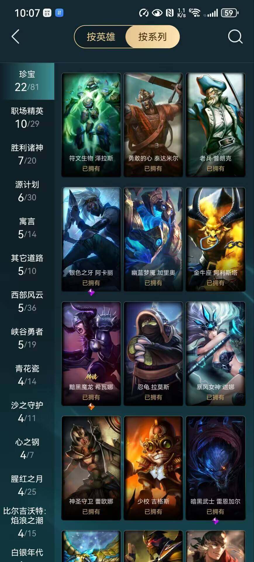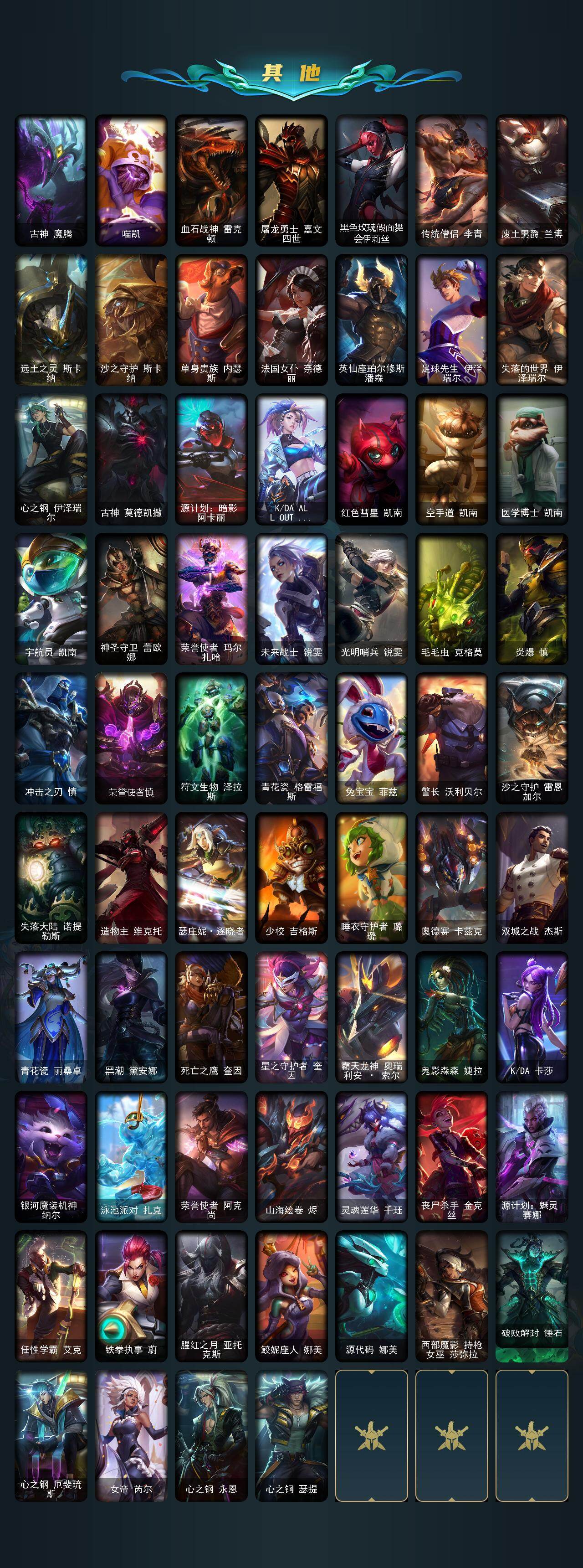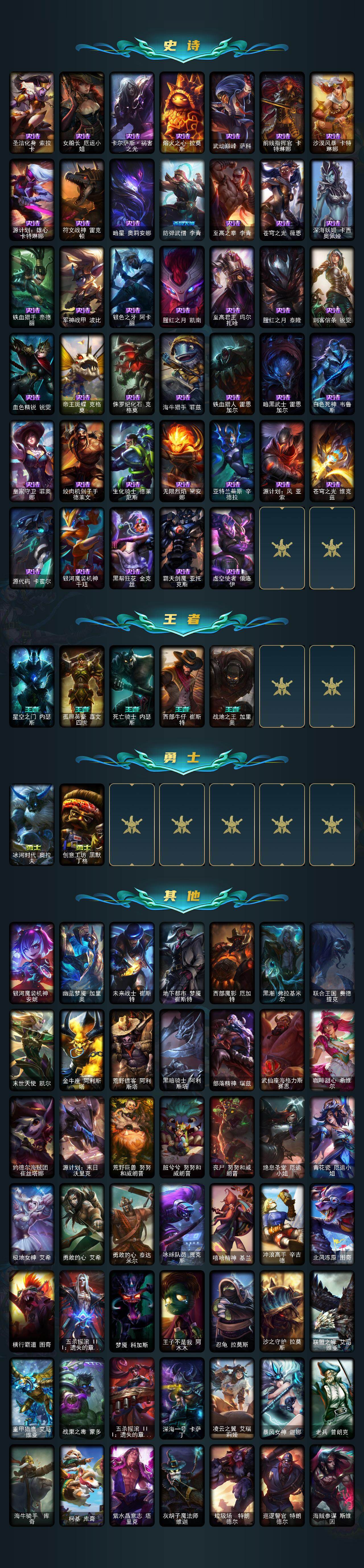 【史诗皮肤】:皇家火枪手崔斯特,腥红之月崔斯特,屠龙勇士赵信,摄魂男爵弗拉基米尔,圣光审判凯尔,铁血剑豪易,钢铁之心希维尔,圣洁化身索拉卡,女船长厄运小姐,卡尔萨斯祸害之光,熔火之心拉莫斯,武动巅峰萨科,前线指挥官卡特琳娜,沙漠风暴卡特琳娜,源计划雄心卡特琳娜,符文战神雷克顿,暗星奥莉安娜,防弹武僧李青,至高之拳李青,苍穹之光薇恩,深海妖姬卡西奥佩娅,铁血猎手奈德丽,军神战甲波比,银色之牙阿卡丽,腥红之月凯南,至高君王玛尔扎哈,腥红之月泰隆,刺客信条锐雯,血色精锐锐雯,帝王斑蝶克格莫,侏罗纪化石克格莫,海牛猎手菲兹,铁血猎人雷恩加尔,暗黑