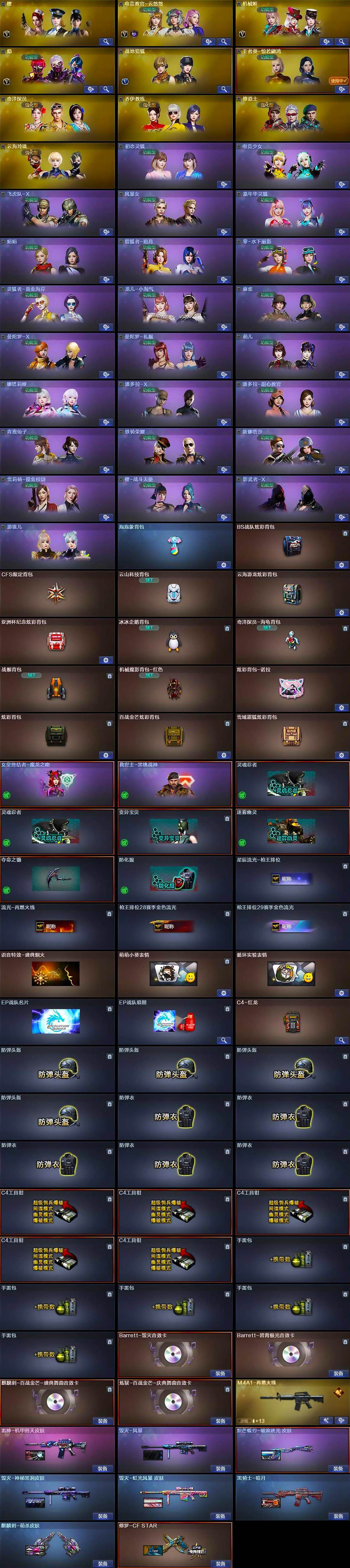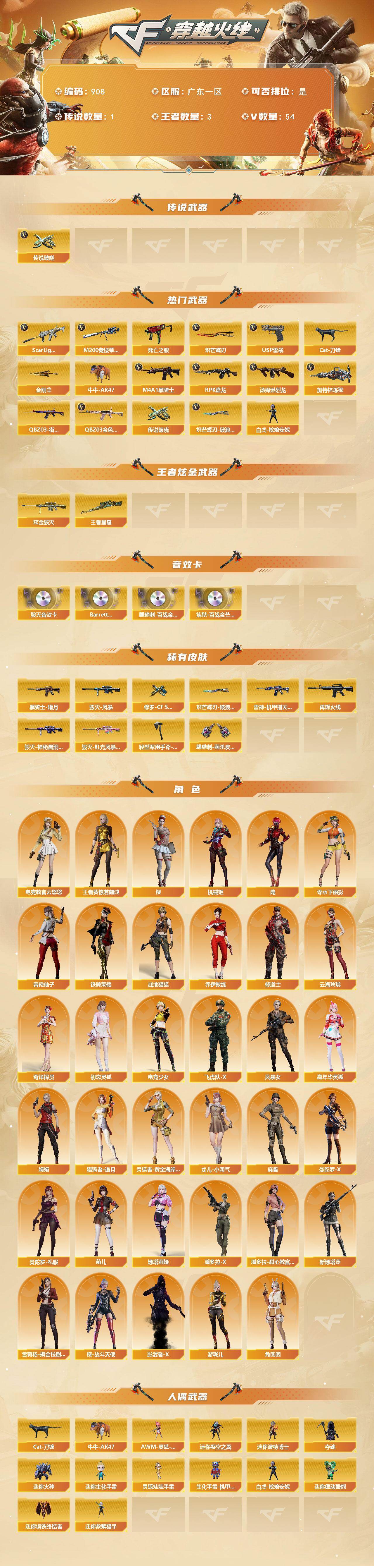- [15249136]广东一区-41V-6王者-2炫金 【热门武器】:QBZ03-金色蔷薇,HK417-朱雀,M200-竞技荣光,荣耀世冠-雷神,白虎-电玩蓝兔,M4A1-黑骑士,加特林-炼狱,USP-雷暴 【王者炫金武器】:王者龙血,炫金武士,炫金修罗 【音效卡】:M4A1-黑骑士音效卡 【皮肤】:火麒麟-平天大圣,火麒麟-百城,火麒麟-心动糖果,战神-粉色甜心皮肤,战神-流金岁月皮肤*2,AK47-B-常胜将军-曹操,AK47-B-常胜将军-刘备*2,AK47-B-常胜将军-孙权,麒麟刺-萌杀皮肤 【角色】:电竞教官-云悠悠,蛇隐宗,奇洋探员,暗夜-X,初恋灵狐,芳心审判者,虎妞,嘉年华灵狐,娟娟,猎狐者-追月,0号玩家,零-水下丽影,曼陀罗-礼服,萌儿,潘多拉-X,青霞仙子,蛇姬,斯沃特-X,兔囡囡,维纳斯,新灵狐者,雪莉杨-摸金校尉,夜玫瑰-幻能朋克,夜玫瑰-宠粉,樱-战斗天使 【人偶武器】:M4A1-雷神-精英刀锋,AWM-灵狐-15周年嘉年华,海滩汪汪-巴雷特,COP-旗袍,迷你深渊冰龙,迷你牛魔王,迷你波特博士,夺魂,生化手雷-机甲核心*2,深渊终结者手雷*2,AK47-斯沃特,迷你超能女侍,迷你巨石泰坦-魔花研究所 【暴走生化】:超级对讲机 【挑战大师】:冰龙粉碎者-白马银枪*2,激光毁灭者III-白马银枪,神圣爆裂者-末日III*2 【英雄级武器】:AK47-麒麟,M4A1-雷神,M4A1-黑骑士,AN94-超新星,HK417-朱雀,无影-神兵利器,M4A1-玫瑰精灵,QBZ03-金色蔷薇,王者之戮-觉醒版*2,AK-47-猩红传说*6,王者冰魄-觉醒版,王者龙血-觉醒版,白虎-电玩蓝兔,荣耀世冠-雷神,M200-竞技荣光,加特林-炼狱,悦蓝-惊涛骇浪-觉醒版,USP-雷暴,柯尔特-竞技荣光*2,麒麟刺*3,擎天-竞技荣光*4,高爆手雷-竞技荣光*3,闪光弹-竞技荣光,烟雾弹-竞技荣光*4,烟雾弹-古蛇迷踪 【道具】:超级背包,绿色巨人,灵魂忍者,变异宝贝,迷雾幽灵*2,夺命之镰,防化服*2,星辰流光-枪王排位,枪王排位28赛季金色流光,枪王排位29赛季金色流光,语音特效-机器人,电玩兔兔表情,斯沃特表情,EP战队名片,防弹头盔*3,防弹衣*3,C4工具钳*3,手雷包*3 【特殊枪械】:1黑骑士,1炼狱