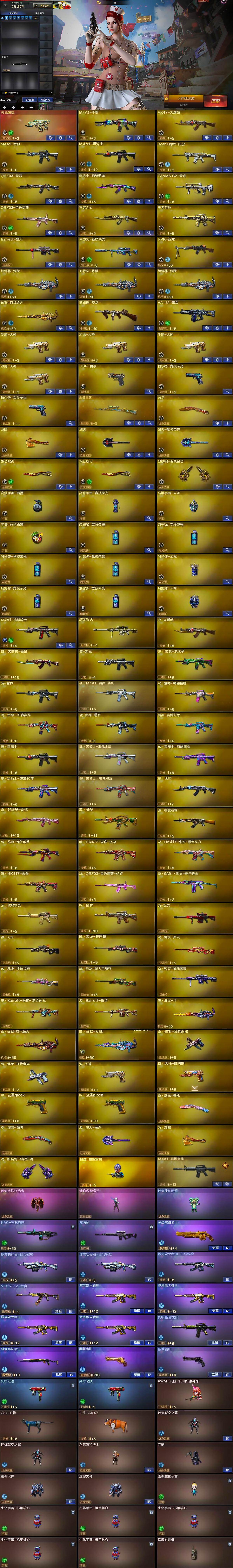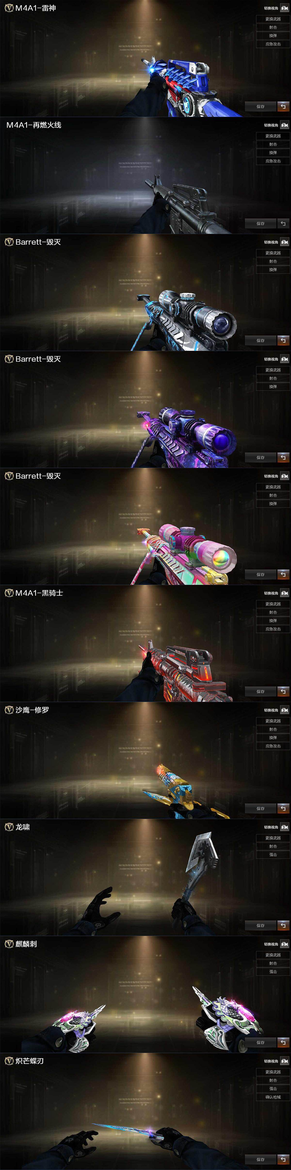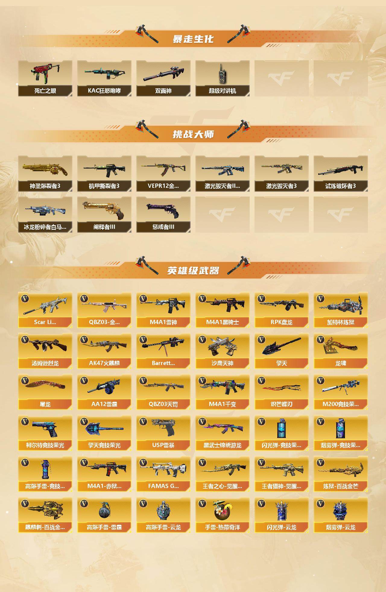 【英雄级武器】:M4A1-千变,AK47-火麒麟,M4A1-雷神,M4A1-黑骑士,Scar Light-白虎,QBZ03-天罚,黑武士-锦绣游龙,FAMAS G2-天戎,QBZ03-金色蔷薇,王者之心-觉醒版,王者猎神-觉醒版,Barrett-毁灭,M200-竞技荣光,RPK-盘龙,加特林-炼狱*3,炼狱-百战金芒,汤姆逊-烈龙,AA-12-雷霆,沙鹰-天神*