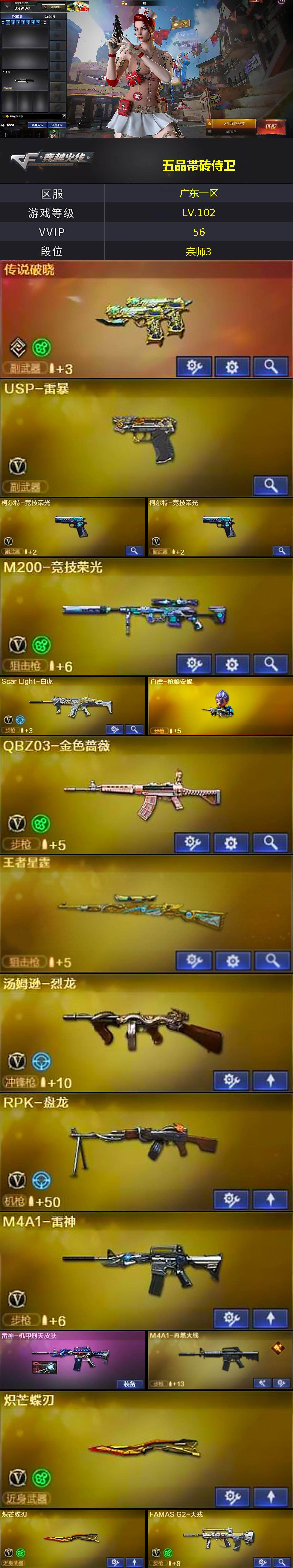 [15646501]广东一区-54V-3王者-1炫金 【传说武器】:传说破晓 【热门武器】:传说破晓,QBZ03-金色蔷薇,Scar Light-白虎,M200-竞技荣光,死亡之眼*2,QBZ03-街机,Cat-刀锋,牛牛-AK47,M4A1-黑骑士,汤姆逊-烈龙,RPK-盘龙,加特林-炼狱*3,白虎-枪娘安妮,USP-雷暴,炽芒蝶刃*2,炽芒蝶刃-破浪逐光 皮肤,金刚伞 【王者炫金武器】:王者星霆,炫金毁灭 【音效卡】:Barrett-毁灭音效卡,Barrett-碧霄极光音效卡,麒麟刺-百战金芒-盛典舞曲音效卡,炼狱-百战金芒-庆典舞曲音效卡 【皮肤】:雷神-机甲刑天皮肤,M4A1-再燃火线,毁灭-风暴,毁灭-神秘黑洞皮肤,毁灭-虹光风暴 皮肤,黑骑士-暗月,修罗-CF STAR,轻型军用手斧-再燃火线,麒麟刺-萌杀皮肤,炽芒蝶刃-破浪逐光 皮肤 【角色】:樱,电竞教官-云悠悠,机械姬,隐,战地猎狐,王者葵-惊若翩鸿,奇洋探员,乔伊教练,修道士,云海玲珑,初恋灵狐,电竞少女,飞虎队-X,风暴女,嘉年华灵狐,娟娟,猎狐者-追月,零-水下丽影,灵狐者-黄金海岸,龙儿-小淘气,麻雀,曼陀罗-X,曼陀罗-礼服,萌儿,娜塔莉娅,潘多拉-X,潘多拉-甜心教官,青霞仙子,铁骑荣耀,兔囡囡,新娜塔莎,雪莉杨-摸金校尉,樱-战斗天使,影武者-X,游珑儿 【人偶武器】:白虎-枪娘安妮,迷你钢铁终结者,迷你救赎猎手,迷你律动酷熊,AWM-灵狐-15周年嘉年华,Cat-刀锋,牛牛-AK47,迷你裂空之翼*2,迷你波特博士,夺魂,迷你火种*2,迷你生化手雷,生化手雷-机甲核心*5,灵狐娃娃手雷 【暴走生化】:KAC-狂怒咆哮,双面神,死亡之眼*2,超级对讲机 【挑战大师】:神圣爆裂者III,冰龙粉碎者-白马银枪*2,激光毁灭者III-白马银枪,VEPR-12-金魔,激光毁灭者III*4,机甲撕裂者III,试炼破坏者III,阐释者III,惩戒者III 【英雄级武器】:M4A1-千变,AK47-火麒麟,M4A1-雷神,M4A1-黑骑士,Scar Light-白虎,QBZ03-天罚,黑武士-锦绣游龙,FAMAS G2-天戎,QBZ03-金色蔷薇,王者之心-觉醒版,王者猎神-觉醒版,Barrett-毁灭,M200-竞技荣光,RPK-盘龙,加特林-炼狱*3,炼狱-百战金芒,汤姆逊-烈龙,AA-12-雷霆,沙鹰-天神*