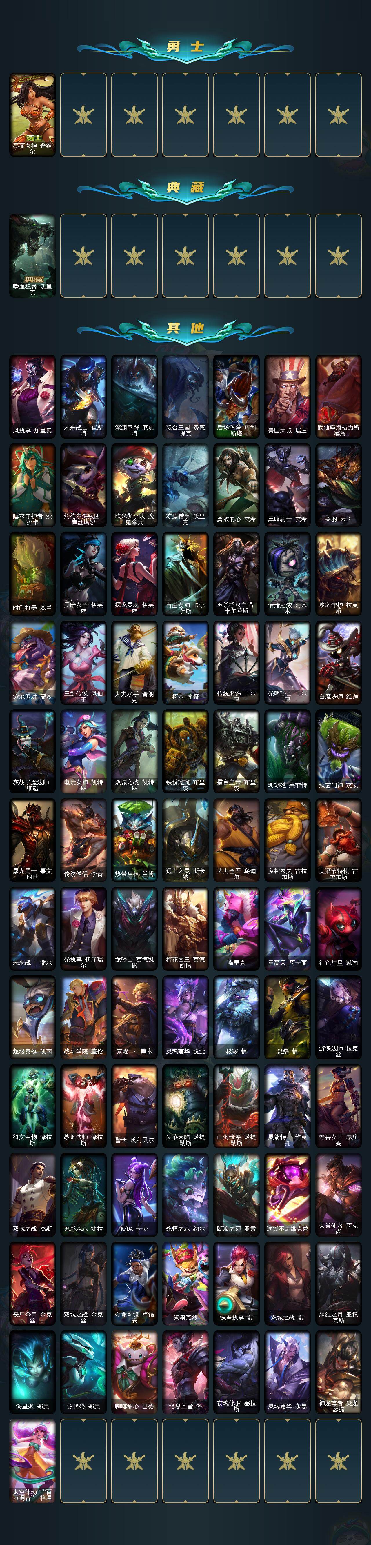 【其他皮肤1】:风执事加里奥,未来战士崔斯特,深渊巨蟹厄加特,联合王国费德提克,后场堡垒阿利斯塔,美国大叔瑞兹,武仙座海格力斯赛恩,睡衣守护者索拉卡,约德尔海贼团崔丝塔娜,欧米伽小队魔鬼伞兵,冻原猎手沃里克,勇敢的心艾希,黑暗骑士艾希,关羽云长,时间机器基兰,黑暗女王伊芙琳,探戈灵魂伊芙琳,自由女神卡尔萨斯,五杀摇滚主唱卡尔萨斯,情绪摇滚阿木木,沙之守护拉莫斯,泳池派对蒙多,玉剑传说风仙子,大力水手普朗克,柯基库奇,传统服饰卡尔玛,光明骑士卡尔玛,白魔法师维迦,灰胡子魔法师维迦,