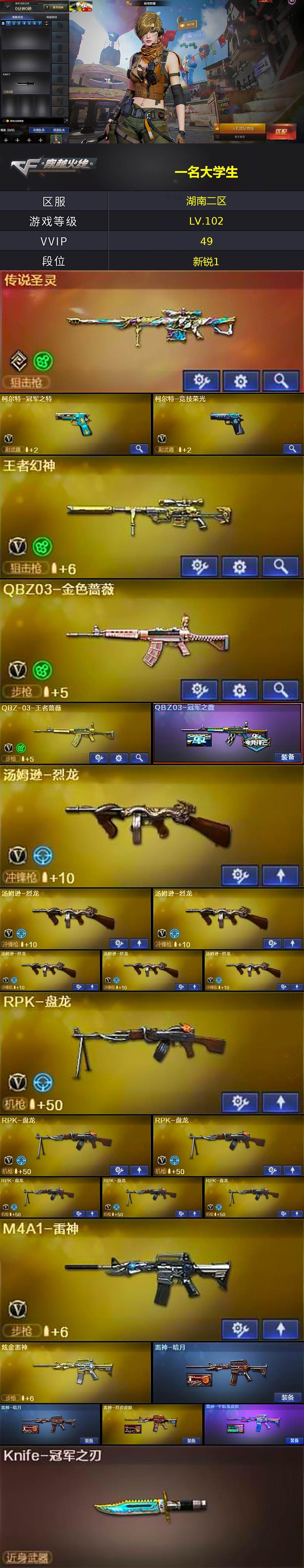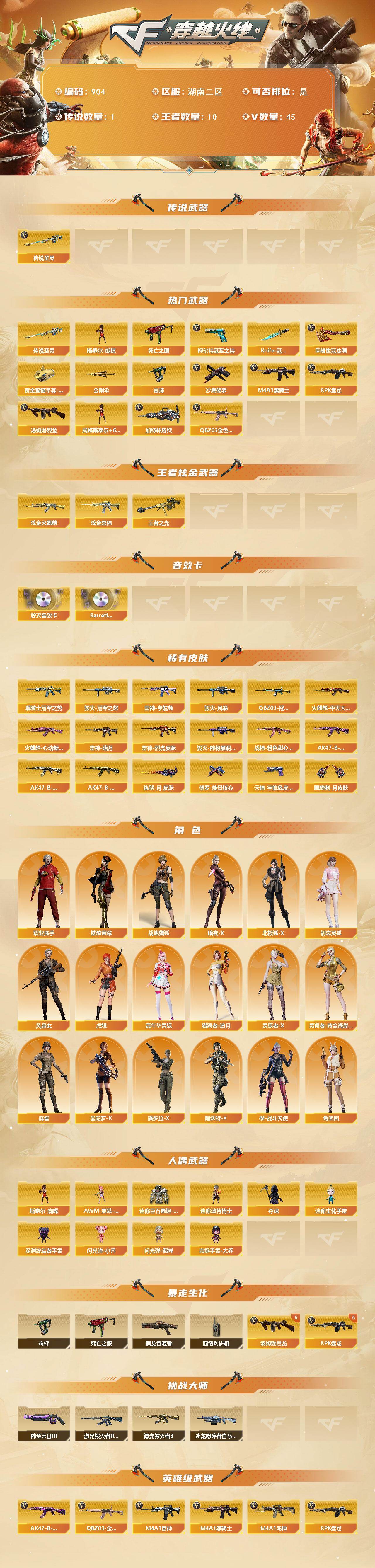 [15646685]湖南二区-45V-10王者-2炫金 【传说武器】:传说圣灵 【热门武器】:传说圣灵,QBZ03-金色蔷薇,死亡之眼,柯尔特-冠军之特,毒蜂,M4A1-黑骑士,汤姆逊-烈龙*6,RPK-盘龙*6,加特林-炼狱,斯泰尔-蝴蝶,沙鹰-修罗*2,Knife-冠军之刃,荣耀世冠-龙啸,黄金猫猫手套-白鲨,金刚伞 【王者炫金武器】:王者之光,炫金火麒麟,炫金雷神 【音效卡】:Barrett-毁灭音效卡,Barrett-碧霄极光音效卡 【皮肤】:QBZ03-冠军之薇,雷神-暗月*2,雷神-烈虎皮肤,雷神-宇航兔皮肤,火麒麟-平天大圣,火麒麟-心动糖果,毁灭-冠军之怒,毁灭-风暴,毁灭-神秘黑洞皮肤,黑骑士-冠军之势,战神-粉色甜心皮肤,AK47-B-常胜将军-曹操,AK47-B-常胜将军-刘备,AK47-B-常胜将军-孙权,炼狱-月 皮肤,修罗-能量核心,天神-宇航兔皮肤,麒麟刺-月皮肤 【角色】:战地猎狐,暗夜-X,北极狐-X,初恋灵狐,风暴女*2,虎妞,嘉年华灵狐,猎狐者-追月,灵狐者-X,灵狐者-黄金海岸,麻雀,曼陀罗-X,潘多拉-X,斯沃特-X,铁骑荣耀,兔囡囡,樱-战斗天使,职业选手 【人偶武器】:斯泰尔-蝴蝶,AWM-灵狐-15周年嘉年华,迷你波特博士,夺魂,迷你生化手雷,深渊终结者手雷,闪光弹-小乔,闪光弹-貂蝉,高爆手雷-大乔,迷你巨石泰坦-魔花研究所 【暴走生化】:毒蜂,黑龙吞噬者,死亡之眼,超级对讲机 【挑战大师】:冰龙粉碎者-白马银枪,激光毁灭者III-白马银枪,激光毁灭者III*4,神圣爆裂者-末日III 【英雄级武器】:AK47-火麒麟,M4A1-雷神,M4A1-黑骑士,M4A1-死神,AK47-黑武士,AK12-天启,AN94-超新星,无影-神兵利器,QBZ03-金色蔷薇,黑骑士-海王,AK47-B-常胜将军,QBZ-03-王者蔷薇-觉醒版,Barrett-毁灭,Barrett-朱雀,王者幻神-觉醒版,RPK-盘龙*6,加特林-炼狱,汤姆逊-烈龙*6,沙鹰-修罗*2,沙鹰-天神*3,柯尔特-冠军之特,柯尔特-竞技荣光,屠龙,麒麟刺,擎天-竞技荣光,荣耀世冠-龙啸,王者之啸-觉醒版,王者之击-觉醒版,高爆手雷-竞技荣光,闪光弹-竞技荣光,闪光弹-雷霆王者-觉醒版*2,烟雾弹-竞技荣光,烟雾弹-雷霆王者-觉醒版,M4A1-赤狱骑士 【道具】:BS战队炫彩