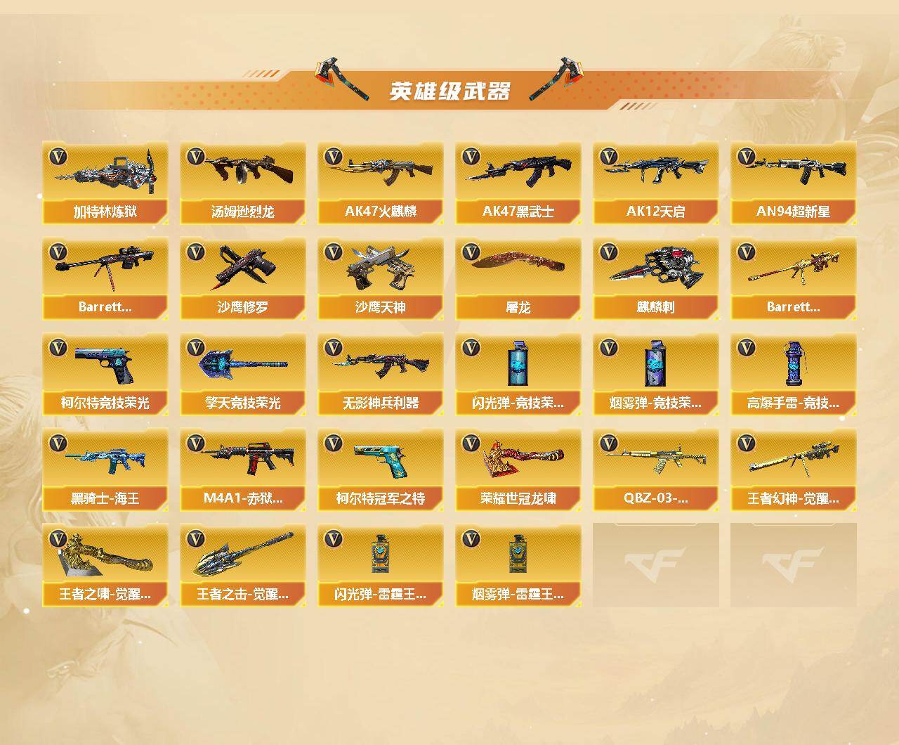 【英雄级武器】:AK47-火麒麟,M4A1-雷神,M4A1-黑骑士,M4A1-死神,AK47-黑武士,AK12-天启,AN94-超新星,无影-神兵利器,QBZ03-金色蔷薇,黑骑士-海王,AK47-B-常胜将军,QBZ-03-王者蔷薇-觉醒版,Barrett-毁灭,Barrett-朱雀,王者幻神-觉醒版,RPK-盘龙*6,加特林-炼狱,汤姆逊-烈龙*6,沙鹰-修罗*2,沙鹰-天神*3,柯尔特-冠军之特,柯尔特-竞技荣光,屠龙,麒麟刺,擎天-竞技荣光,荣耀世冠-龙啸,王者之啸-觉醒版,王者之击-觉醒版,高爆手雷-竞技荣光,闪光弹-竞技荣光,闪光弹-雷霆王者-觉醒版*2,烟雾弹-竞技荣光,烟雾弹-雷霆王者-觉醒版,M4A1-赤狱骑士