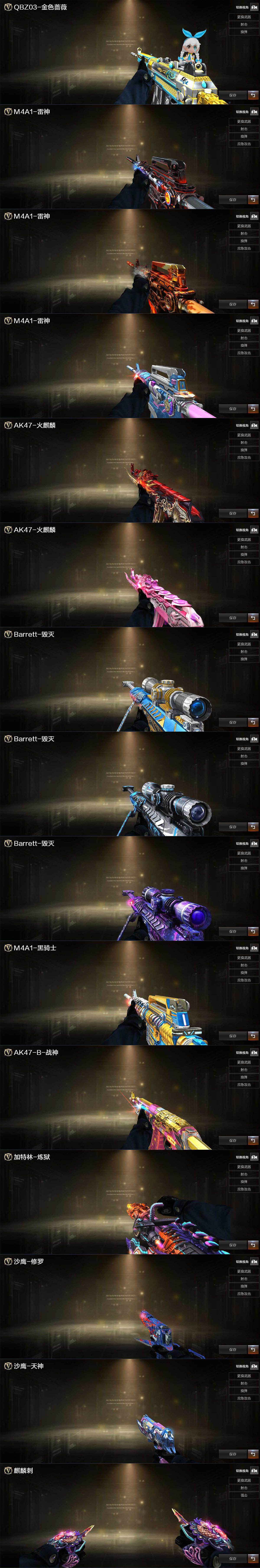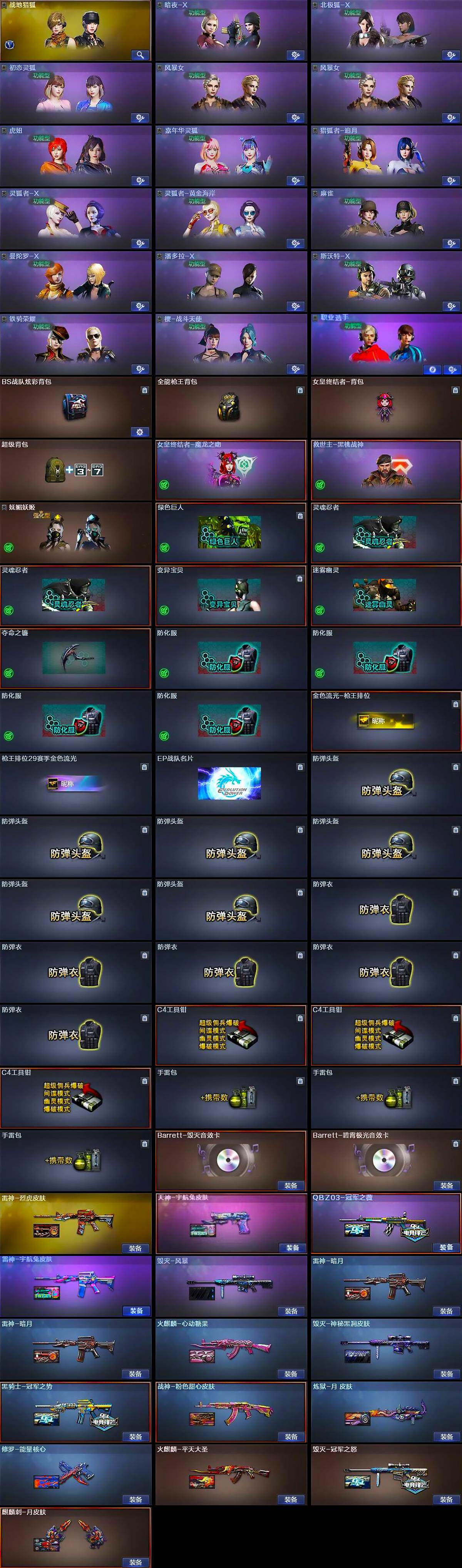 【皮肤】:QBZ03-冠军之薇,雷神-暗月*2,雷神-烈虎皮肤,雷神-宇航兔皮肤,火麒麟-平天大圣,火麒麟-心动糖果,毁灭-冠军之怒,毁灭-风暴,毁灭-神秘黑洞皮肤,黑骑士-冠军之势,战神-粉色甜心皮肤,AK47-B-常胜将军-曹操,AK47-B-常胜将军-刘备,AK47-B-常胜将军-孙权,炼狱-月 皮肤,修罗-能量核心,天神-宇航兔皮肤,麒麟刺-月皮肤