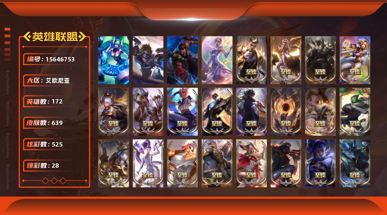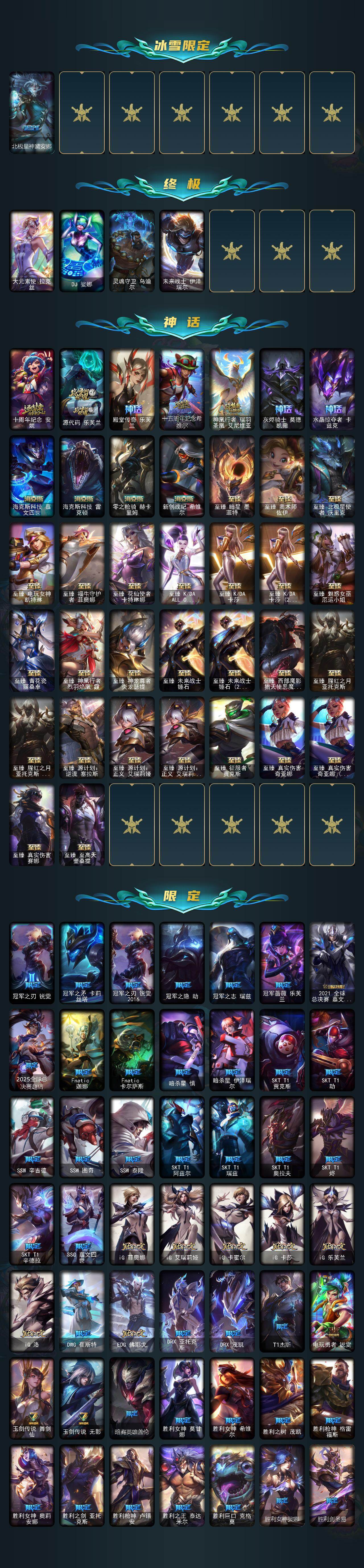 【至臻皮肤】:至臻北极星使者沃里克,至臻魅惑女巫厄运小姐,至臻征服者贾克斯,至臻源计划正义艾瑞莉娅,至臻源计划:正义艾瑞莉娅(2022),至臻电玩女神凯特琳,至臻暗星墨菲特,至臻花仙使者卡特琳娜,至臻暗裔英雄嘉文四世,至臻西部魔影猎天使恶魔泰隆,至臻福牛守护者菲奥娜,至臻T1杰斯,至臻青花瓷丽桑卓,至臻奥术师佐伊,至臻永恒星灵佐伊,至臻KDA卡莎,至臻KDAALLOUT卡莎,至臻KDA卡莎(2022),至臻真实伤害赛娜,至臻灵魂莲华劫,至臻真实伤害奇亚娜,至臻真实伤害奇亚娜(2022),至臻腥红之月亚托克斯,至臻腥红之月亚托克斯(2022),至臻未来战士锤石,至臻未来战士锤石(2022),至臻神凰行者烈羽焰凰霞,至臻源计划逆流塞拉斯,至臻T1塞拉斯,至臻神龙尊者炎龙瑟提,至臻至高天奎桑提