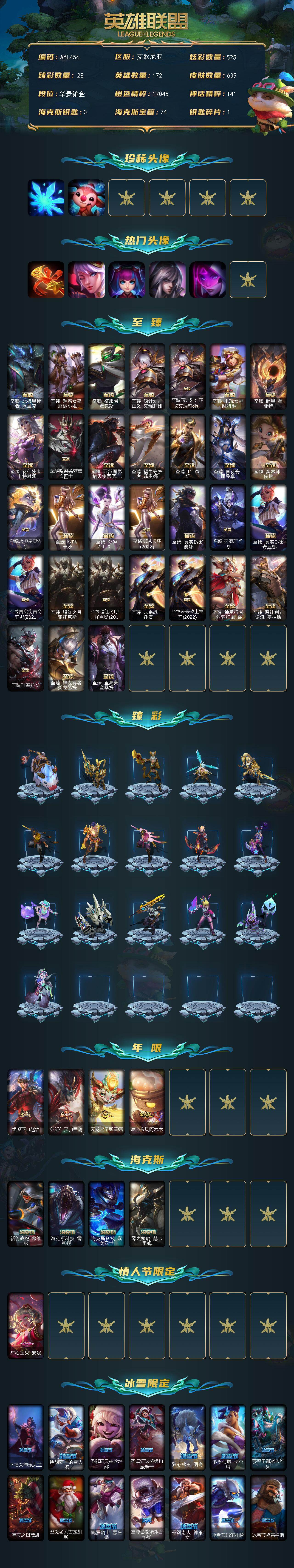 [15646753]【可二次特价出售/店主推荐】铂金段位-172英雄-639皮肤-525炫彩-4终极-42神话-108限定-68传说-109史诗