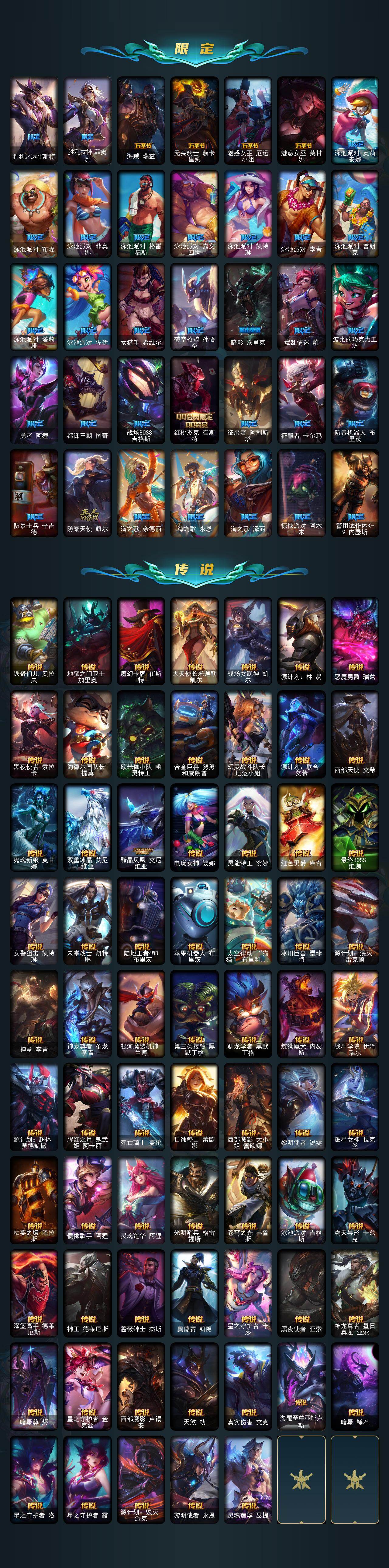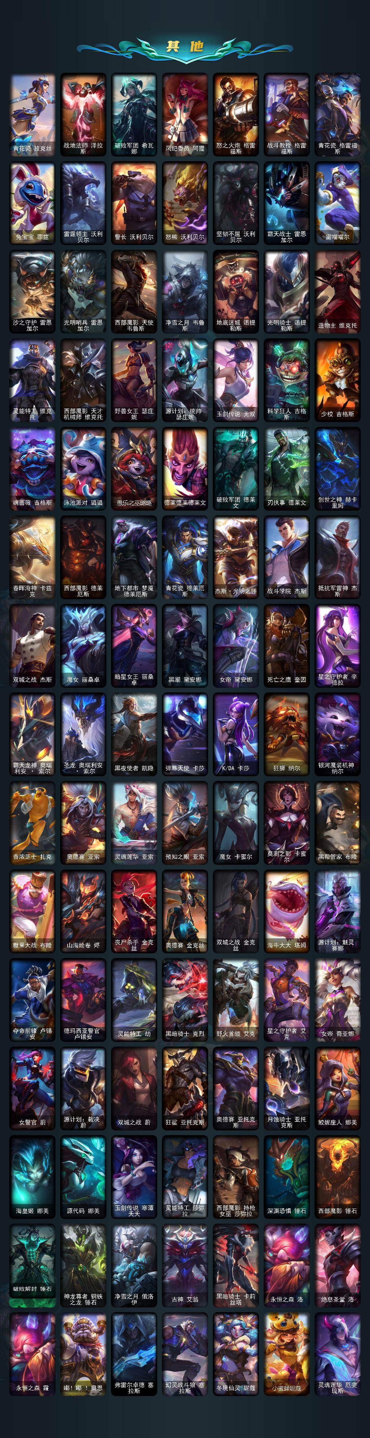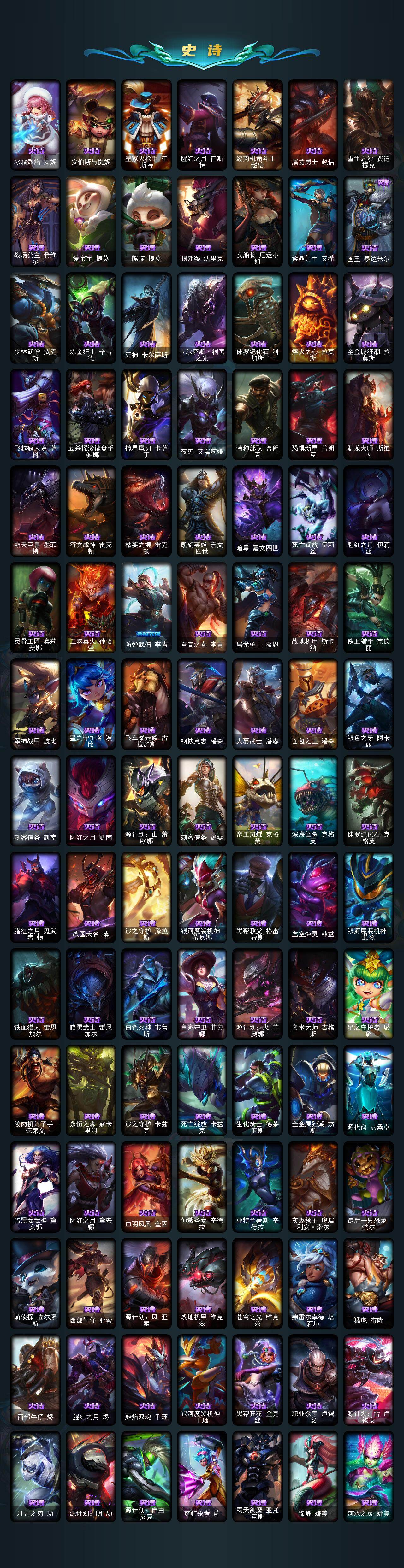 【臻彩皮肤】:天龙之子卡莎飞龙乘云,无畏骑士瑟庄妮赤子初心,吕布奉先炫金战神,替父从军花木兰炫金龙刃,冰霜之刃艾瑞莉娅炫金,赵云子龙炫金将军,墨之影武者亚索金墨耀影,玉剑传说无影莫问,神龙尊者圣龙李青龙腾云起,玉剑传说无影竞星,源计划联合艾希红莲之弓,星之守护者奥莉安娜未来之光,星之守护者金克丝黑洞,泳池派对奥莉安娜优雅珠光鲸,霸天巨兽雪崩墨菲特,霸天剑魔亚托克斯涤罪之翼,幻灵战斗兔锐雯梦幻强袭,最终BOSS维迦里大魔王,灵魂莲华亚索霜见之时,海之歌艾希冰爽浪花,殿堂传奇乐芙兰登神,星之守护者阿卡丽热情之光,魔女阿卡丽虚荣,净雪之月莫甘娜冬虹,黑夜使者嘉文四世白夜,心之钢伊泽瑞尔天纵才华,灌篮高手德莱厄斯金色神话