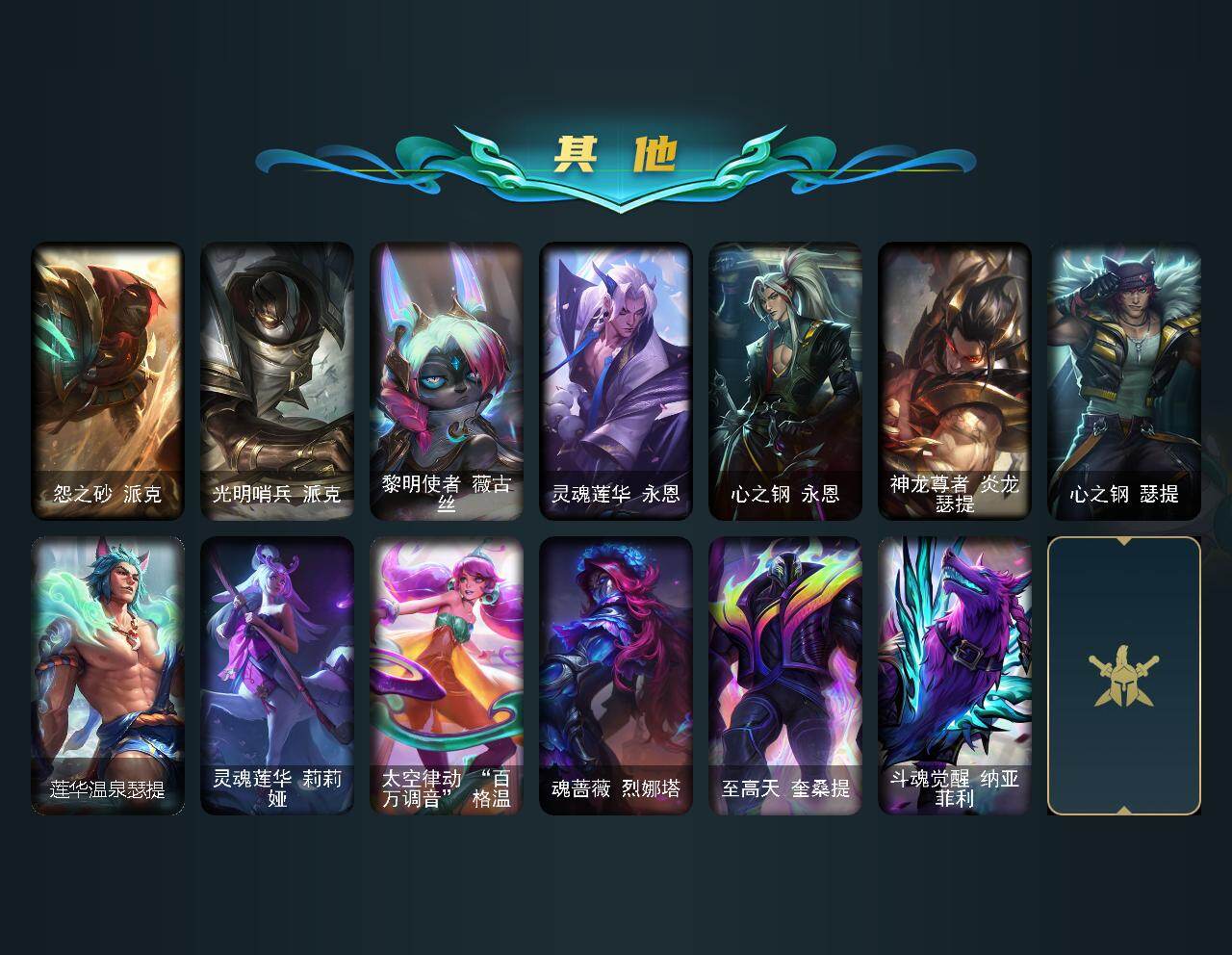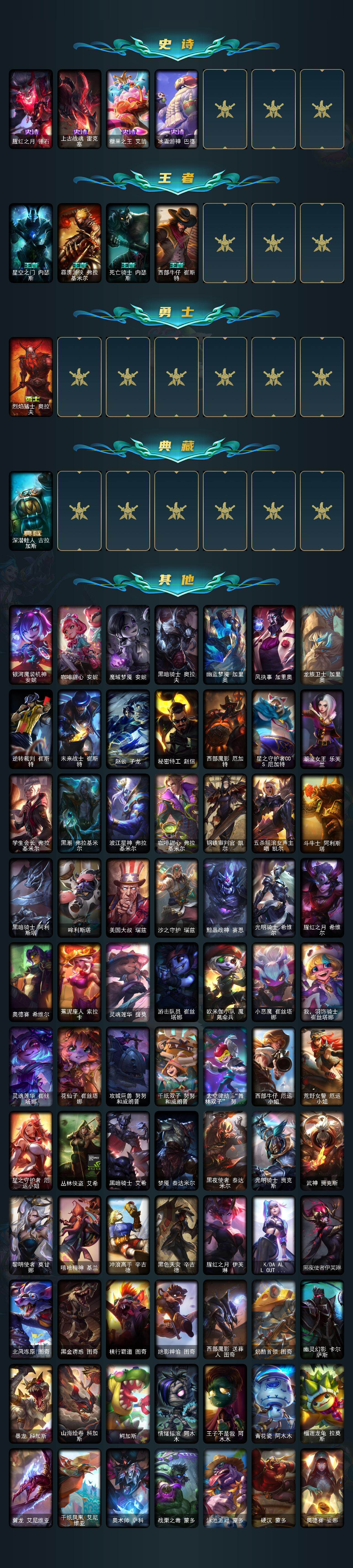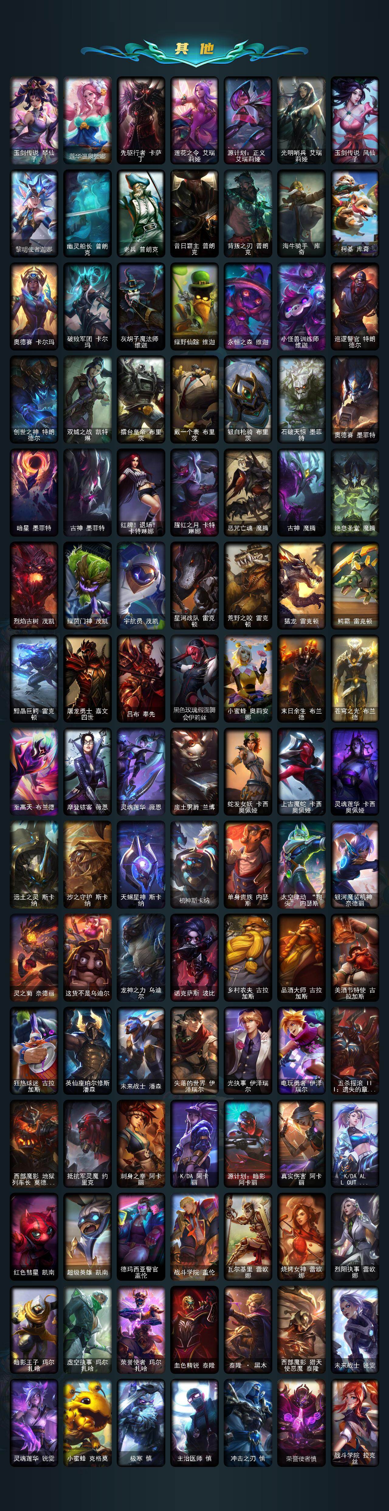 【臻彩皮肤】:天龙之子卡莎飞龙乘云,无畏骑士瑟庄妮赤子初心,吕布奉先炫金战神,替父从军花木兰炫金龙刃,冰霜之刃艾瑞莉娅炫金,赵云子龙炫金将军,墨之影武者亚索金墨耀影,玉剑传说无影莫问,神龙尊者圣龙李青龙腾云起,玉剑传说无影竞星,源计划联合艾希红莲之弓,星之守护者奥莉安娜未来之光,星之守护者金克丝黑洞,泳池派对奥莉安娜优雅珠光鲸,霸天巨兽雪崩墨菲特,霸天剑魔亚托克斯涤罪之翼,幻灵战斗兔锐雯梦幻强袭,最终BOSS维迦里大魔王,灵魂莲华亚索霜见之时,海之歌艾希冰爽浪花,殿堂传奇乐芙兰登神,星之守护者阿卡丽热情之光,魔女阿卡丽虚荣,净雪之月莫甘娜冬虹,黑夜使者嘉文四世白夜,心之钢伊泽瑞尔天纵才华,灌篮高手德莱厄斯金色神话