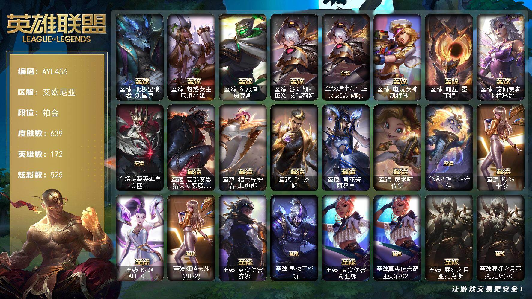 [15646753]【可二次特价出售/店主推荐】铂金段位-172英雄-639皮肤-525炫彩-4终极-42神话-108限定-68传说-109史诗 【珍稀头像】:雪花头像,至爱的鹿头像 【热门头像】:卡特琳娜的匕首头像,觅心之翼奎因头像,银河魔装机神安妮头像,玉剑传说无影头像,源计划刀妹头像 【至臻皮肤】:至臻北极星使者沃里克,至臻魅惑女巫厄运小姐,至臻征服者贾克斯,至臻源计划正义艾瑞莉娅,至臻源计划:正义艾瑞莉娅(2022),至臻电玩女神凯特琳,至臻暗星墨菲特,至臻花仙使者卡特琳娜,至臻暗裔英雄嘉文四世,至臻西部魔影猎天使恶魔泰隆,至臻福牛守护者菲奥娜,至臻T1杰斯,至臻青花瓷丽桑卓,至臻奥术师佐伊,至臻永恒星灵佐伊,至臻KDA卡莎,至臻KDAALLOUT卡莎,至臻KDA卡莎(2022),至臻真实伤害赛娜,至臻灵魂莲华劫,至臻真实伤害奇亚娜,至臻真实伤害奇亚娜(2022),至臻腥红之月亚托克斯,至臻腥红之月亚托克斯(2022),至臻未来战士锤石,至臻未来战士锤石(2022),至臻神凰行者烈羽焰凰霞,至臻源计划逆流塞拉斯,至臻T1塞拉斯,至臻神龙尊者炎龙瑟提,至臻至高天奎桑提 【臻彩皮肤】:天龙之子卡莎飞龙乘云,无畏骑士瑟庄妮赤子初心,吕布奉先炫金战神,替父从军花木兰炫金龙刃,冰霜之刃艾瑞莉娅炫金,赵云子龙炫金将军,墨之影武者亚索金墨耀影,玉剑传说无影莫问,神龙尊者圣龙李青龙腾云起,玉剑传说无影竞星,源计划联合艾希红莲之弓,星之守护者奥莉安娜未来之光,星之守护者金克丝黑洞,泳池派对奥莉安娜优雅珠光鲸,霸天巨兽雪崩墨菲特,霸天剑魔亚托克斯涤罪之翼,幻灵战斗兔锐雯梦幻强袭,最终BOSS维迦里大魔王,灵魂莲华亚索霜见之时,海之歌艾希冰爽浪花,殿堂传奇乐芙兰登神,星之守护者阿卡丽热情之光,魔女阿卡丽虚荣,净雪之月莫甘娜冬虹,黑夜使者嘉文四世白夜,心之钢伊泽瑞尔天纵才华,灌篮高手德莱厄斯金色神话 【年限皮肤】:猛虎下山赵信,剪纸仙灵加里奥,天龙之子斯莫德,点心宝贝阿木木 【海克斯皮肤】:新创战纪希维尔,海克斯科技雷克顿,海克斯科技嘉文四世,零之枪骑赫卡里姆 【情人节限定】:甜心宝贝安妮 【冰雪限定】:幸福女神乐芙兰,持胡萝卜的雪人易,圣诞精灵崔丝塔娜,圣诞狂欢努努和威朗普,狂心冰王图奇,冬季仙境卡尔玛,邪恶圣诞老人维迦,喜庆之树茂凯,圣诞老人古拉加斯,魄罗骑士瑟庄妮,雪球也能爆炸吉格斯,圣诞老人