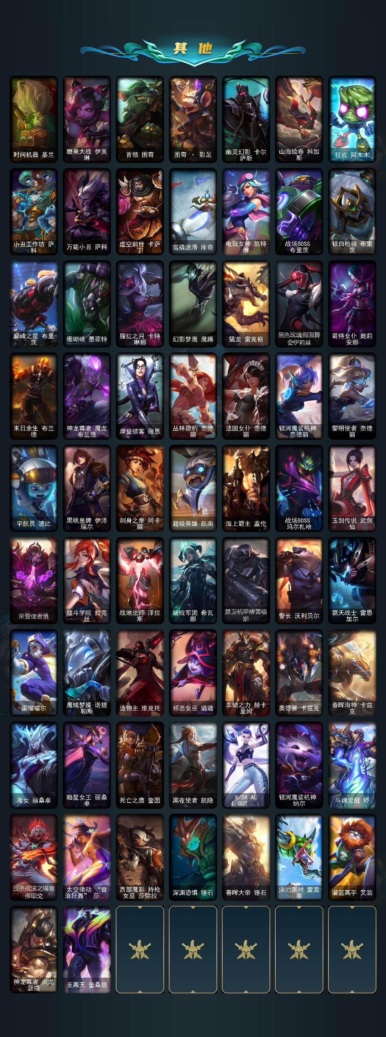 【年限皮肤】:你看见过我的熊猫吗安妮,替父从军花木兰,广寒仙子嫦娥,美猴王孙悟空,王国机神青龙德莱文,剪纸仙灵盖伦,天龙之子斯莫德,点心宝贝阿木木
