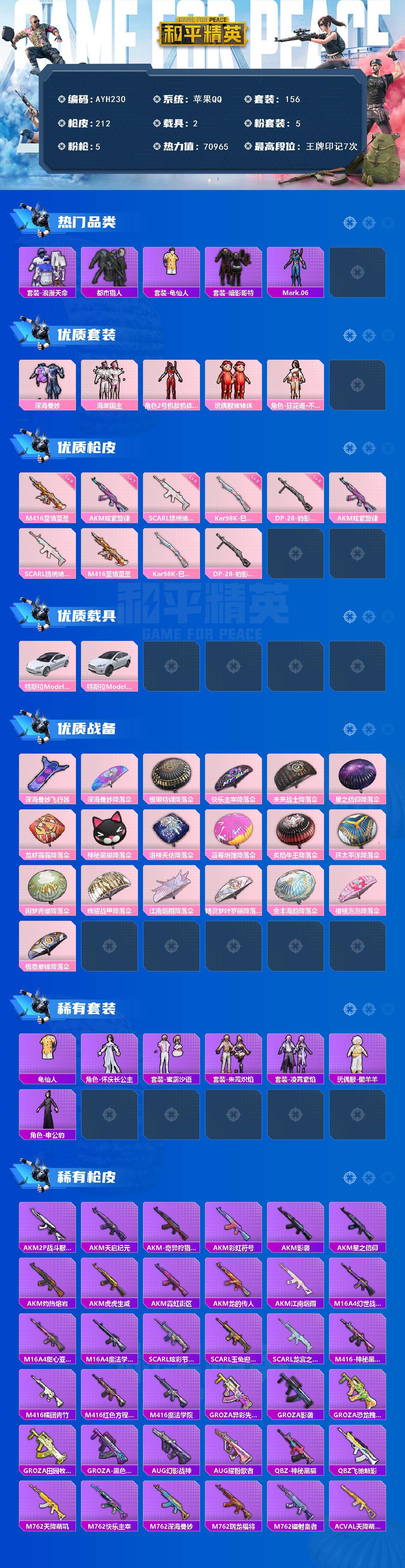 - [14887982]【店主推荐捡漏号!可直接换绑】苹果 手Q-3粉装-3特效枪-0载具-4粉色飞行器-35469热力值-6王牌印记-75套装-134枪皮 【热门品类】:套装-小丑鱼,套装-龟仙人 【粉色套装】:角色-智耀战神,粉装-幻彩电音,角色-异瞳寒姬 【粉色枪皮等级】:Kar98K-巳巳如意(五级),AMR-智耀战神(七级),DP-28-豹影疾电(五级) 【粉色枪皮】:Kar98K-巳巳如意,AMR-智耀战神,DP-28-豹影疾电 【粉色飞行器】:沙丘之主天马,龙翔九天飞行器,灵猫魔法师飞行器 【粉色降落伞】:星之彼岸降落伞,暗夜鎏金降落伞,沙丘之主降落伞,墨龙九天降落伞,智耀战神降落伞,幻彩电音降落伞,灵猫魔法师降落伞,异瞳寒姬降落伞 【稀有套装】:套装-龟仙人,套装-巳巳如意,套装-雪国风尚,角色-俏兔智灵,套装-燕燕于飞,套装-鱼渊荷华,套装-粉恋花,套装-紫幽梦,套装-蓝冰羽,角色-瑰梦爱神,套装-云朵鹅,套装-雪绒豹,角色-乐音,角色-绛羽幽主,套装-朱霞炽焰,套装-凌霄紫焰,套装-擎苍青焰,玩偶服-美羊羊,角色-绯色魅影,套装-炫彩糖果 【稀有枪皮】:AKM-破晓战魂,AKM-龙的传人,M16A4-蓝色火焰,SCAR-L-红色方程式,M416-糯团青竹,M416-蓝色火焰,GROZA-懵萌河马,AUG-甜蜜菠萝,AUG-耀粉歌者,AUG-月影灵韵,M762-第五大道,M762-云朵鹅,AC-VAL-天降萌叽,AC-VAL-快闪甜心,AC-VAL-六号稻草人,蜜獾-天降萌叽,蜜獾-绯穹魔姬,Famas-墨龙九天,ARX-凌霄紫焰,UZI-天降萌叽,UZI-月影灵韵,UMP45-生命誓言,UMP45-蓝色火焰,UMP45-绒宝小鹅,UMP45-极意拳锋,Vector-焰鹰斗篷,汤姆逊-耀粉歌者,野牛-沙丘之主,AKS-74U-鬼刀,JS9-凌霄紫焰,P90-快闪甜心,P90-巳巳如意,Kar98K-彩虹符号,Kar98K-红色方程式,AWM-焰鹰斗篷,AWM-圣堂之誓,SKS-迅猛狂鲨,VSS-彩虹符号,Mini14-耀粉歌者,Mk14-魔药课室,SLR-圣穹绘梦,SLR-墨龙九天,AMR-墨龙九天,MK20-H-快闪甜心,SVD-云朵鹅,SVD-冷漠罗丽,S686-生命誓言,S686-红色方程式,S686-巳巳如意,S12K-破晓战魂,S12K-智耀战神,DBS-焰鹰
