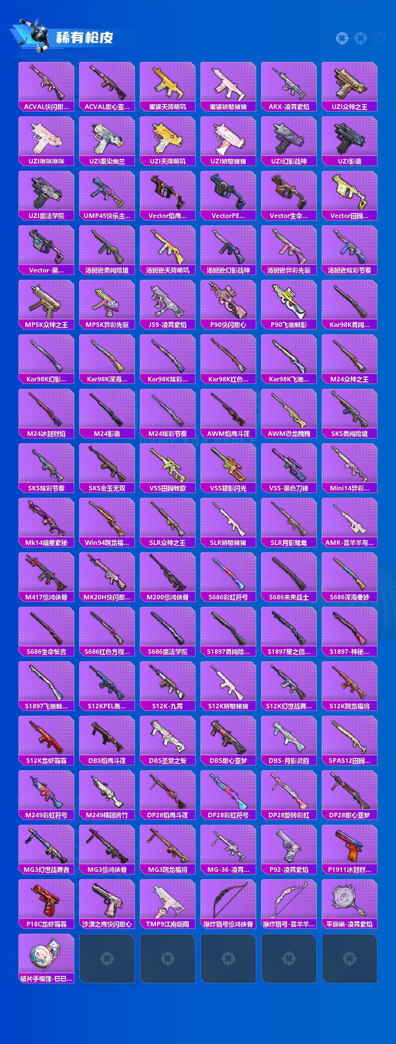 【稀有枪皮】:AKM-2P战斗服款,AKM-天启纪元,AKM-奇异狩猎者,AKM-彩虹符号,AKM-影袭,AKM-星之信仰,AKM-江南烟雨,AKM-灼热熔岩,AKM-虎虎生威,AKM-霓虹街区,AKM-龙的传人,M16A4-幻世战舞者,M16A4-甜心亚梦,M16A4-魔法学院,SCAR-L-炫彩节奏,SCAR-L-玉兔迎春,SCAR-L-龙宫之主,M416-神秘黑猫,M416-糯团青竹,M416-红色方程式,M416-魔法学院,GROZA-异彩先驱,GROZA-影袭,GROZA-恐龙拽拽,GROZA-田园牧歌,GROZA-黑色刀锋,AUG-幻影战神,AUG-耀粉歌者,QBZ-神秘黑猫,QBZ-飞驰魅影,M762-天降萌叽,M762-快乐主宰,M762-深海曼妙,M762-瑞龙福将,M762-镭射皇者,AC-VAL-天降萌叽,AC-VAL-快闪甜心,AC-VAL-甜心亚梦