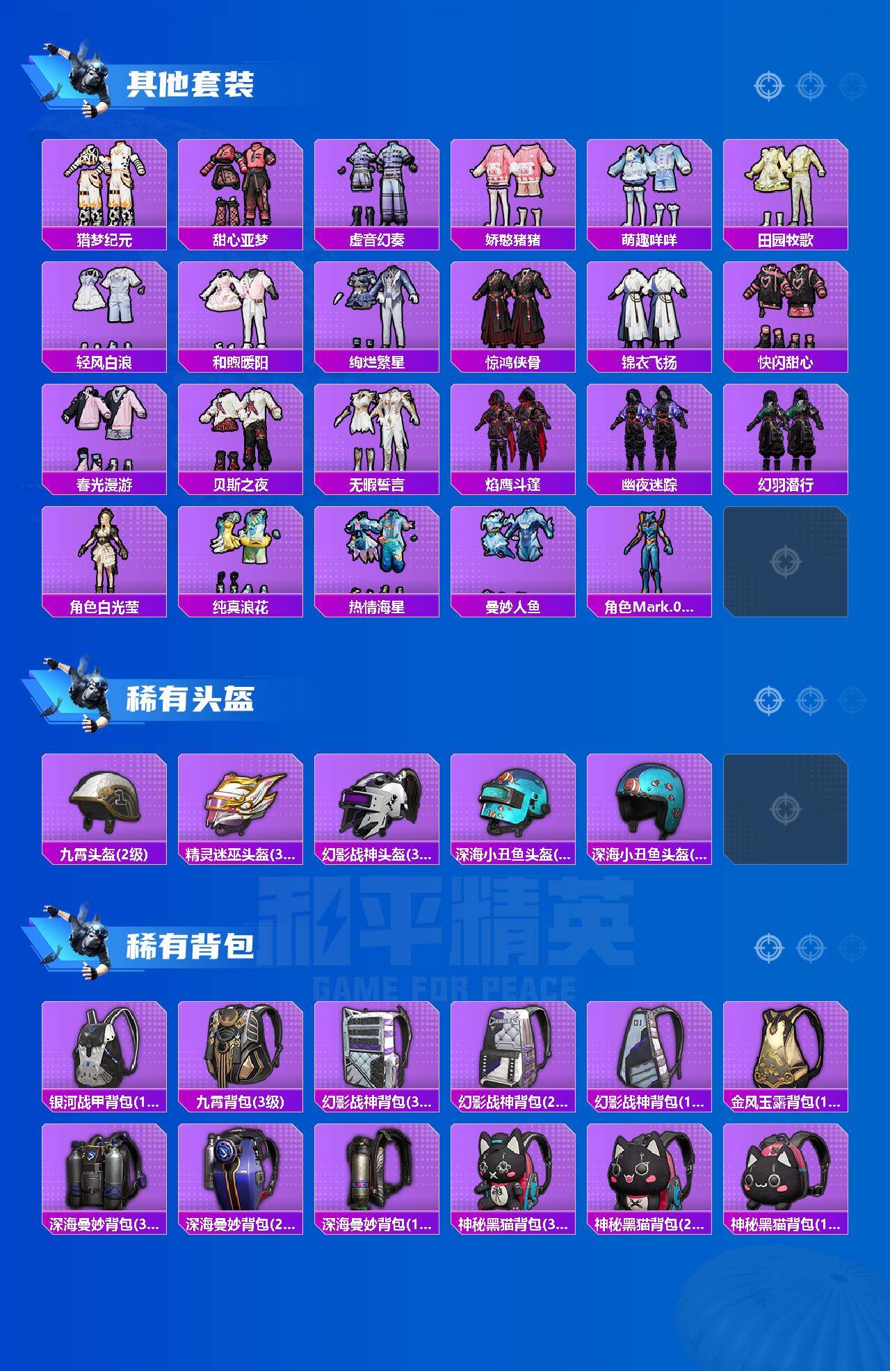 - [11599860]18粉装 6特效枪 4载具 4印记 可二次 可修改实名 连体王者 身法装备:萌熊伴侣背包(粉熊背包) 优质装备:兰博基尼Estoque(炫光金),玛莎拉蒂Ghibli(粉),特斯拉Roadster(水滴蓝),兰博基尼Aventador SVJ(翡翠绿),萌熊伴侣背包(粉熊背包),M762甜蜜誓约,SCAR-L梦幻火箭,AKM甜心宝贝,M416心之恋语,梦幻火箭(新101)(新火箭少女101粉色套装),蝶舞迷情,宝贝奶油派,天使彩虹糖,缤纷油彩(猪妹猪脸妹),甜蜜誓约,炙焰红王,冰霜白皇,迷蝶贵族,UZI绮梦青鸾,星之彼岸,UMP45相思残雪(UMP45-相思残雪),赛罗闪耀型(奥特曼),洛天依,七级M416-心之恋语 热门装扮:蜜桃特工,彩虹鹿灵,山涧鹿灵,吟月归客,齐天大圣,黄伞悠悠,神秘黑猫,胖达圆圆,潮萌小黄鸭,浪漫波比 载具:空客H135-蔚蓝之翼 五级特效枪:五级M762-甜蜜誓约 四级特效枪:四级SCAR-L-梦幻火箭,四级AKM-甜心宝贝,四级UMP45-相思残雪 三级特效枪:三级UZI-绮梦青鸾 紫色装扮:浪漫假日,冰川特警,北国孤狼,千禧之恋,赛罗奥特曼,梦起落英,青春冒险家,光影梦想家,潮流游乐家,SS15特训,蝎王蛇后,迪迦奥特曼,艾克斯奥特曼,梨园星光,欧布奥特曼,捷德奥特曼,时空追击者,暴风机械师,SS16特训,冰爽风暴,爆裂葡萄,星河入梦,快乐星愿,银白舞王,SS13特训,暗影爵士,骁骑迪迦,治愈之星,科技之星,SS14特训,萌趣颜团子,微雨春柳,暖风夏荷,灵绣,SS19特训,吉莉礼服,天籁歌者,瑞龙福将,团圆交子,醒狮腾龙,SS17特训,异彩先驱,缤纷焰火,SS18特训,野性山猫,长空猛禽,霓虹极客,霓虹街区,蓝彩潮人,虎虎生威吉莉,超能勇士,飞行日记,骑行爱好者,魅力单车,缤纷假日,极速红龙,滨海假日,怒火燎原,滨海厨神,疯狂小兔子,神秘领域,福星高照,空投萌叽,甜蜜熊情侣,热血青春,牛气满满,猛禽,特战装甲,狂战萌兔,狂沙舞者,猎鹰,镭射皇者,竞技名士,萌主吾皇,淡雅花蕊,玲珑飞花,丝绸行者,粉甜马卡龙,SS12特训,韶华初心,纯白誓言,暗夜契约,本愿之火,耀粉歌者,萌黄之夏,丛林猎人,玫瑰恋情 优质战备:星之彼岸降落伞,甜心宝贝降落伞,春暖花开降落伞,飞行器-春暖花开,梦幻火箭降落伞,梦幻火箭飞行器,神秘黑猫降落伞,甜蜜誓