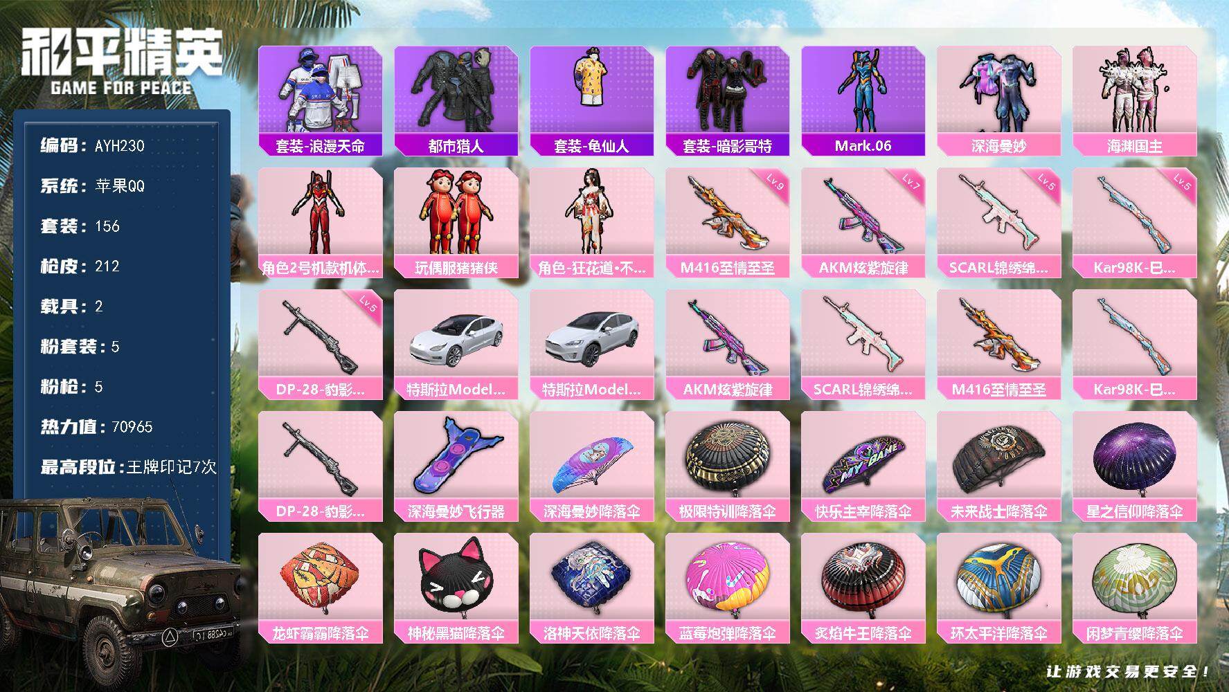 [15646775]【特价出售/店主推荐】 苹果 手Q-5粉装-5特效枪-2载具-2粉色飞行器-70965热力值-7王牌印记-156套装-212枪皮 【热门品类】:套装-浪漫天命,套装-都市猎人,套装-龟仙人,套装-暗影哥特,角色-Mark.06 【粉色套装】:粉装-深海曼妙,粉装-海渊国主,角色-2号机款机体服,玩偶服-猪猪侠,角色-狂花道·不知火舞 【粉色枪皮等级】:AKM-炫紫旋律(七级),SCAR-L-锦绣绵绵(五级),M416-至情至圣(九级),Kar98K-巳巳如意(五级),DP-28-豹影疾电(五级) 【粉色载具】:特斯拉Model 3(珍珠白),特斯拉Model X(珍珠白) 【粉色枪皮】:AKM-炫紫旋律,SCAR-L-锦绣绵绵,M416-至情至圣,Kar98K-巳巳如意,DP-28-豹影疾电 【粉色飞行器】:深海曼妙飞行器 【粉色降落伞】:深海曼妙降落伞,极限特训降落伞,快乐主宰降落伞,未来战士降落伞,星之信仰降落伞,龙虾霸霸降落伞,神秘黑猫降落伞,洛神天依降落伞,蓝莓炮弹降落伞,炙焰牛王降落伞,环太平洋降落伞,闲梦青缨降落伞,辉耀战甲降落伞,江南烟雨降落伞,精灵梦叶罗丽降落伞,金丰海韵降落伞,樱桃泡泡降落伞,极意拳锋降落伞,炫彩糖果降落伞 【稀有套装】:套装-龟仙人,套装-雪国风尚,角色-怀庆长公主,套装-蜜露汐语,套装-朱霞炽焰,套装-凌霄紫焰,玩偶服-懒羊羊,角色-申公豹,套装-炫彩糖果 【稀有枪皮】:AKM-2P战斗服款,AKM-天启纪元,AKM-奇异狩猎者,AKM-彩虹符号,AKM-影袭,AKM-星之信仰,AKM-江南烟雨,AKM-灼热熔岩,AKM-虎虎生威,AKM-霓虹街区,AKM-龙的传人,M16A4-幻世战舞者,M16A4-甜心亚梦,M16A4-魔法学院,SCAR-L-炫彩节奏,SCAR-L-玉兔迎春,SCAR-L-龙宫之主,M416-神秘黑猫,M416-糯团青竹,M416-红色方程式,M416-魔法学院,GROZA-异彩先驱,GROZA-影袭,GROZA-恐龙拽拽,GROZA-田园牧歌,GROZA-黑色刀锋,AUG-幻影战神,AUG-耀粉歌者,QBZ-神秘黑猫,QBZ-飞驰魅影,M762-天降萌叽,M762-快乐主宰,M762-深海曼妙,M762-瑞龙福将,M762-镭射皇者,AC-VAL-天降萌叽,AC-VAL-快闪甜心,AC-VAL-甜心亚梦