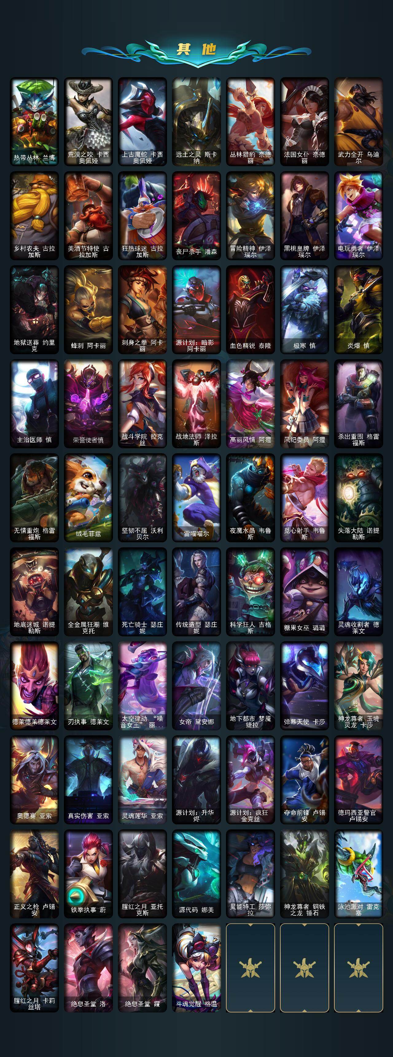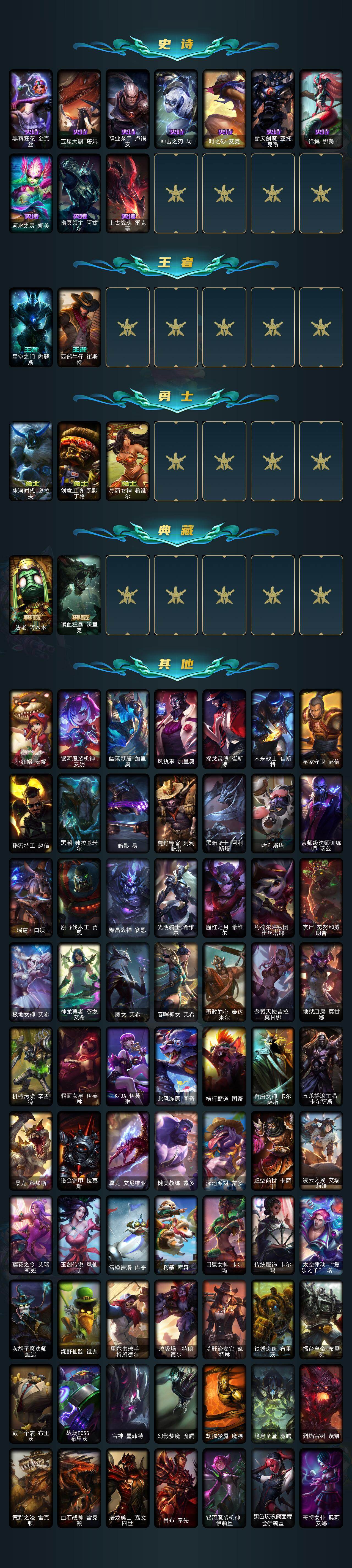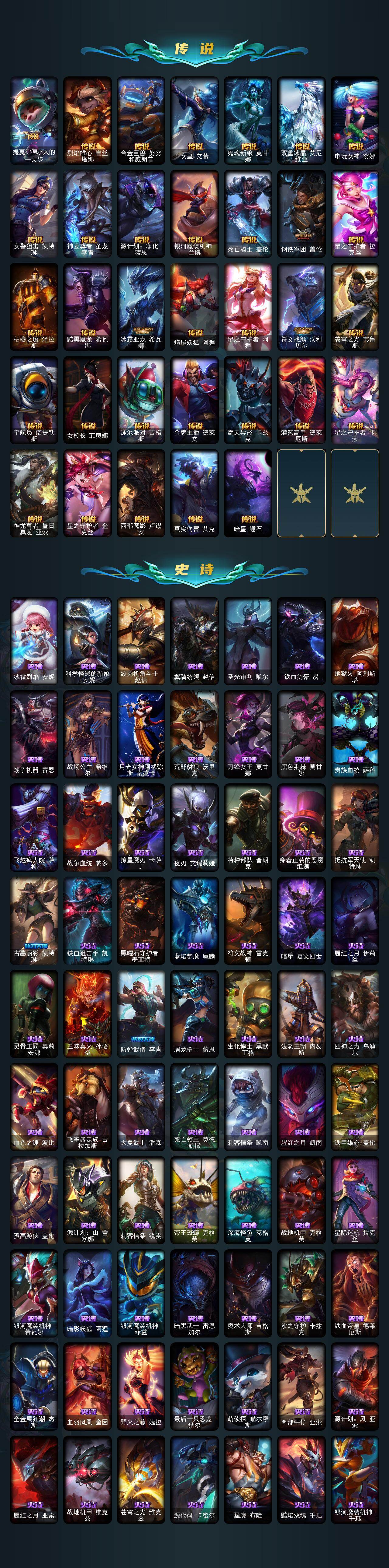 【传说皮肤】:魔幻卡牌崔斯特,战地机甲厄加特,血石领主弗拉基米尔,大天使长米迦勒凯尔,钢铁之翼凯尔,恶魔男爵瑞兹,霸天零式赛恩,提莫约德尔人的一大步,烈焰雄心崔丝塔娜,合金巨兽努努和威朗普,女皇艾希,鬼魂新娘莫甘娜,双重冰晶艾尼维亚,电玩女神娑娜,女警狙击凯特琳,神龙尊者圣龙李青,源计划净化薇恩,银河魔装机神兰博,死亡骑士盖伦,钢铁军团盖伦,星之守护者拉克丝,枯萎之壤泽拉斯,黯黑魔龙希瓦娜,冰霜亚龙希瓦娜,焰尾妖狐阿狸,星之守护者阿狸,符文战熊沃利贝尔,苍穹之光韦鲁斯,宇航员诺提勒斯,女校长菲奥娜,泳池派对吉格斯,金牌主播德莱文,霸天异形卡兹克,灌篮高手德莱厄斯,星之守护者卡莎,神龙尊者昼日真龙亚索,星之守护者金克丝,西部魔影卢锡安,真实伤害艾克,暗星锤石