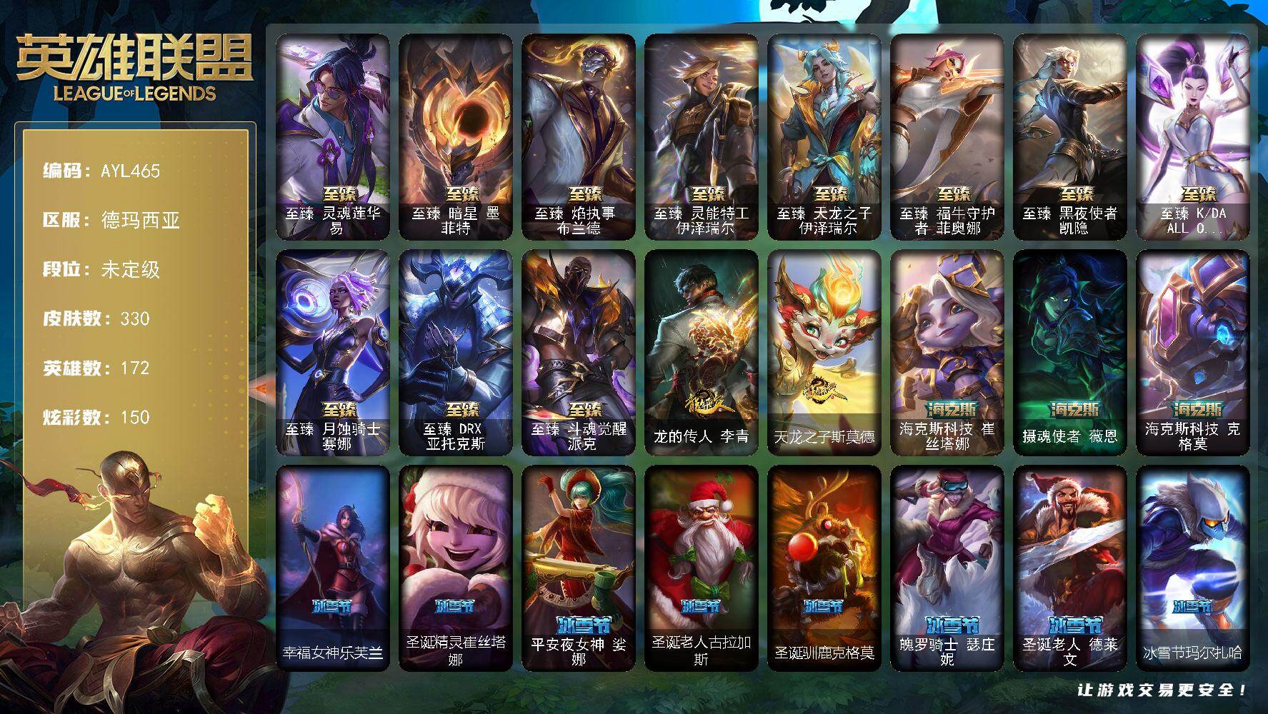 [15647144]未定级段位-172英雄-330皮肤-150炫彩-2终极-24神话-39限定-39传说-59史诗