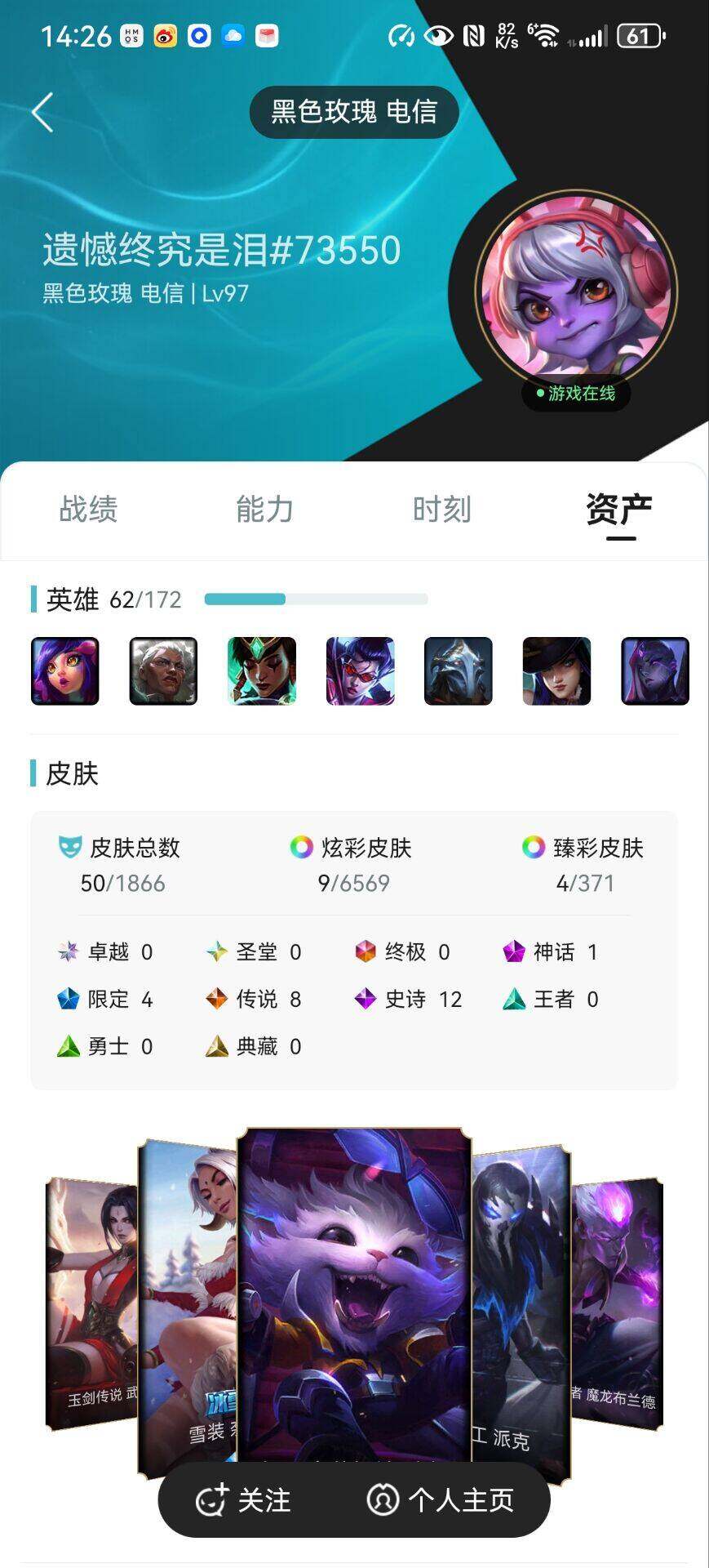 [15647193]可二次【特价出售/店主推荐】未定级段位-62英雄-50皮肤-9炫彩-0终极-1神话-4限定-8传说-12史诗