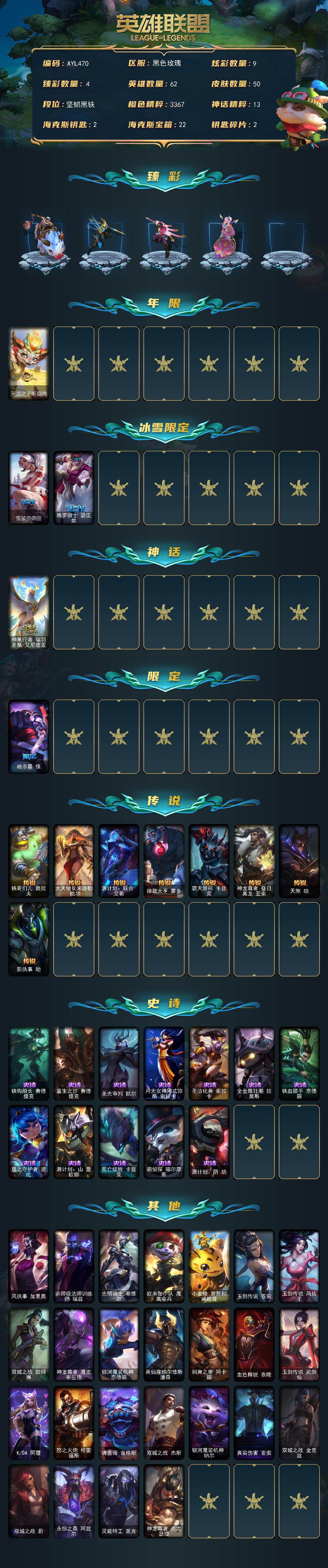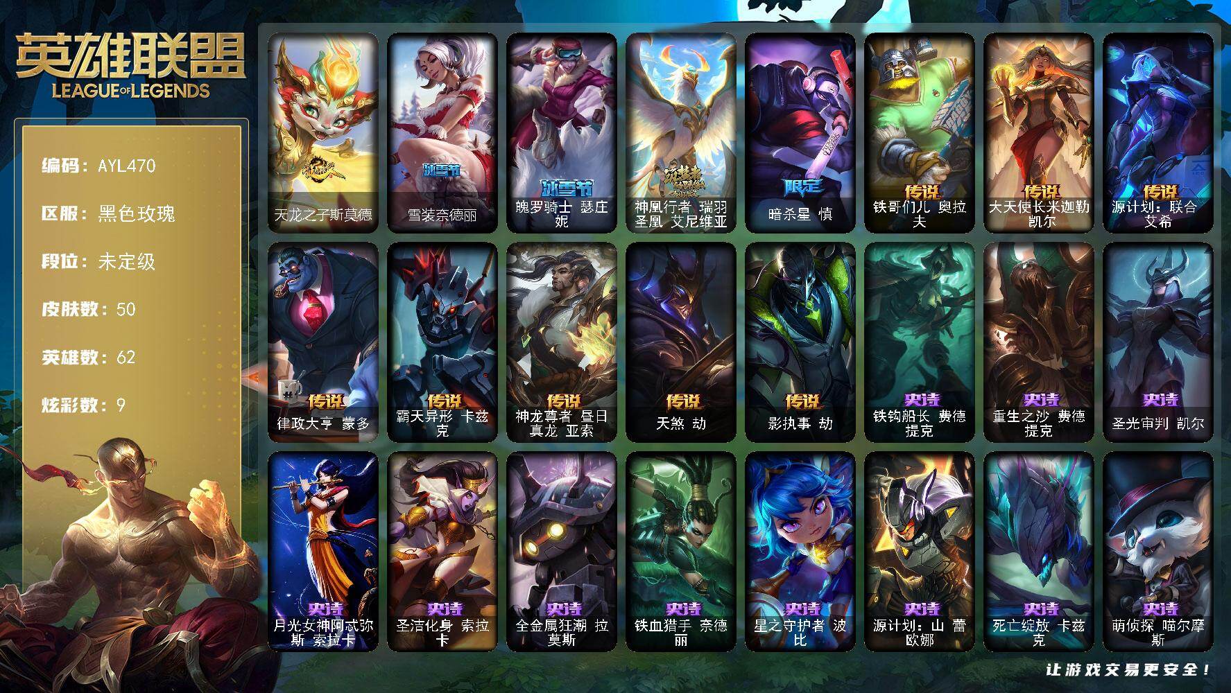[15647193]可二次【特价出售/店主推荐】未定级段位-62英雄-50皮肤-9炫彩-0终极-1神话-4限定-8传说-12史诗 【臻彩皮肤】:无畏骑士瑟庄妮赤子初心,冠军之矛卡莉丝塔凯旋圣装,玉剑传说无影竞星,星之守护者萨勒芬妮未来之光 【年限皮肤】:天龙之子斯莫德 【冰雪限定】:雪装奈德丽,魄罗骑士瑟庄妮 【神话皮肤】:神凰行者瑞羽圣凰艾尼维亚 【限定皮肤】:暗杀星慎 【传说皮肤】:铁哥们儿奥拉夫,大天使长米迦勒凯尔,源计划联合艾希,律政大亨蒙多,霸天异形卡兹克,神龙尊者昼日真龙亚索,天煞劫,影执事劫 【史诗皮肤】:铁钩船长费德提克,重生之沙费德提克,圣光审判凯尔,月光女神阿忒弥斯索拉卡,圣洁化身索拉卡,全金属狂潮拉莫斯,铁血猎手奈德丽,星之守护者波比,源计划山蕾欧娜,死亡绽放卡兹克,萌侦探喵尔摩斯,源计划阴劫 【其他皮肤1】:风执事加里奥,宗师级法师训练师瑞兹,光明骑士希维尔,欧米伽小队魔鬼伞兵,小蜜蜂努努和威朗普,玉剑传说苍鸾,玉剑传说风仙子,双城之战凯特琳,神龙尊者魔龙布兰德,银河魔装机神奈德丽,英仙座珀尔修斯潘森,刺身之拳阿卡丽,血色精锐泰隆,玉剑传说武剑仙,KDA阿狸,怒之火炮格雷福斯,魂蔷薇吉格斯,双城之战杰斯,银河魔装机神纳尔,真实伤害亚索,双城之战金克丝,双城之战蔚,永恒之森阿兹尔,灵能特工派克,神龙尊者炎龙瑟提