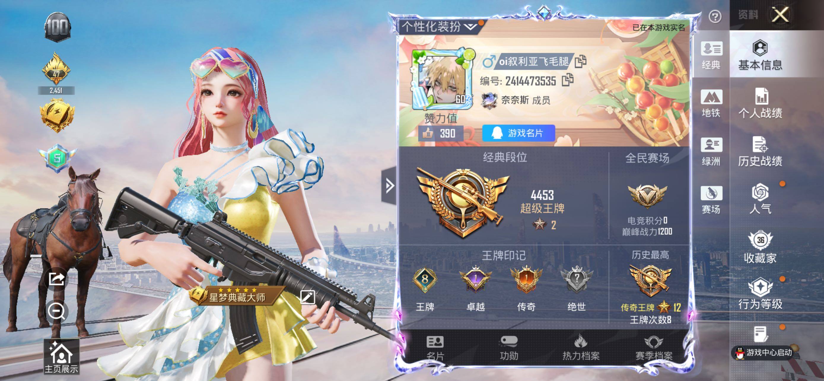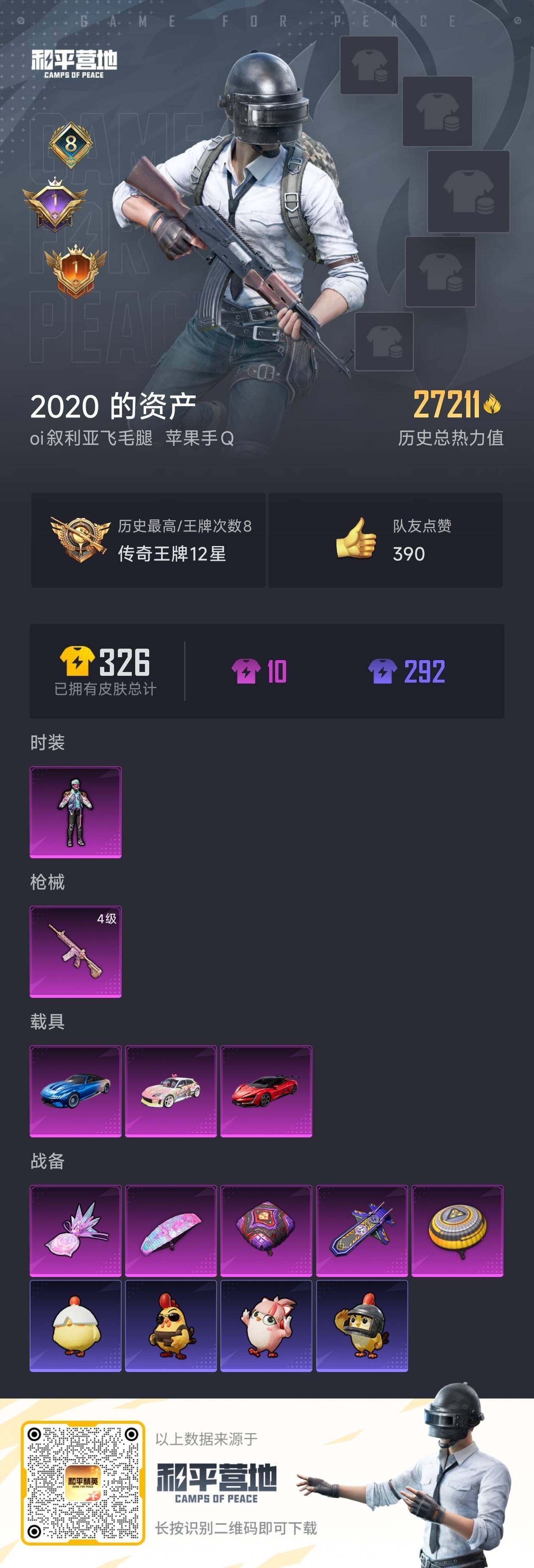 - PX_2083069- 苹果手Q-9王牌印记-5粉装-8特效枪-0载具-52761热力值-142套装-172枪皮-2卓越印记-1传奇印记 【5粉装】,幻彩电音,星穹咏叹调,智能音符,守护天翼,数码大师 【8特效枪】AKM-绿萝繁花-5级 M416-电玩时刻-5级 GROZA-镜光银凌-5级 AUG-暖羊咩咩-5级 Kar98K-巳巳如意-5级 UMP45-量子极限-5级 AKS-74U-星穹咏叹调