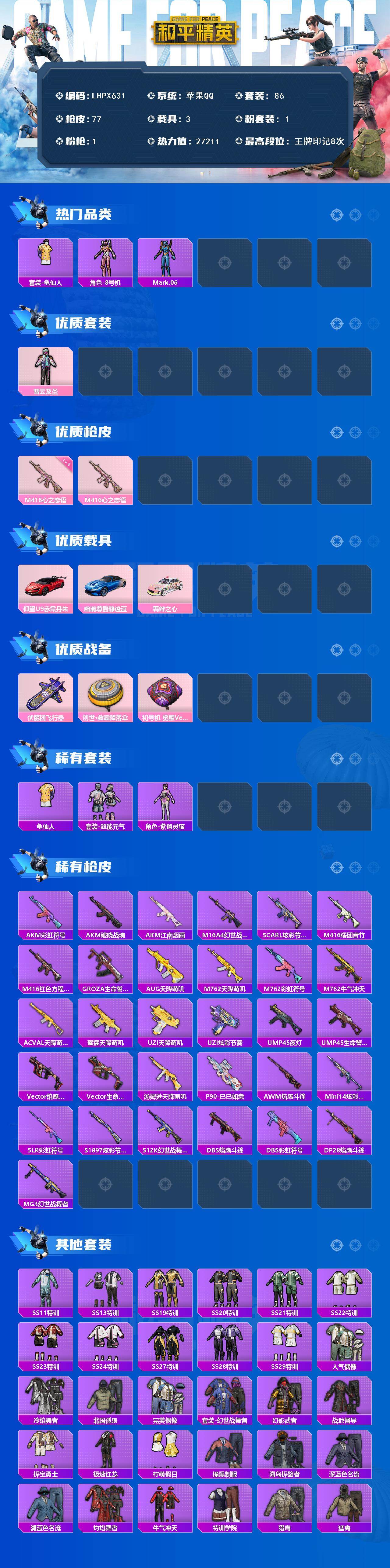 [15649268]【特价出售/店主推荐】苹果 手Q-1粉装-1特效枪-3载具-2粉色飞行器-2.7w热力值-8王牌印记-86套装-77枪皮 【热门品类】:套装-龟仙人,角色-8号机,角色-Mark.06 【粉色套装】:粉装-彗云及圣 【粉色枪皮等级】:M416-心之恋语(四级) 【粉色载具】:仰望U9(赤霞丹朱),幽澜尊爵(静谧蓝),羁绊之心 【粉色枪皮】:M416-心之恋语 【粉色飞行器】:伏魔团飞行器 【粉色降落伞】:创世·救赎降落伞,初号机 觉醒Ver.降落伞,炫彩糖果降落伞 【稀有套装】:套装-龟仙人,套装-超能元气,角色-紫俏灵猫,套装-炫彩糖果 【稀有枪皮】:AUG-冰晶雪宝,AKM-彩虹符号,AKM-江南烟雨,AKM-破晓战魂,M16A4-幻世战舞者,SCAR-L-炫彩节奏,M416-糯团青竹,M416-红色方程式,GROZA-生命誓言,AUG-天降萌叽,M762-天降萌叽,M762-彩虹符号,M762-牛气冲天,AC-VAL-天降萌叽,蜜獾-天降萌叽,UZI-天降萌叽,UZI-炫彩节奏,UMP45-夜灯,UMP45-生命誓言,Vector-焰鹰斗篷,Vector-生命誓言,汤姆逊-天降萌叽,P90-巳巳如意,AWM-焰鹰斗篷,Mini14-炫彩节奏,SLR-彩虹符号,S1897-炫彩节奏,S12K-幻世战舞者,DBS-焰鹰斗篷,DBS-彩虹符号,DP-28-焰鹰斗篷,MG3-幻世战舞者 【其他套装】:套装-SS11特训,套装-SS13特训,套装-SS19特训,套装-SS20特训,套装-SS21特训,套装-SS22特训,套装-SS23特训,套装-SS24特训,套装-SS27特训,套装-SS28特训,套装-SS29特训,套装-人气偶像,套装-冷焰舞者,套装-北国孤狼,套装-完美偶像,套装-幻世战舞者,套装-幻影武者,套装-战地督导,套装-探宝勇士,套装-极速红龙,套装-柠萌假日,套装-橘黑制服,套装-海岛探路者,套装-深蓝色名流,套装-湖蓝色名流,套装-灼焰舞者,套装-牛气冲天,套装-特训学院,套装-猎鹰,套装-猛禽,套装-王牌教练,套装-甜蜜告白,套装-甜蜜熊情侣,套装-疯狂小兔子,套装-白色伏地魔,套装-破晓战魂,套装-破蛋小黄鸡,套装-竞技名士,套装-竞技达人朋克,套装-红色运动,套装-绮丽涂鸦,套装-缤纷果语,套装-耀粉歌者,套装-蓝彩潮人,套装-蓝色运动,套装