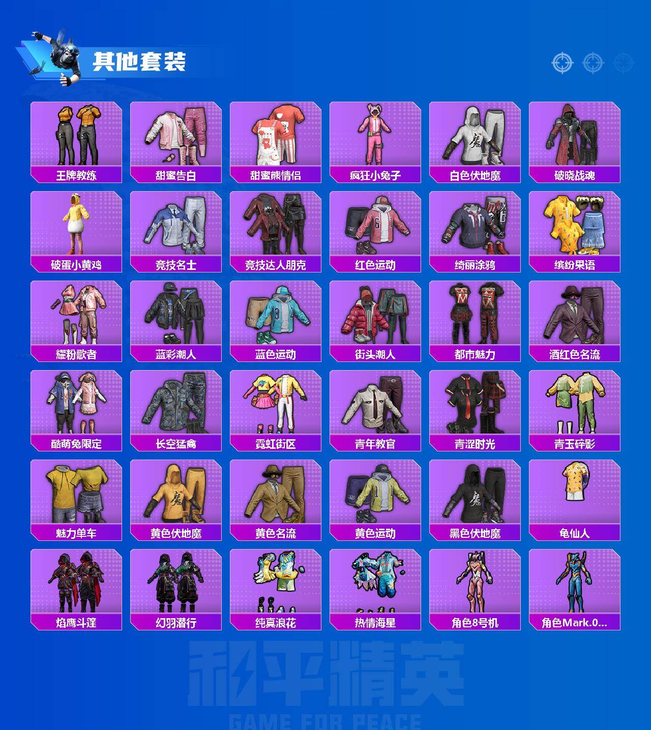 【其他套装】:套装-SS11特训,套装-SS13特训,套装-SS19特训,套装-SS20特训,套装-SS21特训,套装-SS22特训,套装-SS23特训,套装-SS24特训,套装-SS27特训,套装-SS28特训,套装-SS29特训,套装-人气偶像,套装-冷焰舞者,套装-北国孤狼,套装-完美偶像,套装-幻世战舞者,套装-幻影武者,套装-战地督导,套装-探宝勇士,套装-极速红龙,套装-柠萌假日,套装-橘黑制服,套装-海岛探路者,套装-深蓝色名流,套装-湖蓝色名流,套装-灼焰舞者,套装-牛气冲天,套装-特训学院,套装-猎鹰,套装-猛禽,套装-王牌教练,套装-甜蜜告白,套装-甜蜜熊情侣,套装-疯狂小兔子,套装-白色伏地魔,套装-破晓战魂,套装-破蛋小黄鸡,套装-竞技名士,套装-竞技达人朋克,套装-红色运动,套装-绮丽涂鸦,套装-缤纷果语,套装-耀粉歌者,套装-蓝彩潮人,套装-蓝色运动,套装