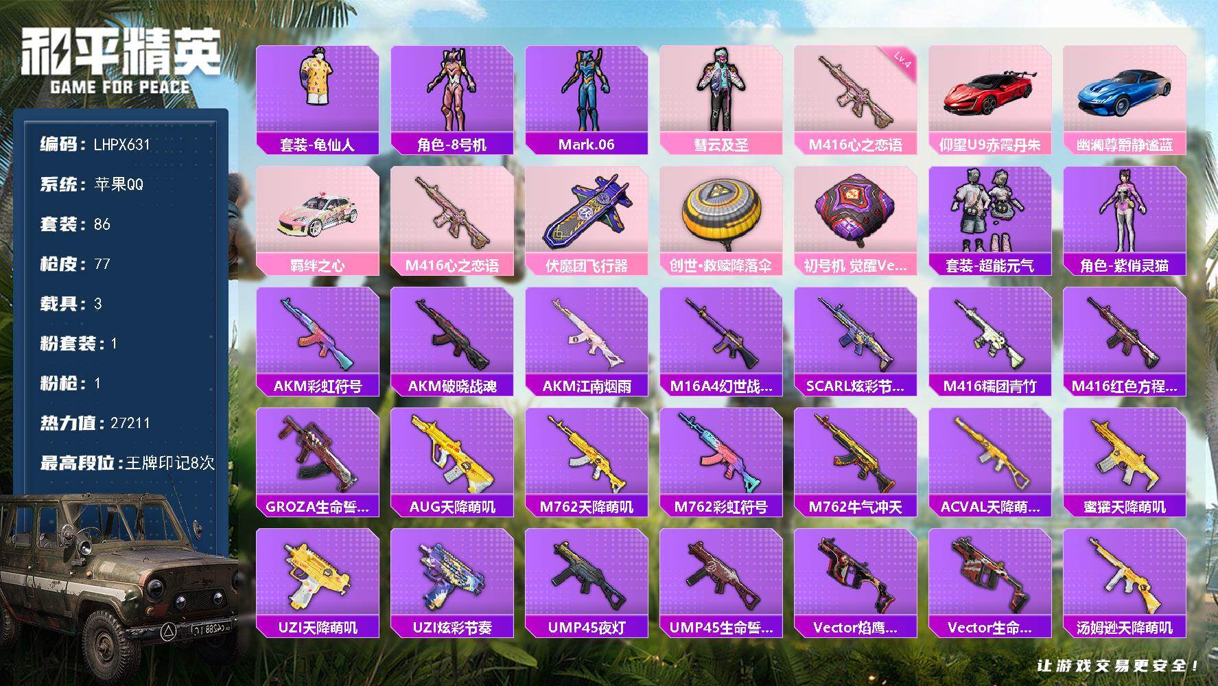 [15649268]【特价出售/店主推荐】苹果 手Q-1粉装-1特效枪-3载具-2粉色飞行器-2.7w热力值-8王牌印记-86套装-77枪皮