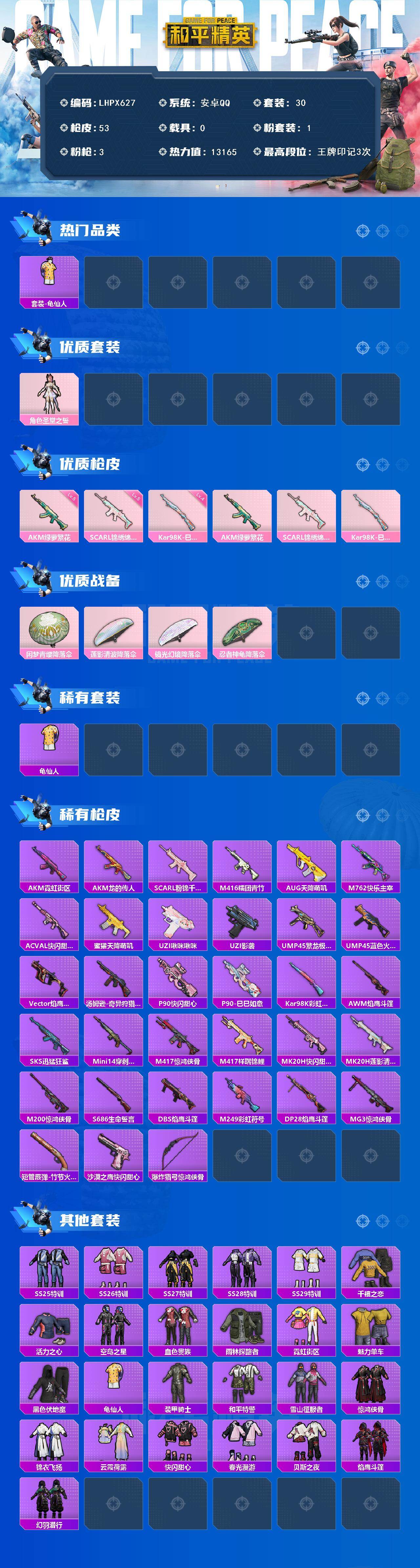 [15649346]【特价出售/店主推荐】安卓 手Q-1粉装-3特效枪-0载具-0粉色飞行器-13165热力值-3王牌印记-30套装-53枪皮 【热门品类】:套装-龟仙人 【粉色套装】:角色-圣堂之誓 【粉色枪皮等级】:AKM-绿萝繁花(五级),SCAR-L-锦绣绵绵(五级),Kar98K-巳巳如意(四级) 【粉色枪皮】:AKM-绿萝繁花,SCAR-L-锦绣绵绵,Kar98K-巳巳如意 【粉色降落伞】:闲梦青缨降落伞,莲影清波降落伞,镜光幻境降落伞,忍者神龟降落伞 【稀有套装】:套装-龟仙人 【稀有枪皮】:AKM-霓虹街区,AKM-龙的传人,SCAR-L-粉锦千层,M416-糯团青竹,AUG-天降萌叽,M762-快乐主宰,AC-VAL-快闪甜心,蜜獾-天降萌叽,UZI-啾咪啾咪,UZI-影袭,UMP45-繁龙极客,UMP45-蓝色火焰,Vector-焰鹰斗篷,汤姆逊-奇异狩猎者,P90-快闪甜心,P90-巳巳如意,Kar98K-彩虹符号,AWM-焰鹰斗篷,SKS-迅猛狂鲨,Mini14-穿刺龙虾,M417-惊鸿侠骨,M417-祥瑞锦鲤,MK20-H-快闪甜心,MK20-H-莲影清波,M200-惊鸿侠骨,S686-生命誓言,DBS-焰鹰斗篷,M249-彩虹符号,DP-28-焰鹰斗篷,MG3-惊鸿侠骨,短管霰弹-竹节火铳,沙漠之鹰-快闪甜心,爆炸猎弓-惊鸿侠骨 【其他套装】:套装-SS25特训,套装-SS26特训,套装-SS27特训,套装-SS28特训,套装-SS29特训,套装-千禧之恋,套装-活力之心,套装-空岛之星,套装-血色贵族,套装-雨林探路者,套装-霓虹街区,套装-魅力单车,套装-黑色伏地魔,套装-龟仙人,套装-装甲骑士,套装-和平特警,套装-雪山征服者,套装-惊鸿侠骨,套装-锦衣飞扬,套装-云霞荷露,套装-快闪甜心,套装-春光漫游,套装-贝斯之夜,套装-焰鹰斗篷,套装-幻羽潜行 【营地ID】:957009563