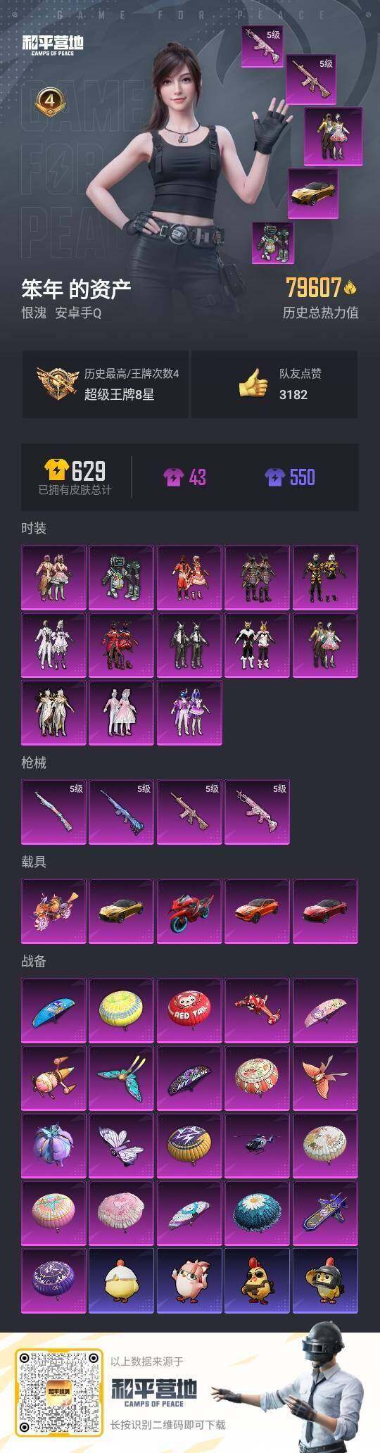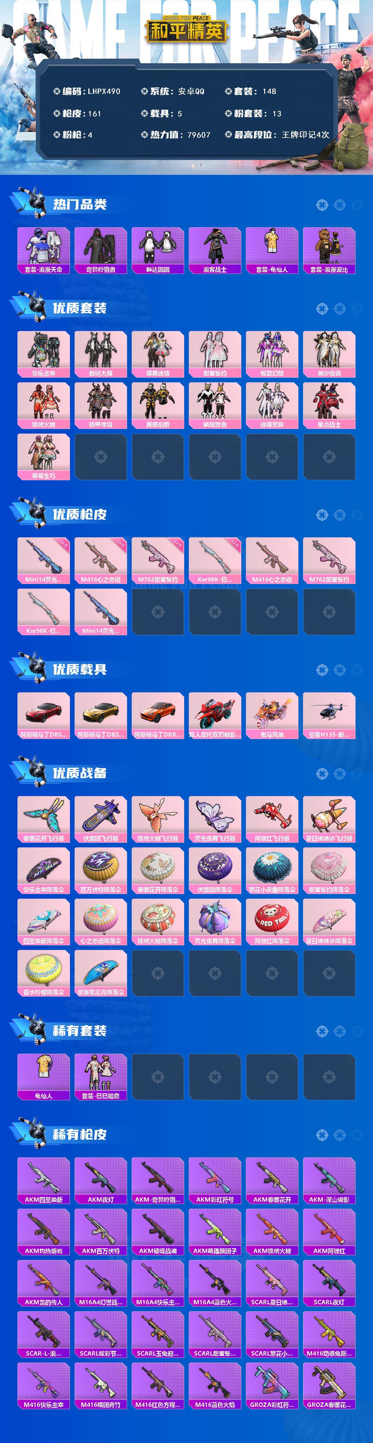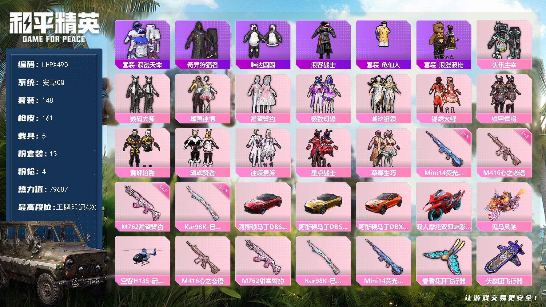 [15649401]【店主推荐捡漏号!可直接换绑】安卓 手Q-13粉装-4特效枪-5载具-6粉色飞行器-79607热力值-4王牌印记-148套装-161枪皮【热门品类】:套装-浪漫天命,套装-奇异狩猎者,套装-胖达圆圆,套装-浪客战士,套装-龟仙人,套装-浪漫波比【粉色套装】:粉装-快乐主宰,粉装-数码大师,粉装-蝶舞迷情,粉装-甜蜜誓约,粉装-极致幻想,粉装-潮汐统领,粉装-锦绣火鲤,粉装-铁甲悍将,粉装-黄蜂伯爵,粉装-鳞翅贤者,粉装-迷蝶贵族,粉装-星点战士,粉装-草莓生巧【粉色枪皮等级】:M416-心之恋语(五级),M762-甜蜜誓约(五级),Kar98K-巳巳如意(五级),Mini14-荧光虫舞(五级)【粉色载具】:阿斯顿马丁DBS(红),阿斯顿马丁DBS(金),阿斯顿马丁DBX(橙),双人摩托-双刃魅影(红),鬼马风驰,空客H135-蔚蓝之翼【粉色枪皮】:M416-心之恋语,M762-甜蜜誓约,Kar98K-巳巳如意,Mini14-荧光虫舞【粉色飞行器】:春暖花开飞行器,伏魔团飞行器,锦绣火鲤飞行器,荧光虫舞飞行器,阿狸红飞行器,夏日绵绵冰飞行器