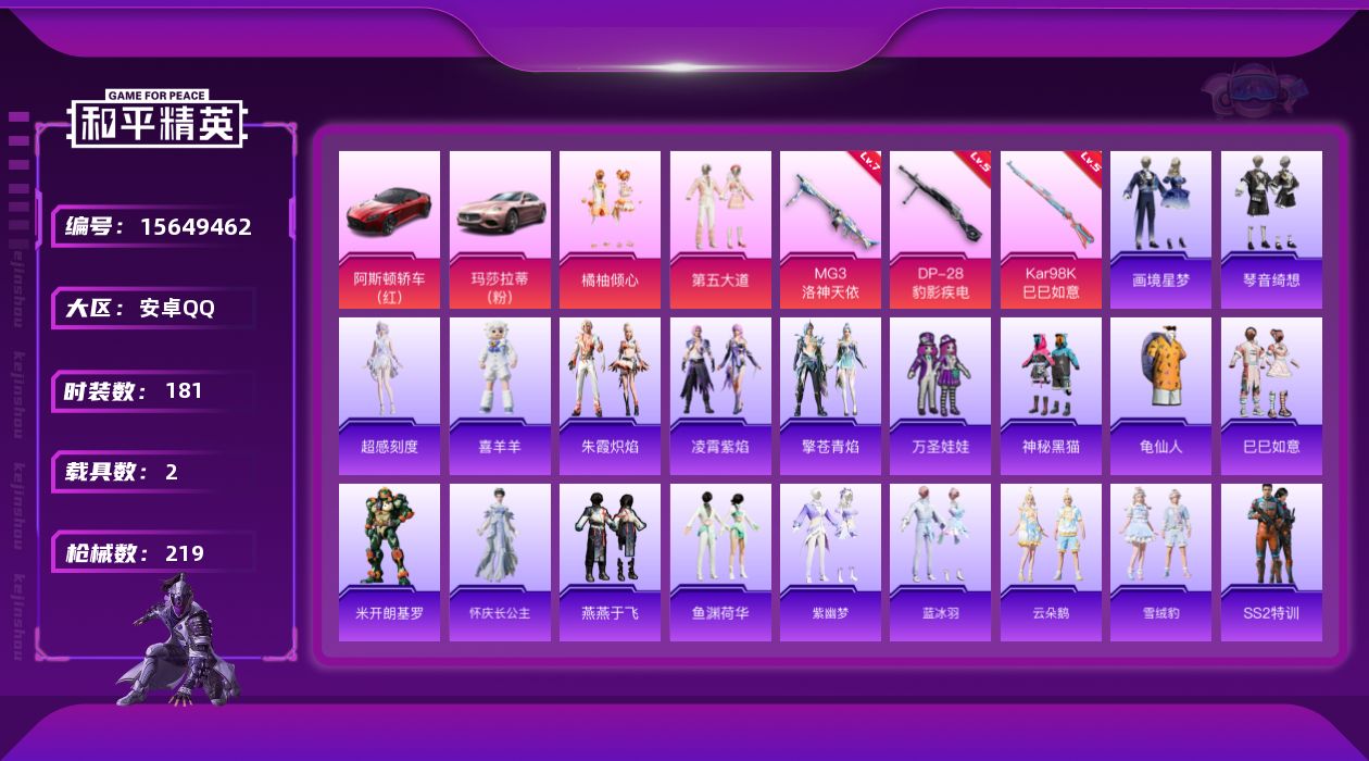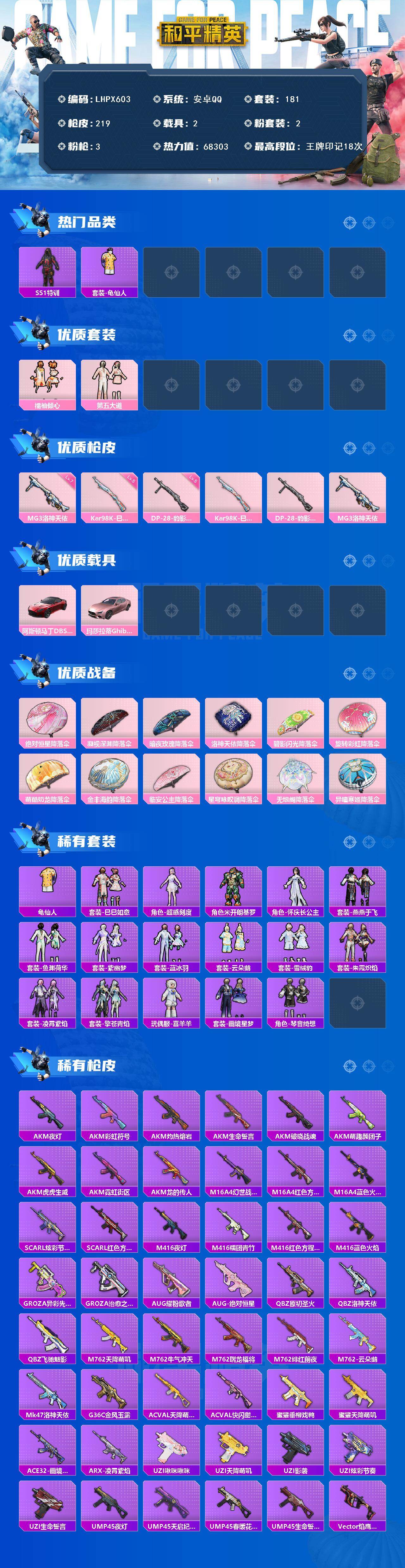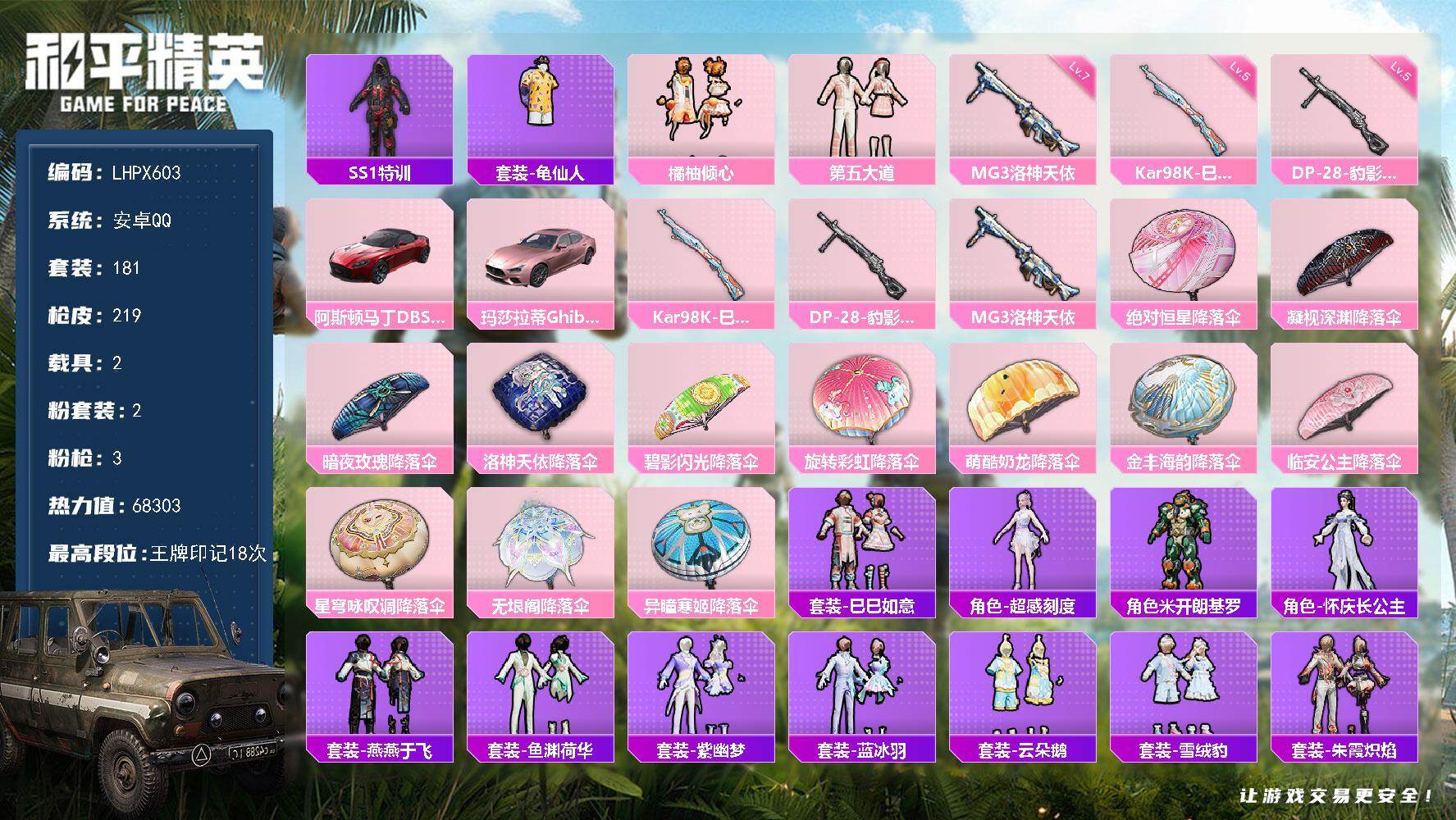 [15649462]【店主推荐捡漏号!可直接换绑】安卓 手Q-2粉装-3特效枪-2载具-1粉色飞行器-68303热力值-18王牌印记-181套装-219枪皮【热门品类】:套装-SS1特训,套装-龟仙人【粉色套装】:粉装-橘柚倾心,粉装-第五大道【粉色枪皮等级】:Kar98K-巳巳如意(五级),DP-28-豹影疾电(五级),MG3-洛神天依(七级)【粉色载具】:阿斯顿马丁DBS(红),玛莎拉蒂Ghibli(粉)【粉色枪皮】:Kar98K-巳巳如意,DP-28-豹影疾电,MG3-洛神天依