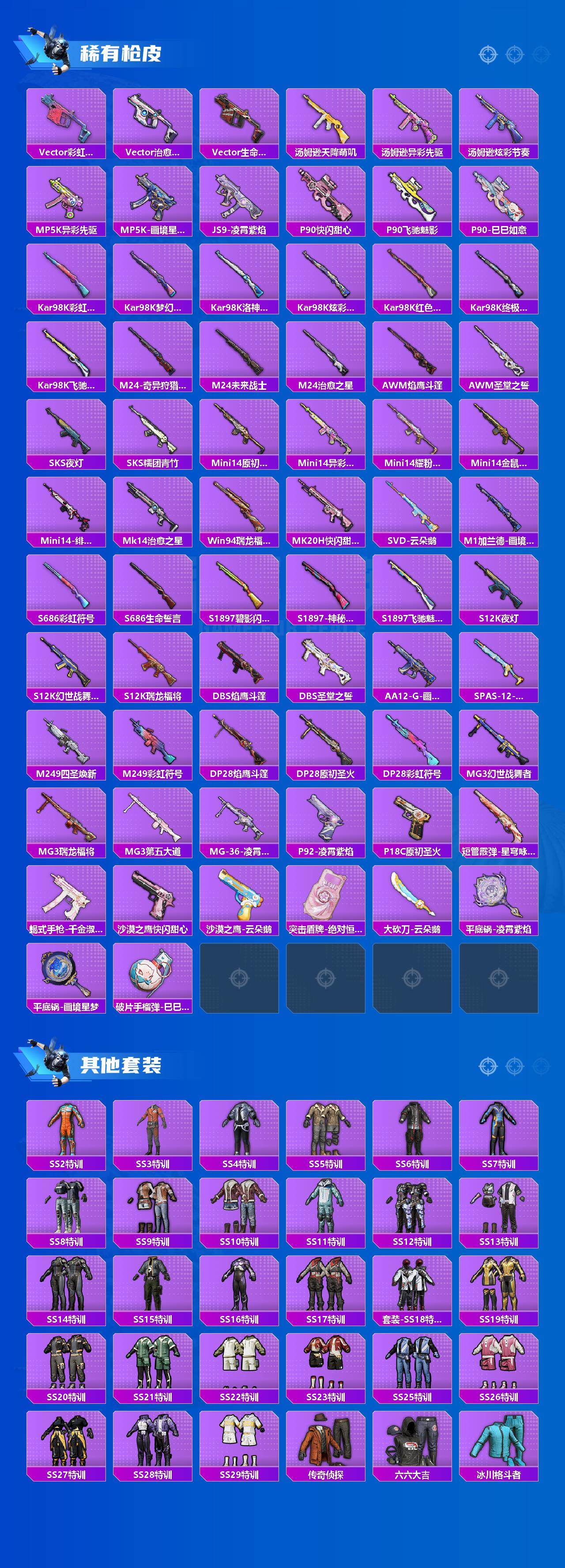 - [11687619]2粉装 4特效枪 1载具 16印记 可二次 可修改实名 身法装备:8号机(新粉螳螂),Mark.06(新蓝螳螂),萌熊伴侣背包(粉熊背包) 优质装备:玛莎拉蒂Ghibli(蓝),萌熊伴侣背包(粉熊背包),M762甜蜜誓约,七级M762-甜蜜誓约,GROZA-镜光银凌,萨利娅,Kar98K-巳巳如意 热门装扮:复仇流浪者,奇迹天团,大橘为重,潮萌小黄鸭,恒星战甲,鹰眼刺客 稀有枪皮:DP-28-豹影疾电 五级特效枪:五级GROZA-镜光银凌,五级Kar98K-巳巳如意,五级DP-28-豹影疾电 紫色装扮:SS22特训,娇憨猪猪,萌趣咩咩,SS21特训,SS31特训套装,SS5特训,人气偶像,六六大吉,冰川特警,冷焰舞者,凛冬战士,北国孤狼,SS30特训套装,SS33特训套装,青涩时光,SS20特训,SS15特训,艾克斯奥特曼,闪银刀客,SS16特训,SS13特训,浪漫樱花,治愈之星,迅捷之星,科技之星,SS14特训,特种颜团子,猎梦纪元,SS19特训,吉莉礼服,甜心亚梦,虚音幻奏,瑞龙福将,团圆交子,SS17特训,SS18特训,都市魅力,酒红色名流,酷潮明星,长空猛禽,雪山征服者,雪山精英,霓虹街区,青年教官,青春校园,风暴特警,缤纷果语,耀眼新星,蓝彩潮人,蓝色运动,虎虎生威吉莉,街头潮人,跃动心情,魅力单车,麻辣教官,黄色伏地魔,黄色名流,黄色运动,黎明保卫者,黑色伏地魔,龙的传人,龟仙人,冰河战士,龙魂突击队,蝶变,香桃花海,和平特警,沙漠毒蛇,极地朋克,极速红龙,橘黑制服,派对绅士,涂山之恋,深蓝色名流,幻影武者,圣诞大吉,坚韧舞者,夏日音浪,夜莺强袭者,完美偶像,帅气教官,幻世战舞者,时尚圣诞,战地督导,战地菁英,探宝勇士,湖蓝色名流,绮丽涂鸦,甜蜜菠萝,疯狂小兔子,白熊同盟,白色伏地魔,破晓战魂,破蛋小黄鸡,神秘领域,甜蜜告白,福星高照,空岛之星,空投萌叽,竞技勇士朋克,竞技达人朋克,红色运动,牛气冲天,灰色格斗者,灼焰舞者,炫蓝之夏,热血青春,熔岩使者,牛气满满,猛禽,狂沙舞者,猎鹰,雏菊兔兔,萝兰蝴蝶,SS29特训,达芬奇,星途旅人,SS28特训,8号机(新粉螳螂),Mark.06(新蓝螳螂),鱼渊荷华,玉兔迎春,燕燕于飞,巳巳如意,都市丽猫,青团波波,糖糖葫芦,竞技名士,街头风暴,SS24特训(SS24特训套装),SS25特训,粉红小猪,SS27