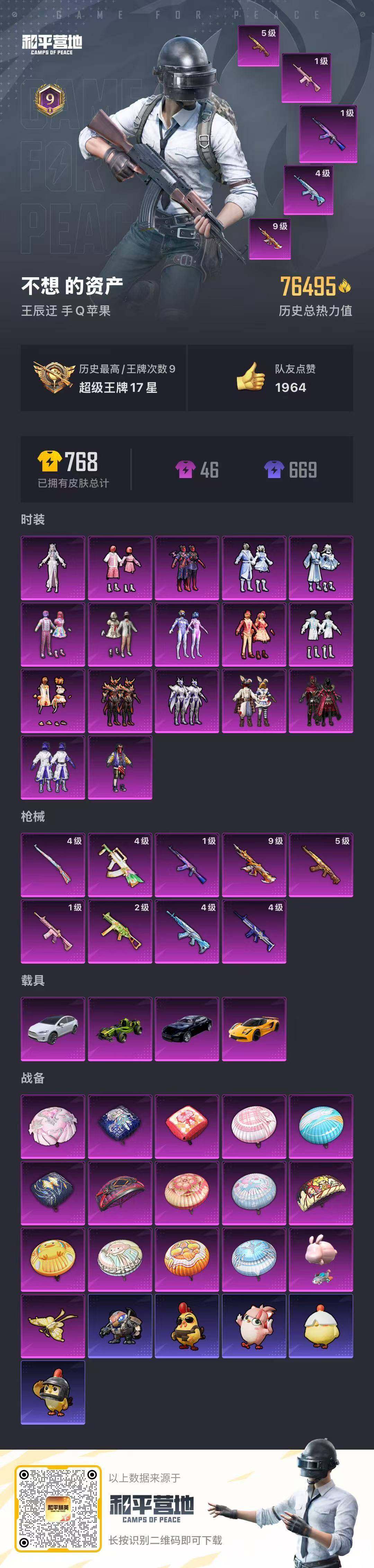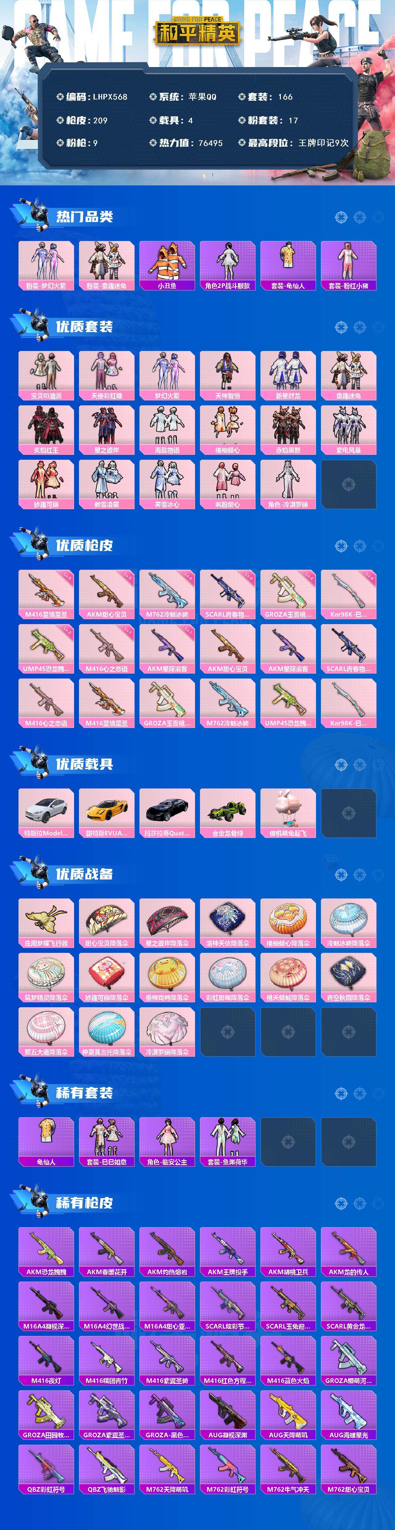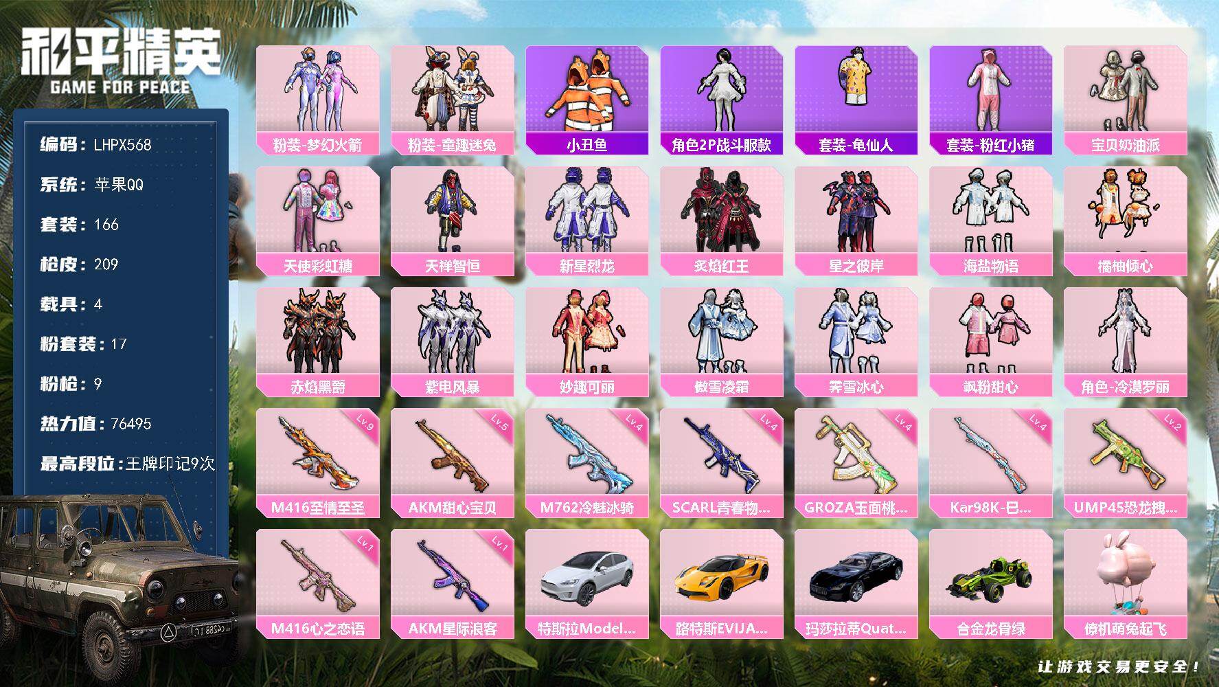 [15649593]【店主推荐捡漏号!可直接换绑】苹果 手Q-17粉装-9特效枪-4载具-1僚机-1粉色飞行器-76495热力值-9王牌印记-166套装-209枪皮【热门品类】:粉装-梦幻火箭,粉装-童趣迷兔,套装-小丑鱼,角色-2P战斗服款,套装-龟仙人,套装-粉红小猪【粉色套装】:粉装-宝贝奶油派,粉装-天使彩虹糖,粉装-梦幻火箭,粉装-天禅智恒,粉装-新星烈龙,粉装-童趣迷兔,粉装-炙焰红王,粉装-星之彼岸,粉装-海盐物语,粉装-橘柚倾心,粉装-赤焰黑爵,粉装-紫电风暴,粉装-妙趣可丽,粉装-傲雪凌霜,粉装-霁雪冰心,粉装-飒粉甜心,角色-冷漠罗丽【粉色枪皮等级】:AKM-甜心宝贝(五级),AKM-星际浪客(一级),SCAR-L-青春物语(四级),M416-心之恋语(一级),M416-至情至圣(九级),GROZA-玉面桃花(四级),M762-冷魅冰骑(四级),UMP45-恐龙拽拽(二级),Kar98K-巳巳如意(四级)【粉色载具】:特斯拉Model X(珍珠白),路特斯EVIJA(星际黄),玛莎拉蒂Quattroporte(夜幕蓝),合金龙骨(绿),僚机-萌兔起飞【粉色枪皮】:AKM-甜心宝贝,AKM-星际浪客,SCAR-L-青春物语,M416-心之恋语,M416-至情至圣,GROZA-玉面桃花,M762-冷魅冰骑,UMP45-恐龙拽拽,Kar98K-巳巳如意【粉色飞行器】:庄周梦蝶飞行器