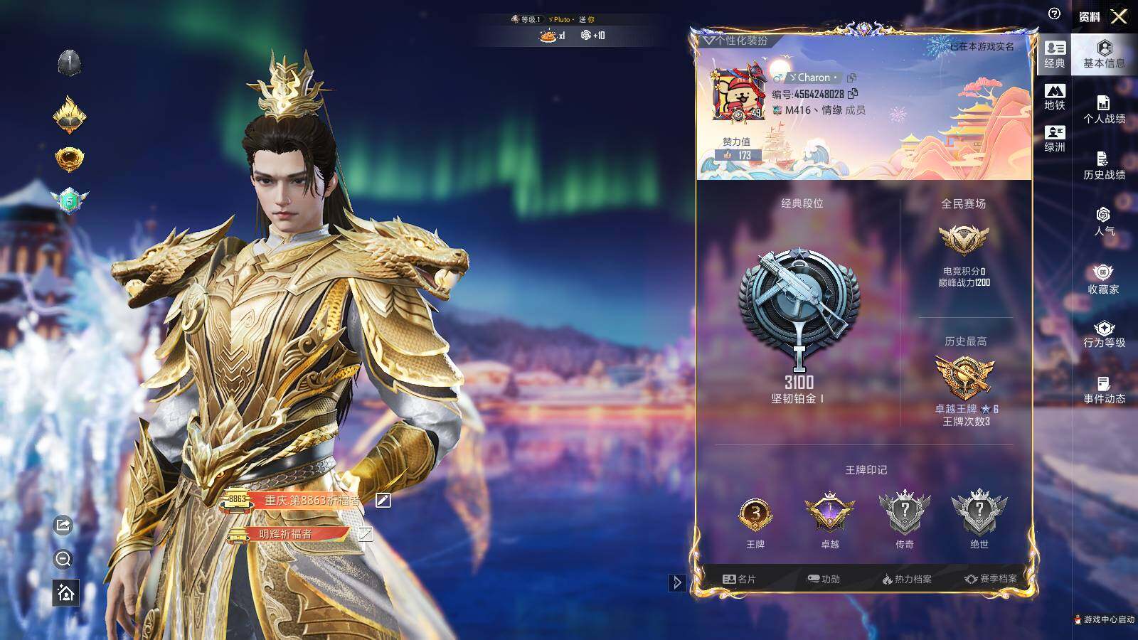 - [14348409]北京一区-27V-1王者-1炫金 【热门武器】:QBZ03-金色蔷薇,M200-幻神,M4A1-黑骑士,雷神-小红,COP 357-幻灵,沙鹰-修罗*4,Knife-冠军之刃*2 【王者炫金武器】:炫金天龙 【音效卡】:M4A1-黑骑士音效卡 【皮肤】:幻神-冠军之幻,幻神-宠儿-2021MVP,M200-幻神-N9-2022MVP,QBZ03-巅峰荣耀皮肤,雷神-宠儿-2019MVP,雷神-R.LGD-CFPLS18冠军,黑骑士-AG-S4冠军典藏,龙啸-冠军之啸 【角色】:暗夜-X,虎妞,灵狐者-X,灵狐者-七夕宝贝,灵狐者-职业经理,麻雀,潘多拉-X,蜀雪,新娜塔莎,影武者-X,幽 【人偶武器】:雷神-小红,生化手雷-机甲核心 【暴走生化】:超级对讲机 【英雄级武器】:M4A1-雷神,M4A1-黑骑士,QBZ03-金色蔷薇,M200-幻神,王者风神-觉醒版,沙鹰-修罗*4,COP 357-幻灵,屠龙*2,龙啸,幻灵之锋,高爆手雷-幻灵*4,闪光弹-幻灵*4,烟雾弹-幻灵*4 【道具】:EP战队炫彩背包,夺命之镰,防化服,金色流光-枪王排位,星辰流光-枪王排位,防弹头盔,防弹衣,C4工具钳,手雷包 【特殊枪械】:1黑骑士