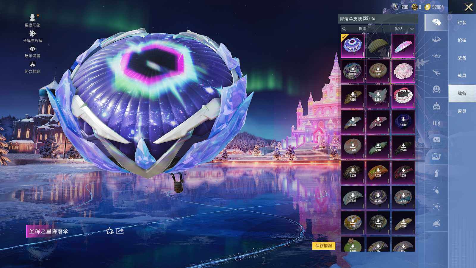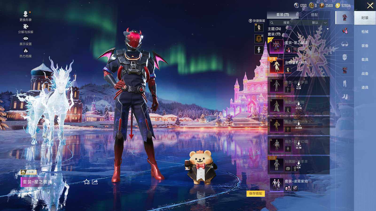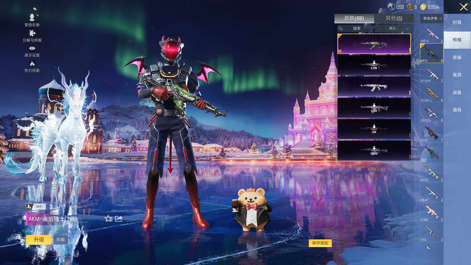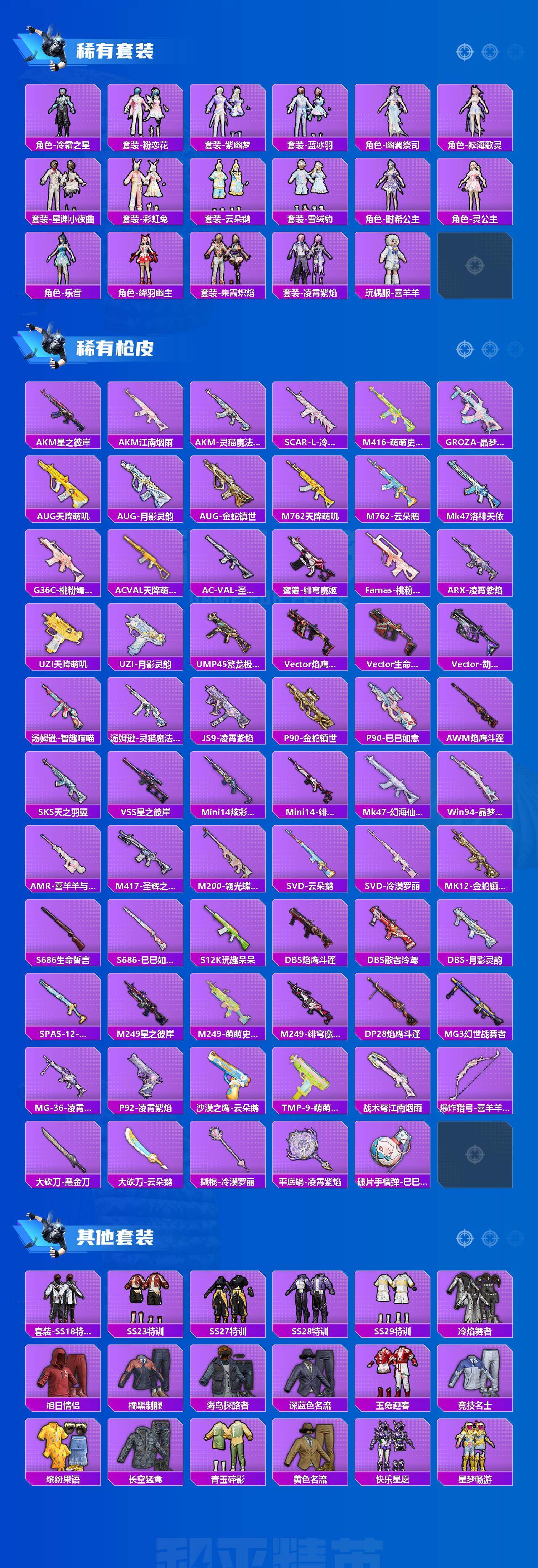 AKM-幽焰骑士,M16A4-晶梦幻蝶,SCAR-L-锦绣绵绵,SCAR-L-金蛇镇世,M416-电玩时刻,GROZA-镜光银凌,GROZA-圣辉之星,AUG-星之彼岸,AUG-暖羊咩咩,UMP45-量子极限,Kar98K-巳巳如意,SVD-月影灵韵,MK12-雪月幻音,破片手榴弹-热量炸弹