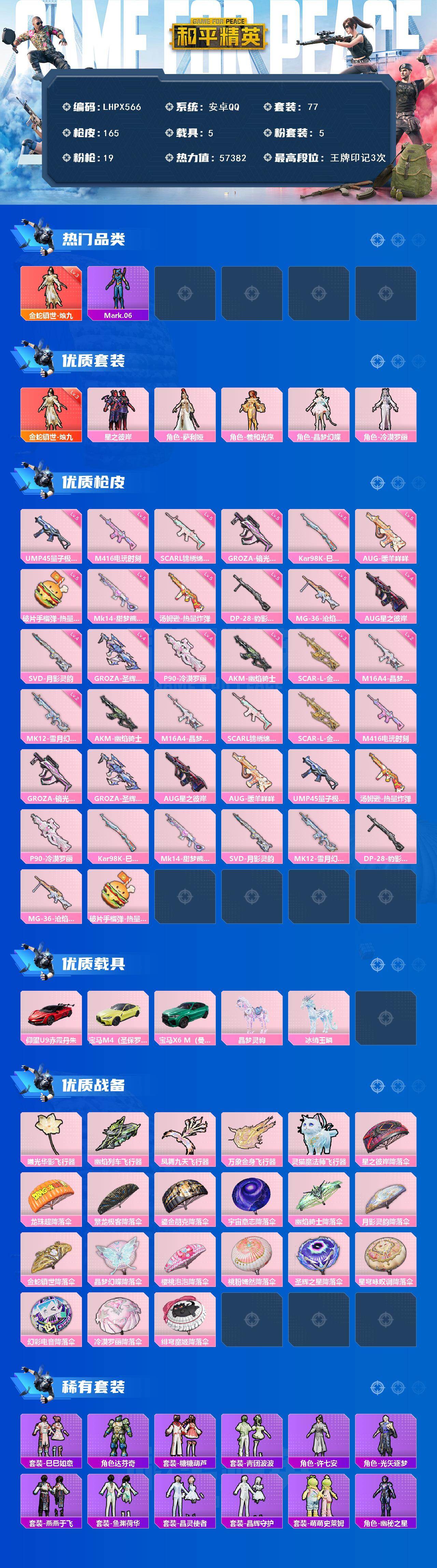 [15649634]【店主推荐捡漏号!可直接换绑】安卓 手Q-1神装-5粉装-19特效枪-5载具-6粉色飞行器-57382热力值-3王牌印记-77套装-165枪皮【红色神装等级】:金蛇镇世-烛九(三级)【红色角色神装】:金蛇镇世-烛九【热门品类】:角色-Mark.06【粉色套装】:粉装-星之彼岸,角色-萨利娅,角色-羲和光序,角色-晶梦幻蝶,角色-冷漠罗丽【粉色枪皮等级】:AKM-幽焰骑士(三级),M16A4-晶梦幻蝶(二级),SCAR-L-锦绣绵绵(五级),SCAR-L-金蛇镇世(三级),M416-电玩时刻(五级),GROZA-镜光银凌(五级),GROZA-圣辉之星(四级),AUG-星之彼岸(四级),AUG-暖羊咩咩(五级),UMP45-量子极限(五级),汤姆逊-星月云朵(二级MK12-雪月幻音),汤姆逊-热量炸弹(五级),P90-冷漠罗丽(四级),Kar98K-巳巳如意(五级),Mk14-甜梦熊击(五级),SVD-月影灵韵(四级),DP-28-豹影疾电(五级),MG-36-沧焰双生(五级),破片手榴弹-热量炸弹(五级)【粉色载具】:仰望U9(赤霞丹朱),宝马M4(圣保罗黄),宝马X6 M(曼岛绿),晶梦灵驹,冰绡玉鳞【粉色枪皮】:AKM-幽焰骑士,M16A4-晶梦幻蝶,SCAR-L-锦绣绵绵,SCAR-L-金蛇镇世,M416-电玩时刻,GROZA-镜光银凌,GROZA-圣辉之星,AUG-星之彼岸,AUG-暖羊咩咩,UMP45-量子极限,汤姆逊-热量炸弹,P90-冷漠罗丽,Kar98K-巳巳如意,Mk14-甜梦熊击,SVD-月影灵韵,MK12-雪月幻音,DP-28-豹影疾电,MG-36-沧焰双生,破片手榴弹-热量炸弹【粉色飞行器】:曦光华影飞行器,幽焰列车飞行器,凤舞九天飞行器,万象金身飞行器,灵猫魔法师飞行器