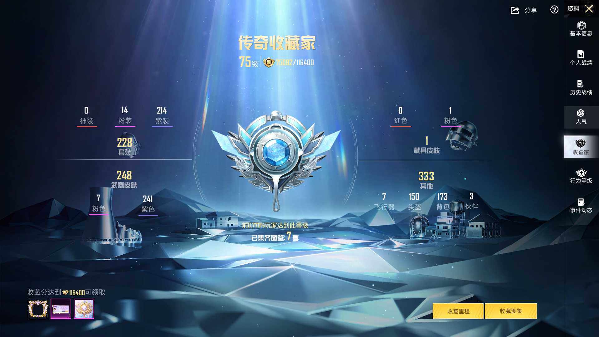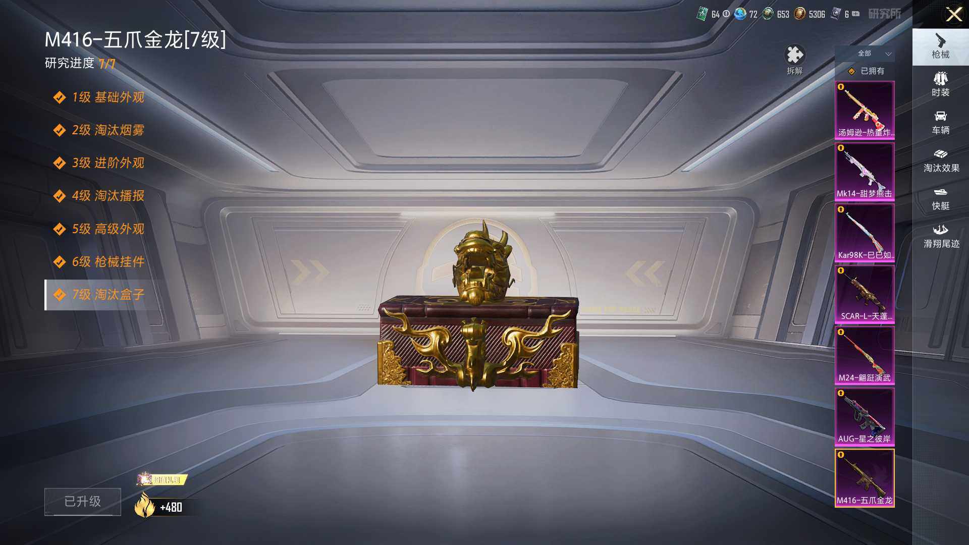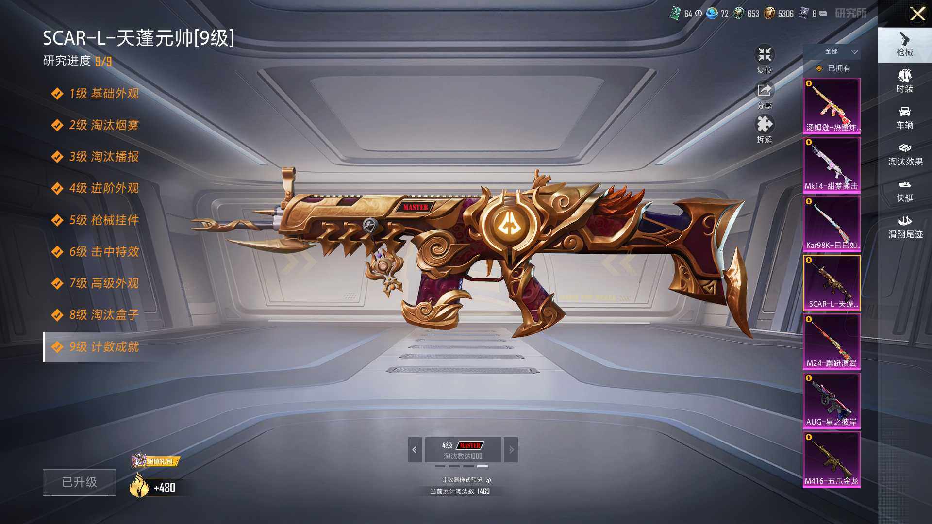 【粉色枪皮等级】:SCAR-L-天蓬元帅(九级),M416-五爪金龙(七级),AUG-星之彼岸(七级),汤姆逊-热量炸弹(五级),Kar98K-巳巳如意(五级),M24-翩跹演武(七级),Mk14-甜梦熊击(五级)