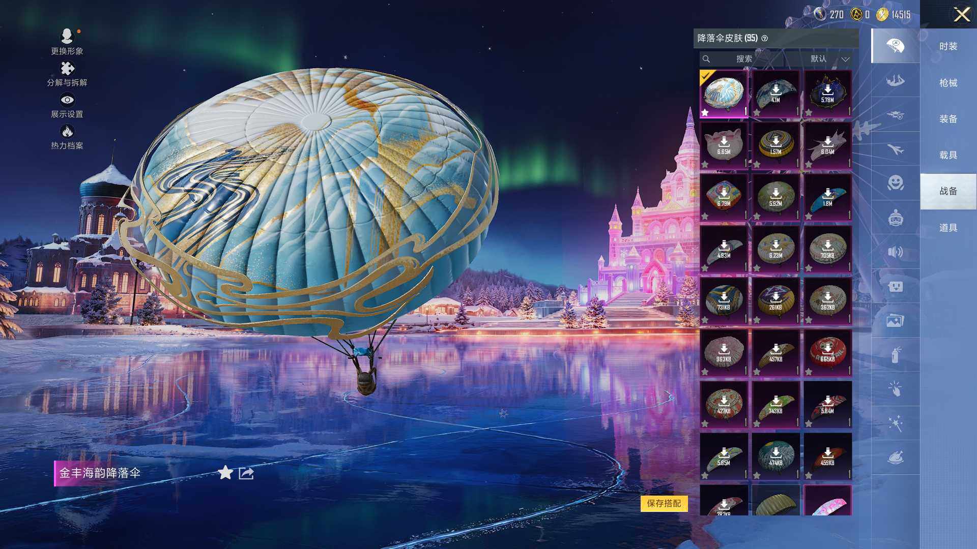 【粉色降落伞】:百万伏特降落伞,春暖花开降落伞,甜蜜誓约降落伞,潮汐统领降落伞,锦绣火鲤降落伞,阿狸红降落伞,碧影闪光降落伞,筑梦精灵降落伞,圣光天使降落伞,环太平洋降落伞,太空嘟嘟降落伞,音爆索尼克降落伞,闲梦青缨降落伞,炫光之旅降落伞,江南烟雨降落伞,创世·救赎降落伞,金丰海韵降落伞,千金淑猫降落伞,鬼刀降落伞,雪月幻音降落伞,幻彩电音降落伞,炫彩糖果降落伞