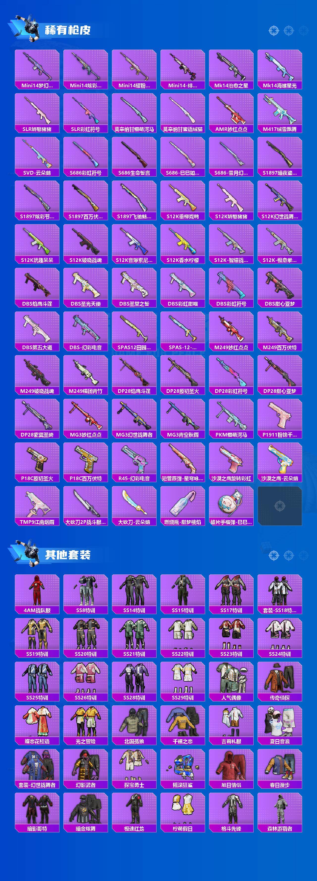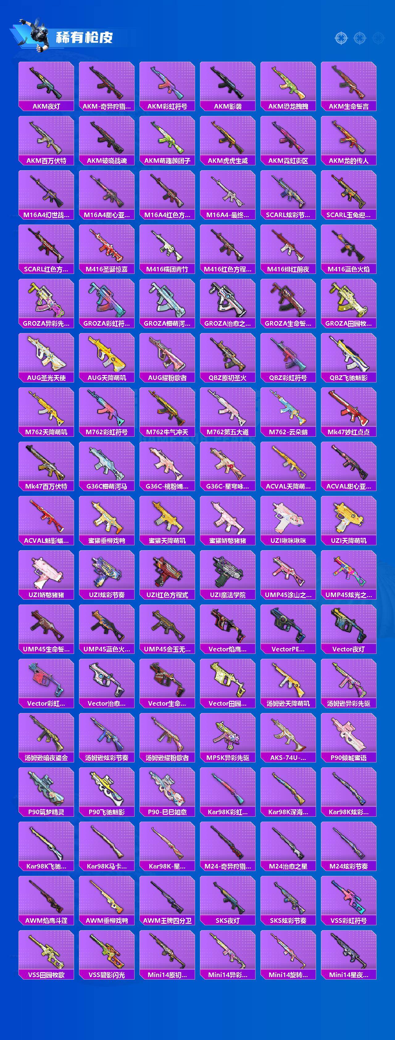 【稀有枪皮】:AKM-夜灯,AKM-奇异狩猎者,AKM-彩虹符号,AKM-影袭,AKM-恐龙拽拽,AKM-生命誓言,AKM-百万伏特,AKM-破晓战魂,AKM-萌趣颜团子,AKM-虎虎生威,AKM-霓虹街区,AKM-龙的传人,M16A4-幻世战舞者,M