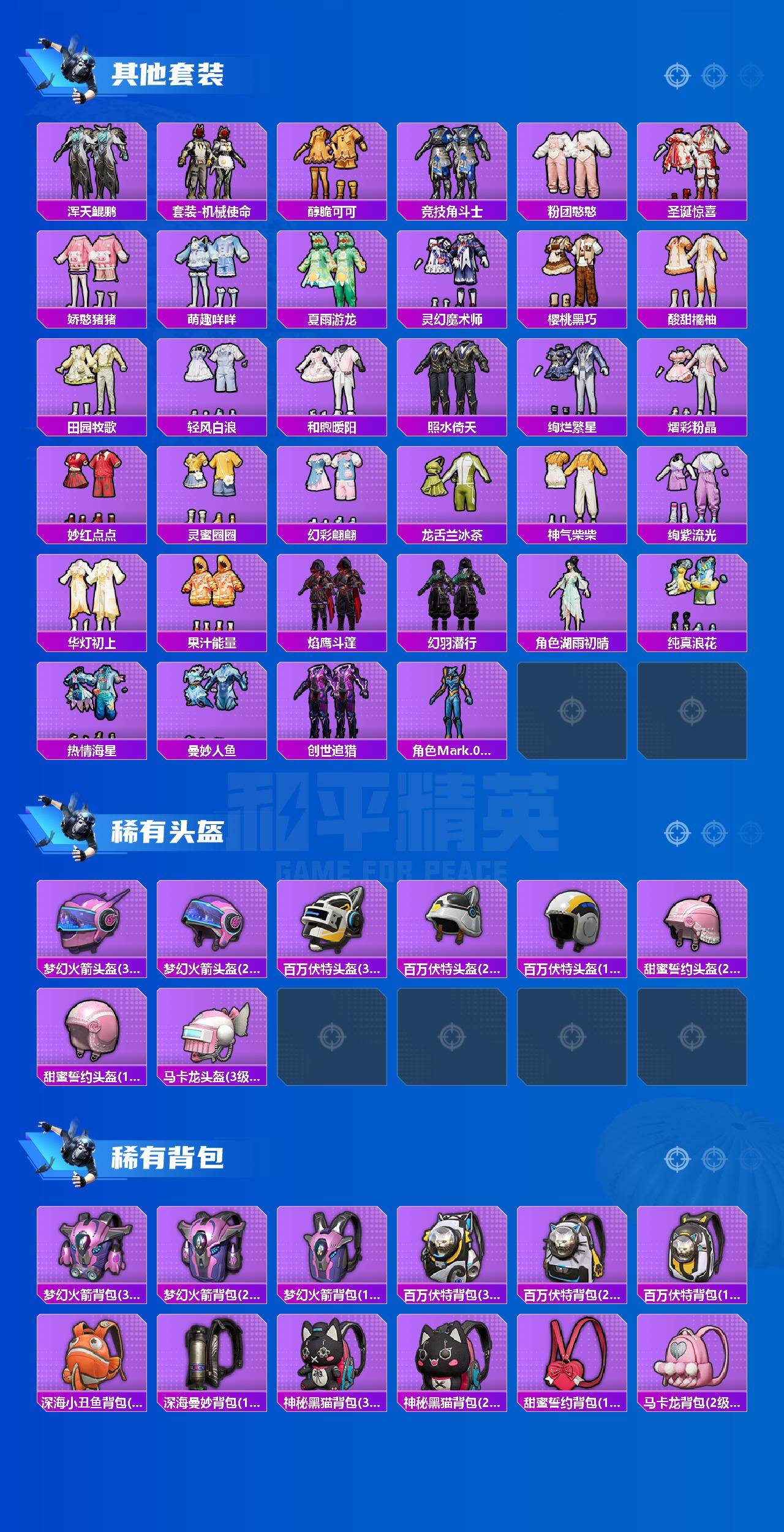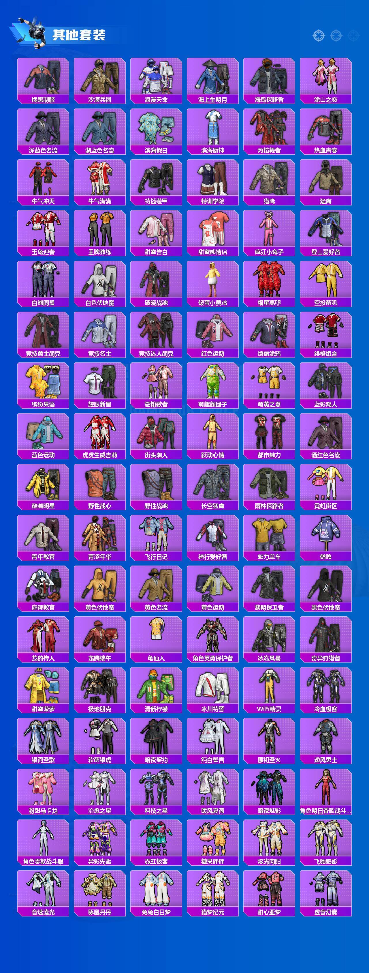 套装-梦幻火箭,套装-缤纷油彩,套装-奇异狩猎者,套装-胖达圆圆,套装-极限特训,角色-零号机款机体服,套装-筑梦精灵,套装-傲雪凌霜,套装-旋转彩虹,套装-霞光圣骑,套装-寒光使者,套装-青空秋雨,套装-海螺星光,套装-金丰海韵,套装-软萌银虎,兔兔白日梦套装