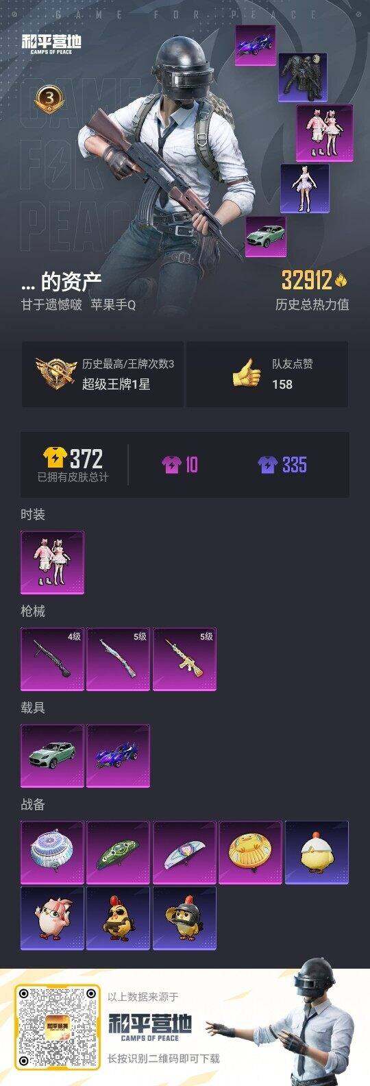 [15649790]【店主推荐捡漏号!可直接换绑】苹果 手Q-1粉装-3特效枪-2载具-0粉色飞行器-32912热力值-3王牌印记-86套装-113枪皮