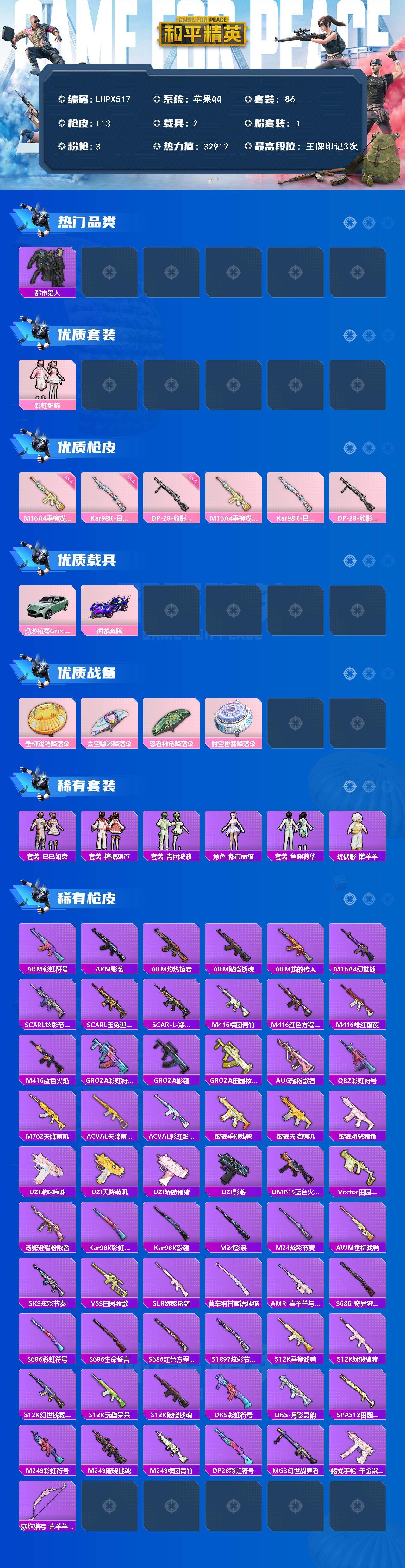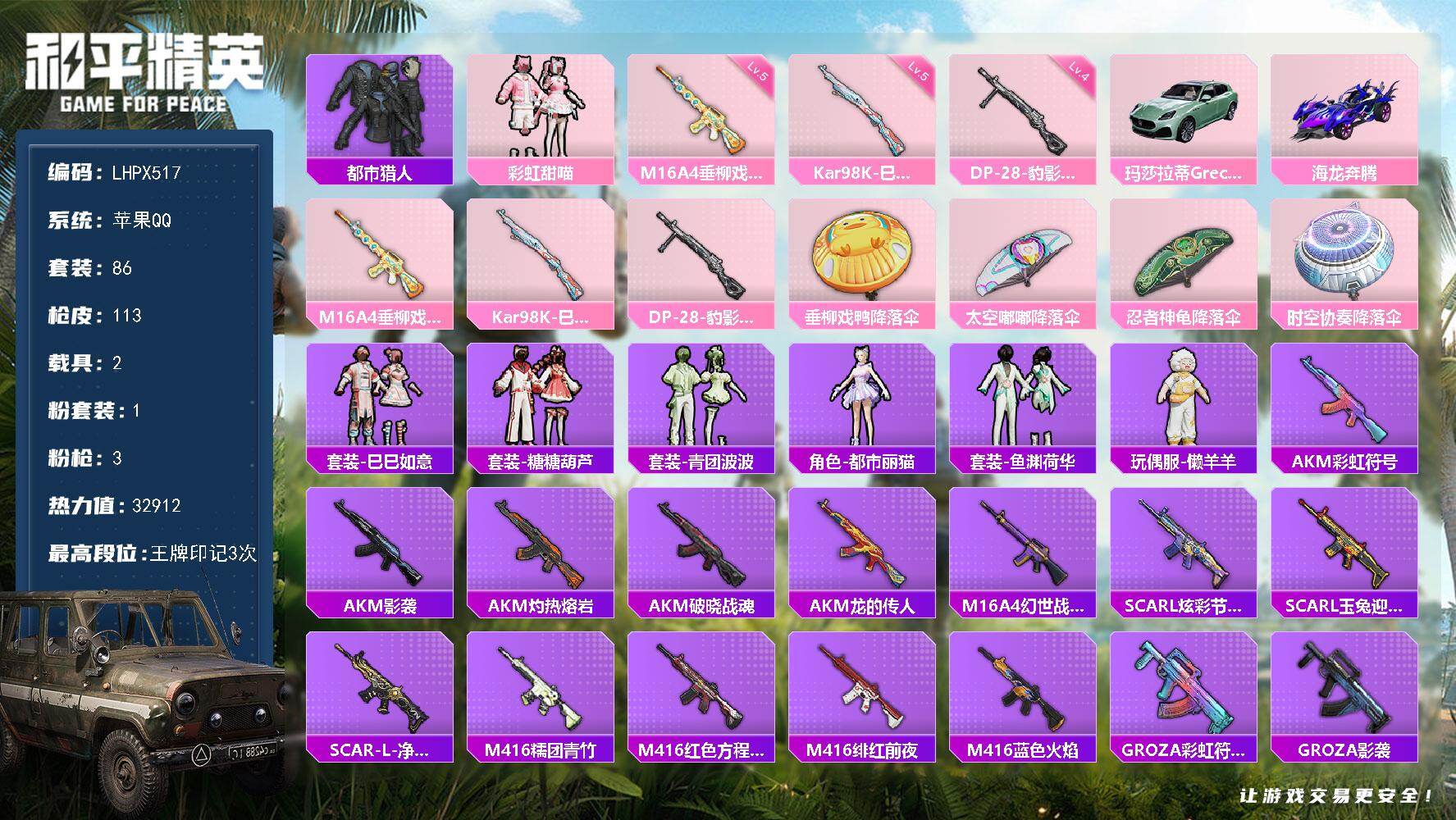 [15649790]【店主推荐捡漏号!可直接换绑】苹果 手Q-1粉装-3特效枪-2载具-0粉色飞行器-32912热力值-3王牌印记-86套装-113枪皮 【热门品类】:套装-都市猎人 【粉色套装】:粉装-彩虹甜喵 【粉色枪皮等级】:M16A4-垂柳戏鸭(五级),Kar98K-巳巳如意(五级),DP-28-豹影疾电(四级) 【粉色载具】:玛莎拉蒂Grecale(薄荷绿),海龙奔腾 【粉色枪皮】:M16A4-垂柳戏鸭,Kar98K-巳巳如意,DP-28-豹影疾电