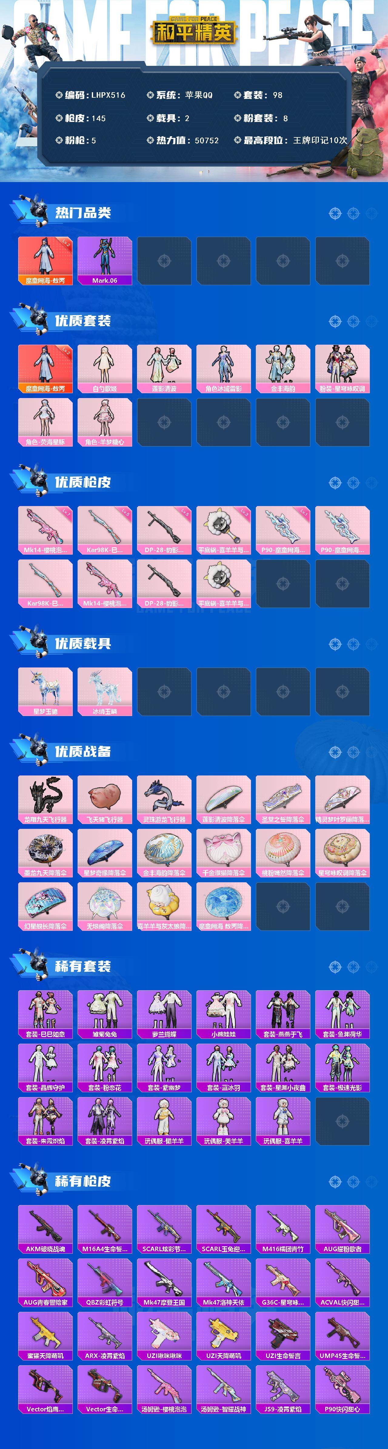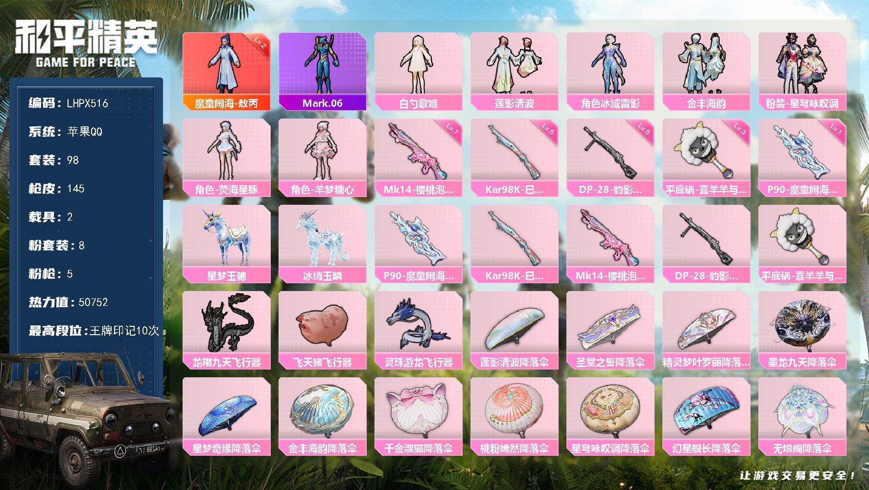 [15649782]【店主推荐捡漏号!可直接换绑】苹果 手Q-1神装-8粉装-5特效枪-2载具-4粉色飞行器-50752热力值-10王牌印记-98套装-145枪皮【红色神装等级】:魔童闹海-敖丙(二级)【红色角色神装】:魔童闹海-敖丙【热门品类】:角色-Mark.06【粉色套装】:角色-白勺歌姬,粉装-莲影清波,角色-冰域雷影,粉装-金丰海韵,粉装-星穹咏叹调,角色-荧海星豚,角色-羊梦糖心【粉色枪皮等级】:P90-魔童闹海 敖丙(一级),Kar98K-巳巳如意(五级),Mk14-樱桃泡泡(七级),DP-28-豹影疾电(五级),平底锅-喜羊羊与灰太狼(三级)【粉色载具】:星梦玉骢,冰绡玉鳞【粉色枪皮】:P90-魔童闹海 敖丙,Kar98K-巳巳如意,Mk14-樱桃泡泡,DP-28-豹影疾电,平底锅-喜羊羊与灰太狼【粉色飞行器】:龙翔九天飞行器,飞天猪飞行器,灵珠游龙飞行器