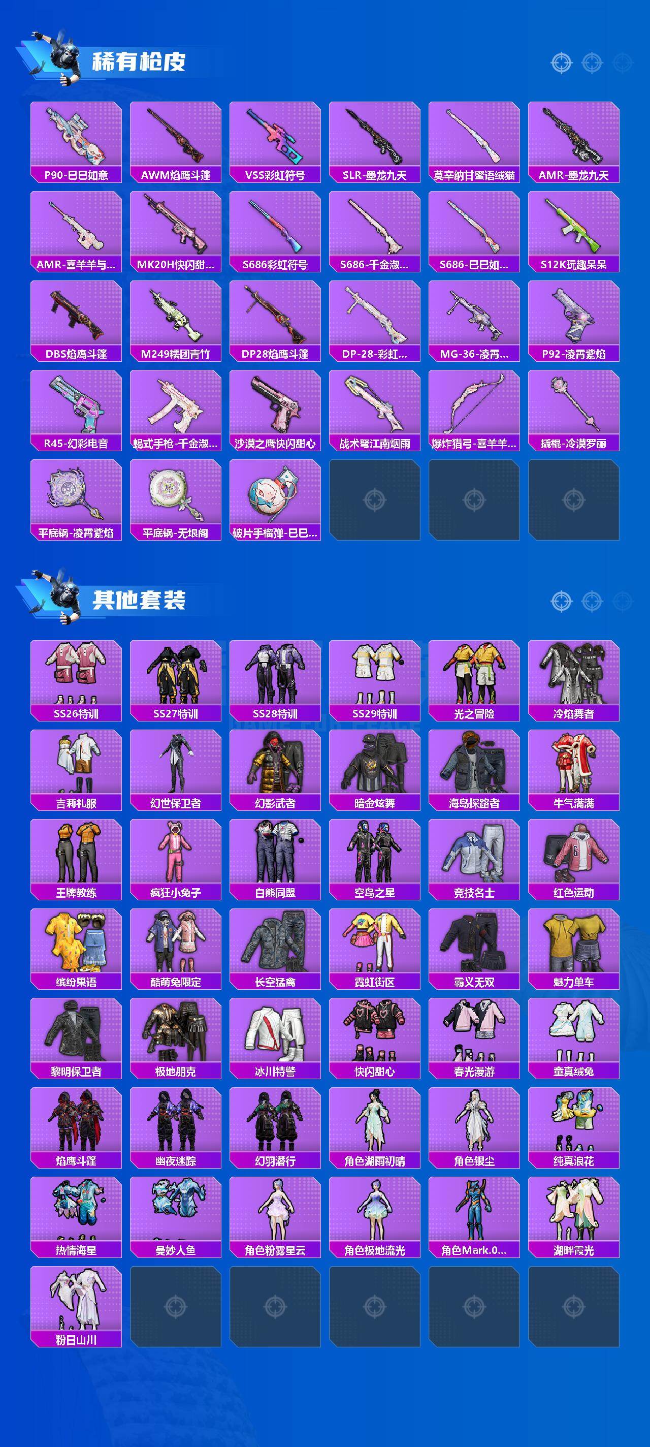 - [11605365]1红装 2粉装 1特效枪 可二次 可修改实名 优质装备:圣域龙灵-瑞拉,二级圣域龙灵-瑞拉(2级瑞拉),女娲灵识,智耀战神,AMR-智耀战神 三级特效枪:三级AMR-智耀战神 紫色装扮:SS3特训,SS5特训,冷焰舞者,北国孤狼,SS33特训套装,SS20特训,SS14特训,长空猛禽,雪山精英,缤纷果语,蓝彩潮人,蓝色守护者,绛羽幽主,魅力单车,沙漠兵团,海滨突袭者,坚韧舞者,夏日音浪,夜莺强袭者,完美偶像,帅气教官,怒火燎原,战地菁英,疯狂小兔子,白色伏地魔,破蛋小黄鸡,甜蜜告白,竞技勇士朋克,红色运动,灰色格斗者,热血青春,竞技名士,SS24特训(SS24特训套装),SS6特训,SS8特训,绒绒粉兔,粉恋花,蓝冰羽,紫幽梦,SS32特训服(SS32特训套装),猎影月神,青玉碎影,萌黄之夏 优质战备:智耀战神降落伞,圣域龙灵降落伞,圣域金龙飞行器