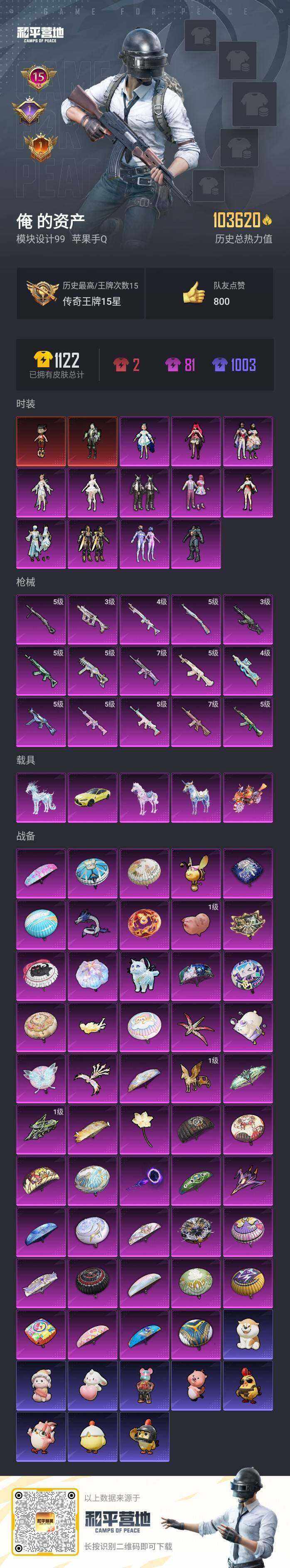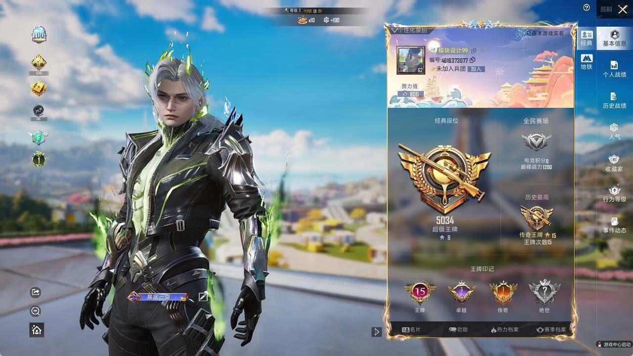 - PX_2085974-贵族等级: V5 英雄数: 117 皮肤数: 105 传说皮: 超时空战士-狄仁杰 限定皮: 武陵仙君,齐天大圣,鸣野蒿