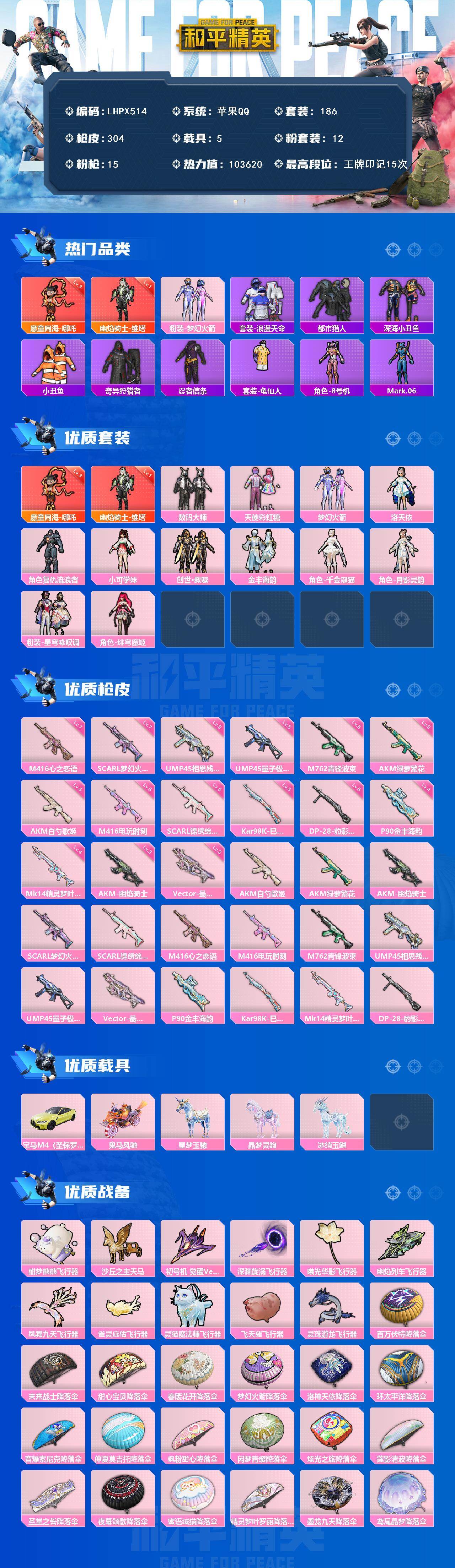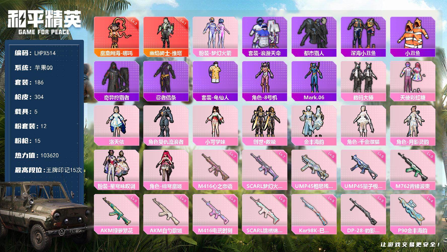 [15649816]【店主推荐捡漏号!可直接换绑】苹果 手Q-2神装-12粉装-15特效枪-5载具-13粉色飞行器-103620热力值-15王牌印记-186套装-304枪皮【红色神装等级】:魔童闹海-哪吒(三级),幽焰骑士-维塔(一级)【红色角色神装】:魔童闹海-哪吒,幽焰骑士-维塔【热门品类】:粉装-梦幻火箭,套装-浪漫天命,套装-都市猎人,套装-深海小丑鱼,套装-小丑鱼,套装-奇异狩猎者,套装-忍者信条,套装-龟仙人,角色-8号机,角色-Mark.06【粉色套装】:粉装-数码大师,粉装-天使彩虹糖,粉装-梦幻火箭,角色-洛天依,角色-复仇流浪者,角色-小可学妹,套装-创世·救赎,粉装-金丰海韵,角色-千金淑猫,角色-月影灵韵,粉装-星穹咏叹调,角色-绯穹魔姬【粉色枪皮等级】:AKM-白勺歌姬(五级),AKM-绿萝繁花(五级),AKM-幽焰骑士(三级),SCAR-L-梦幻火箭(七级),SCAR-L-锦绣绵绵(五级),M416-心之恋语(七级),M416-电玩时刻(五级),M762-青锋波束(五级),UMP45-相思残雪(五级),UMP45-量子极限(五级),Vector-最终圣卫者(三级),P90-金丰海韵(四级),Kar98K-巳巳如意(五级),Mk14-精灵梦叶罗丽(四级),DP-28-豹影疾电(五级)【粉色载具】:宝马M4(圣保罗黄),鬼马风驰,星梦玉骢,晶梦灵驹,冰绡玉鳞【粉色枪皮】:AKM-白勺歌姬,AKM-绿萝繁花,AKM-幽焰骑士,SCAR-L-梦幻火箭,SCAR-L-锦绣绵绵,M416-心之恋语,M416-电玩时刻,M762-青锋波束,UMP45-相思残雪,UMP45-量子极限,Vector-最终圣卫者,P90-金丰海韵,Kar98K-巳巳如意,Mk14-精灵梦叶罗丽,DP-28-豹影疾电【粉色飞行器】:酣梦熊熊飞行器,沙丘之主天马,初号机 觉醒Ver.飞行器,深渊漩涡飞行器,曦光华影飞行器,幽焰列车飞行器,凤舞九天飞行器,雀灵庇佑飞行器,灵猫魔法师飞行器,飞天猪飞行器,灵珠游龙飞行器