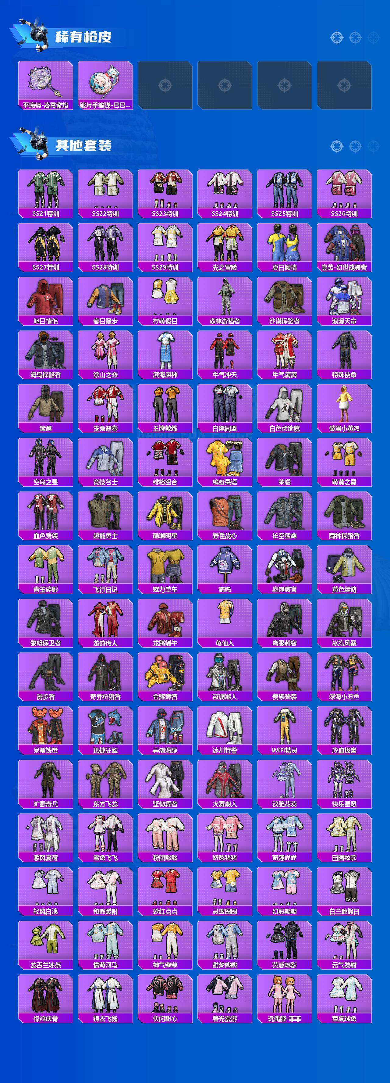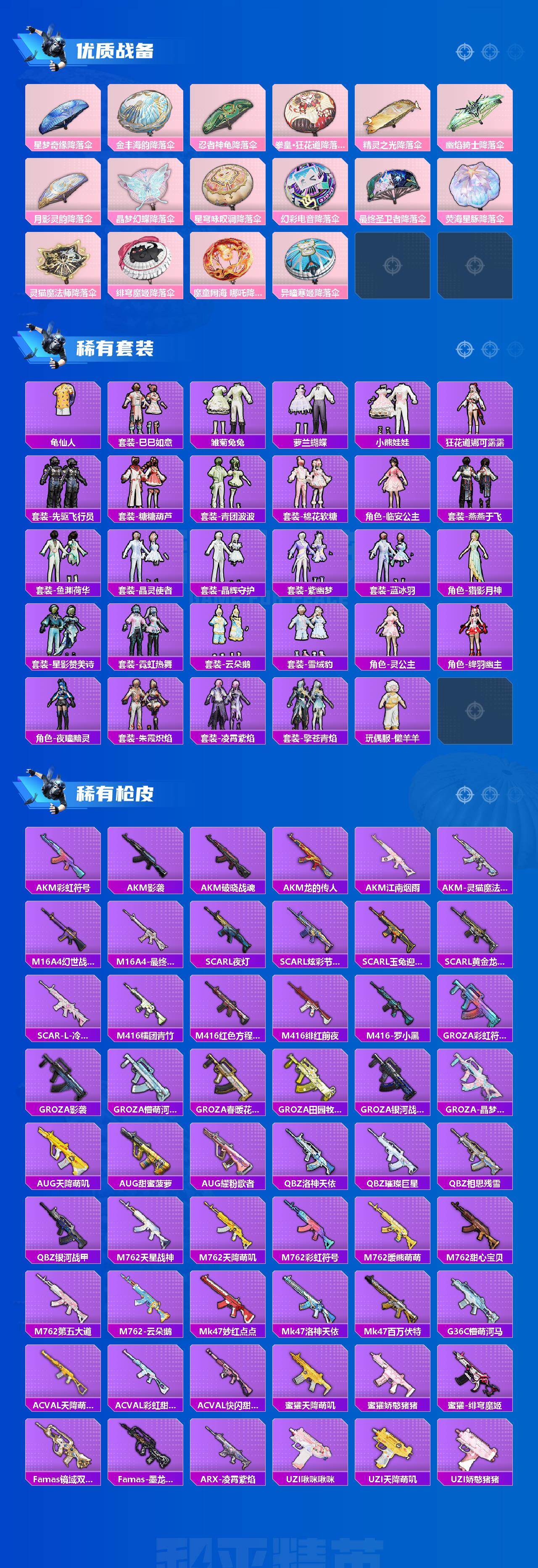 AKM-白勺歌姬,AKM-绿萝繁花,AKM-幽焰骑士,SCAR-L-梦幻火箭,SCAR-L-锦绣绵绵,M416-心之恋语,M416-电玩时刻,M762-青锋波束,UMP45-相思残雪,UMP45-量子极限,P90-金丰海韵,Kar98K-巳巳如意,Mk14-精灵梦叶罗丽