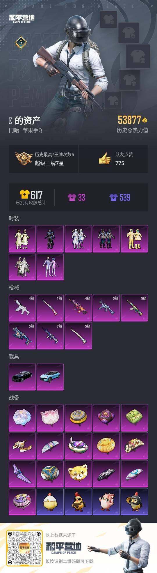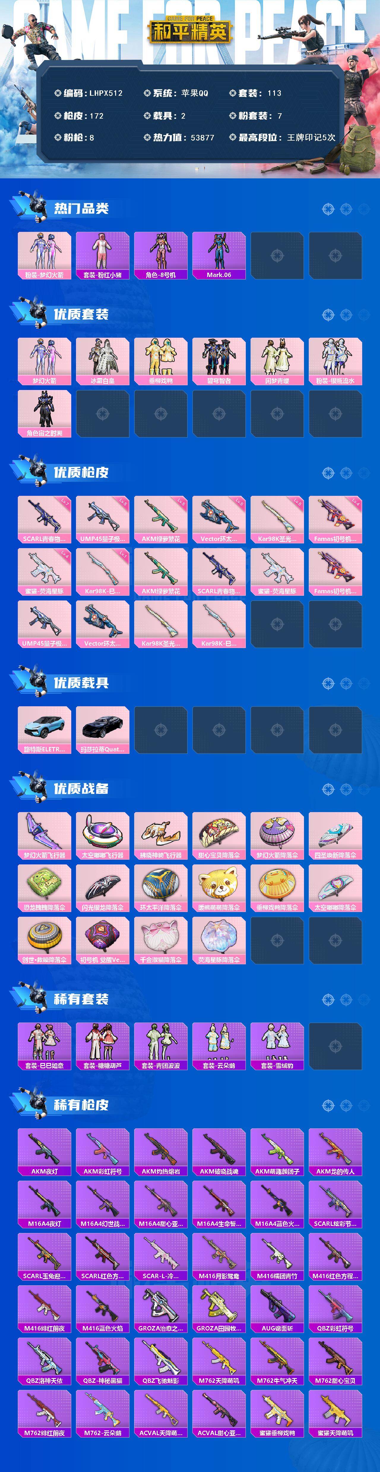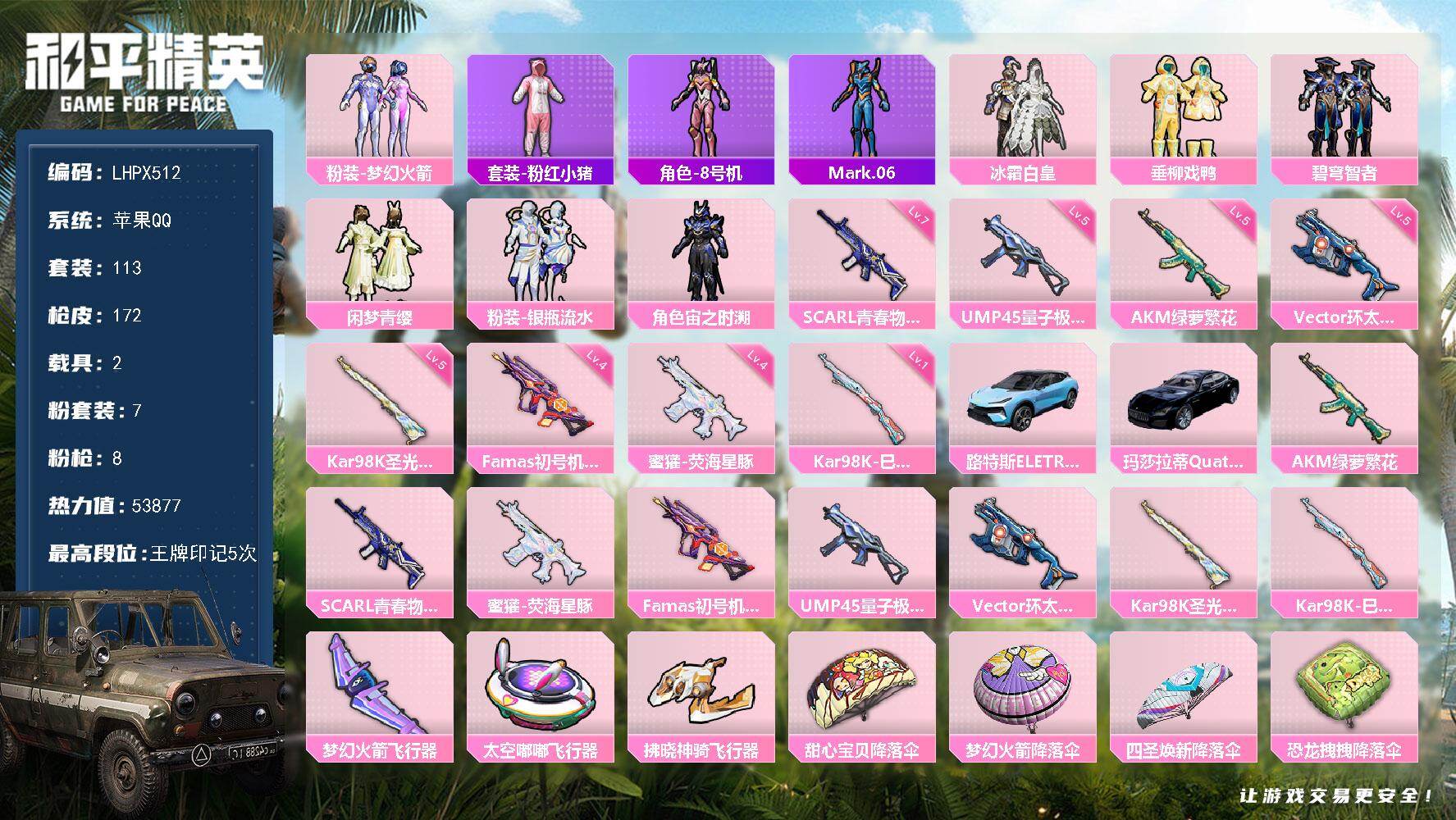 [15649819]【店主推荐捡漏号!可直接换绑】苹果 手Q-7粉装-8特效枪-2载具-3粉色飞行器-53877热力值-5王牌印记-113套装-172枪皮【热门品类】:粉装-梦幻火箭,套装-粉红小猪,角色-8号机,角色-Mark.06【粉色套装】:粉装-梦幻火箭,粉装-冰霜白皇,粉装-垂柳戏鸭,粉装-碧穹智者,粉装-闲梦青缨,粉装-银瓶流水,角色-宙之时溯【粉色枪皮等级】:AKM-绿萝繁花(五级),SCAR-L-青春物语(七级),蜜獾-荧海星豚(四级),Famas-初号机 觉醒Ver.(四级),UMP45-量子极限(五级),Vector-环太平洋(五级),Kar98K-圣光天使(五级),Kar98K-巳巳如意(一级)【粉色载具】:路特斯ELETRE(冰川蓝),玛莎拉蒂Quattroporte(夜幕蓝)【粉色枪皮】:AKM-绿萝繁花,SCAR-L-青春物语,蜜獾-荧海星豚,Famas-初号机 觉醒Ver.,UMP45-量子极限,Vector-环太平洋,Kar98K-圣光天使,Kar98K-巳巳如【粉色飞行器】:梦幻火箭飞行器,太空嘟嘟飞行器,拂晓神骑飞行器