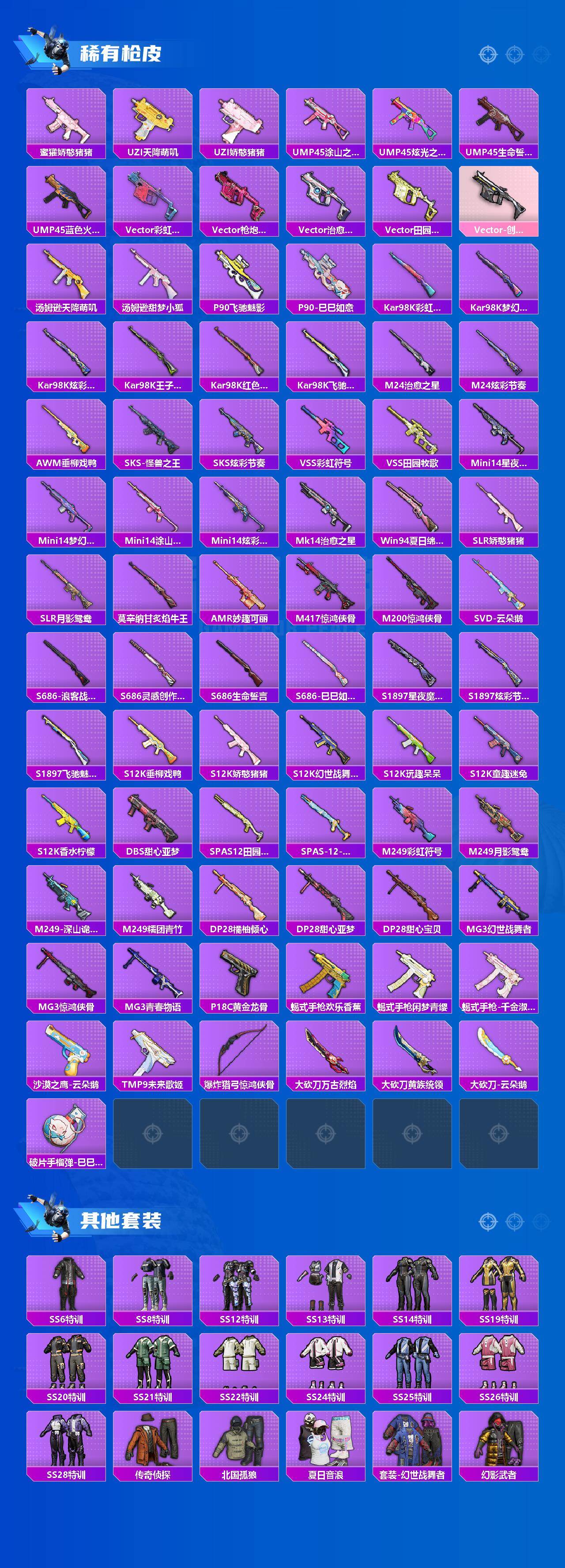 AKM-绿萝繁花,SCAR-L-青春物语,Famas-觉醒初号机,UMP45-量子极限,Vector-环太平洋,Kar98K-圣光天使,Kar98K-巳巳如意